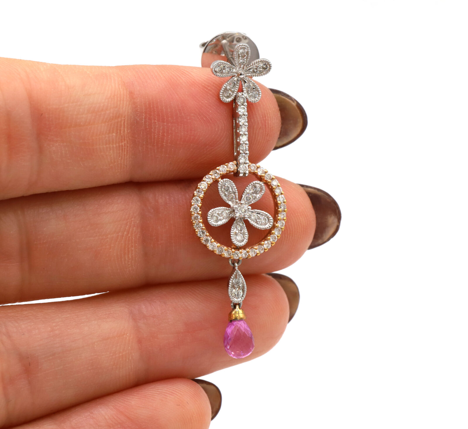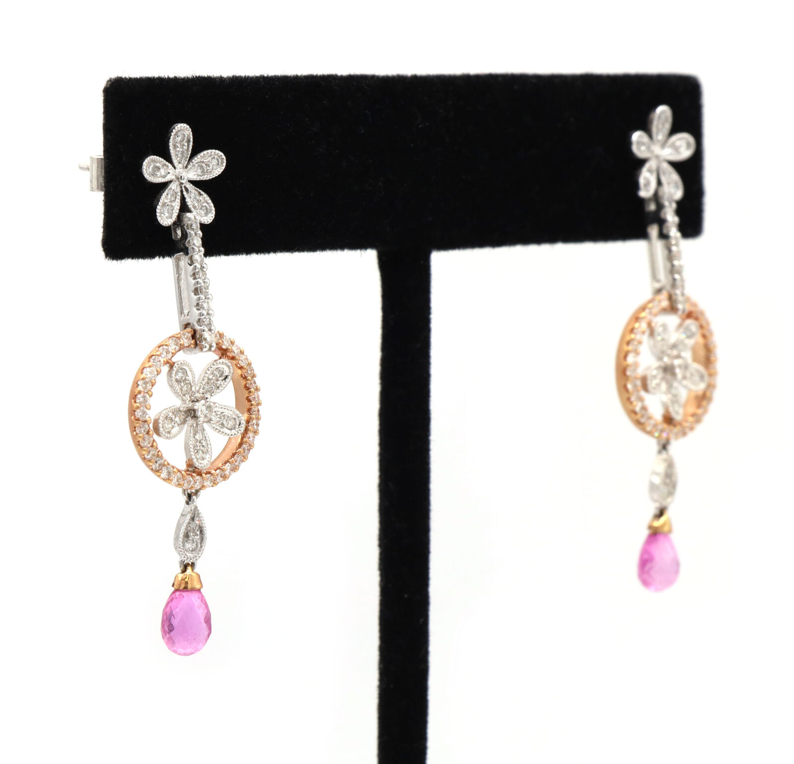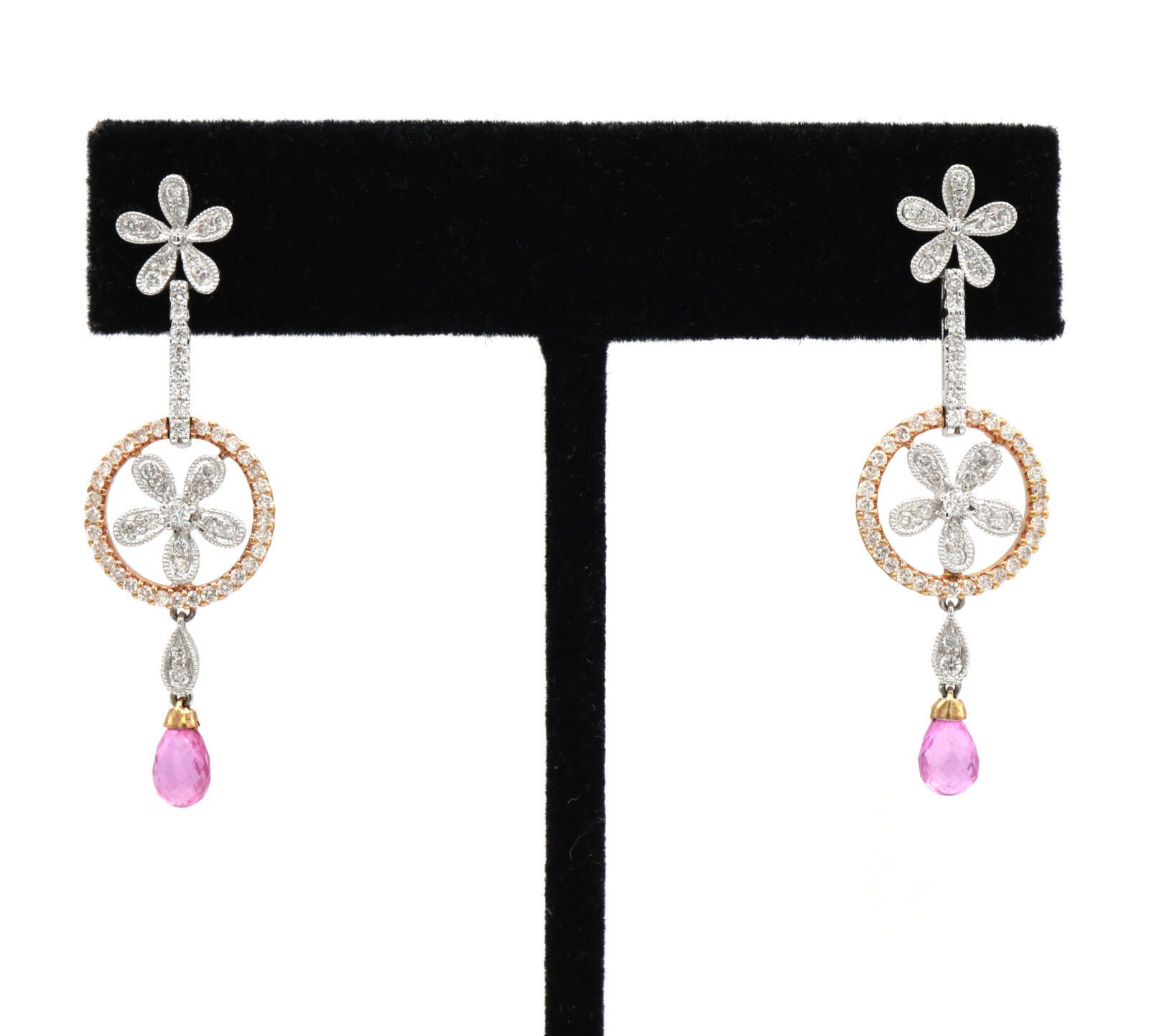Material: 18k Rose and White Gold Gemstone: Pink Sapphire and Diamond Pink Sapphire Cut: Briolette Diamond Cut: Round Brilliant Diamond Carat Weight: 0.75 Carat Diamond Clarity/Color: F/VS1 Earring Measurements: 40 x 13 mm Weight: 6.75 Grams