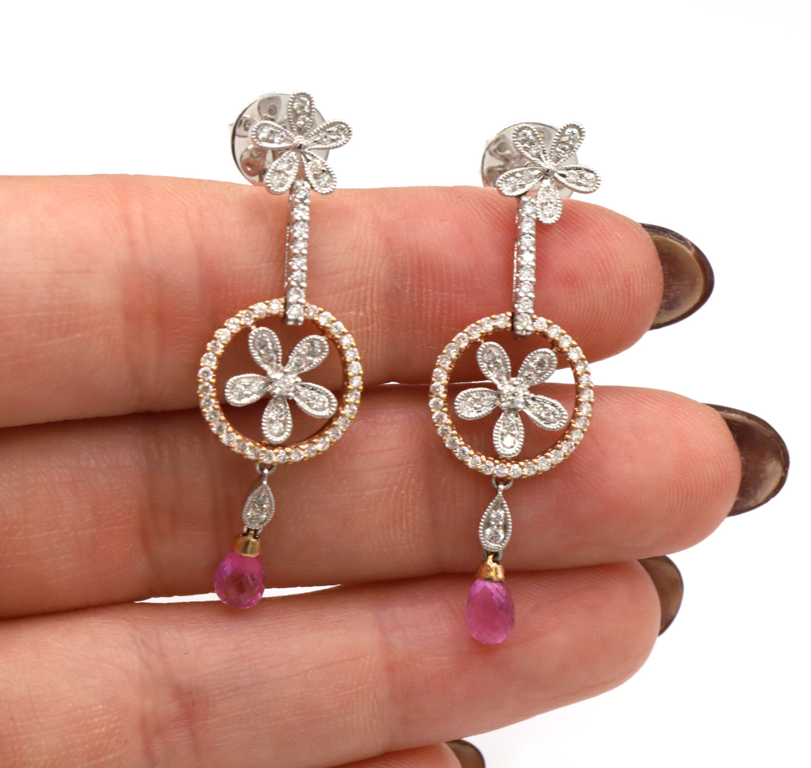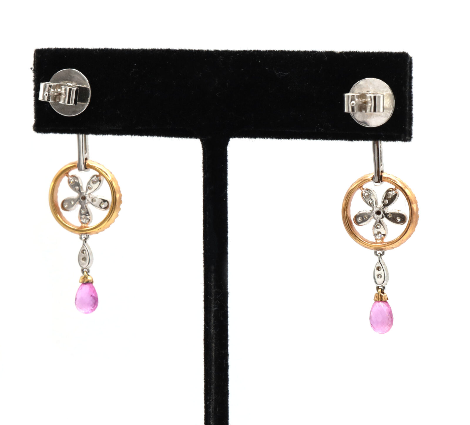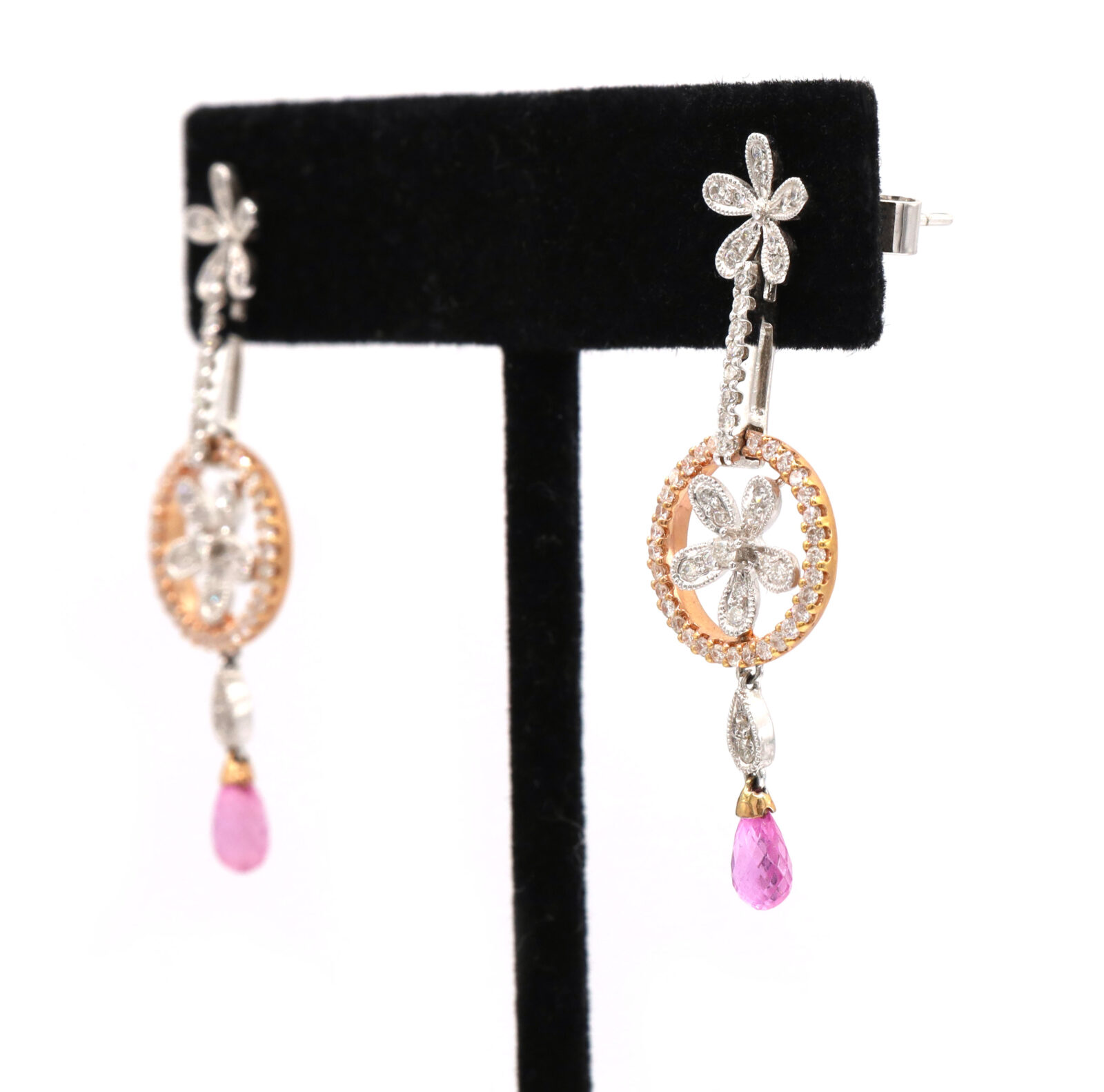 Material: 18k Rose and White Gold Gemstone: Pink Sapphire and Diamond Pink Sapphire Cut: Briolette Diamond Cut: Round Brilliant Diamond Carat Weight: 0.75 Carat Diamond Clarity/Color: F/VS1 Earring Measurements: 40 x 13 mm Weight: 6.75 Grams