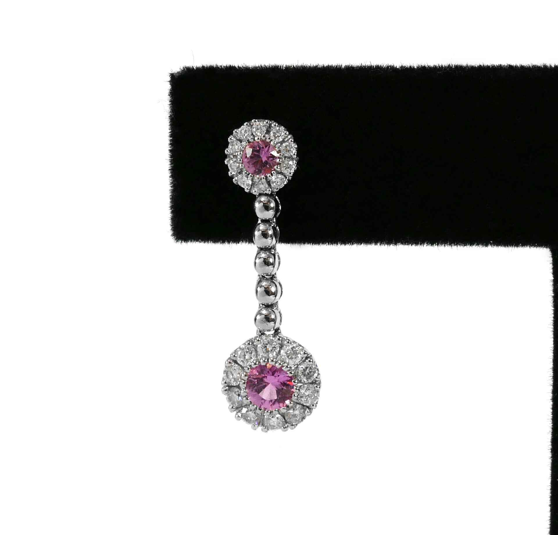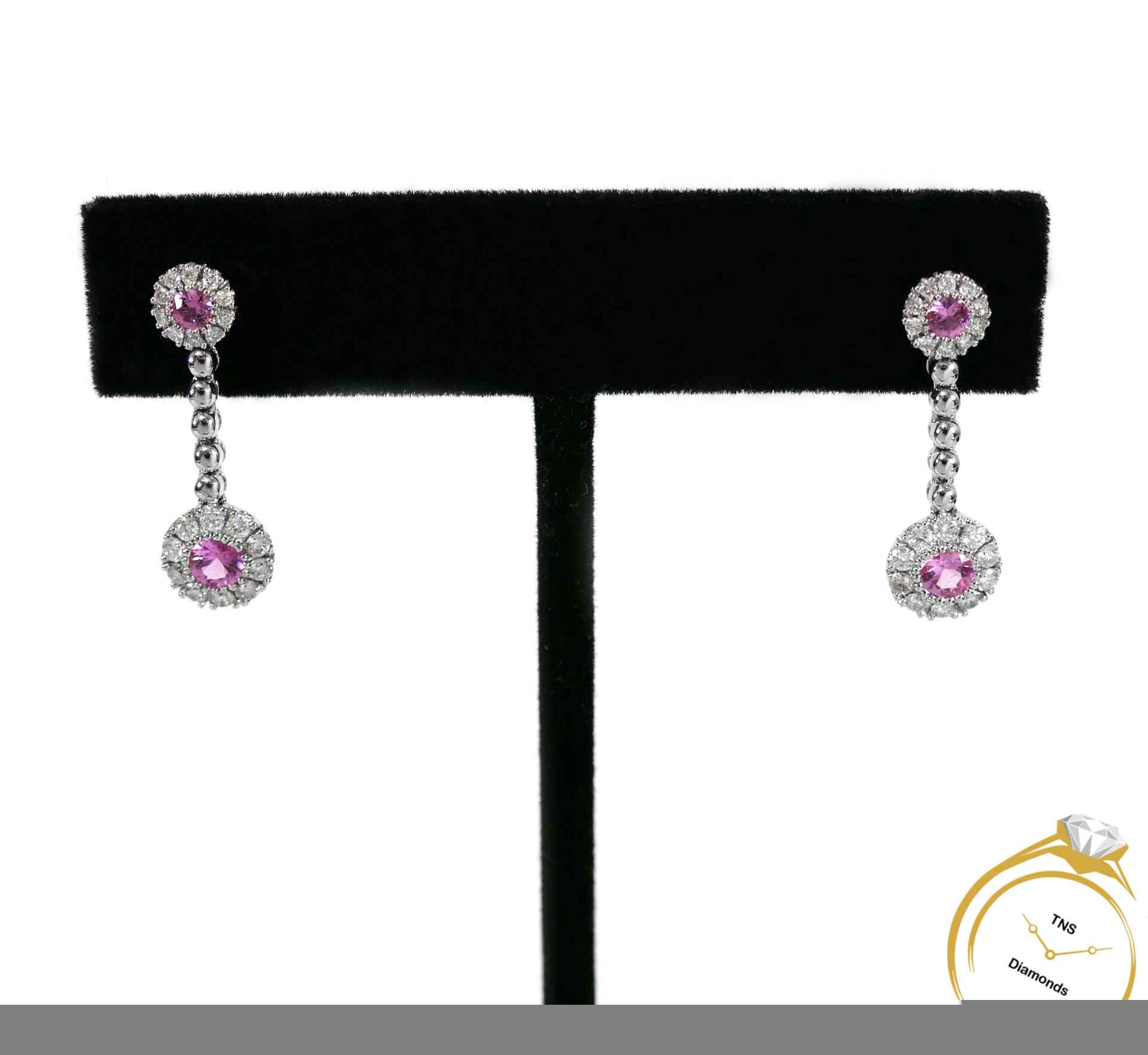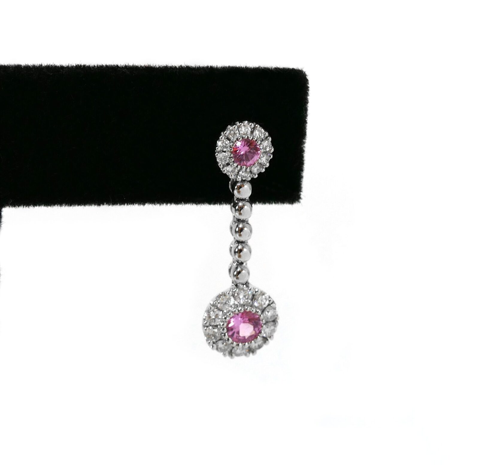Product Description: These magnificent earrings feature a natural and vibrant pink sapphire with a diamond halo around them, all set into 18k white gold. They hold four pink sapphires totaling to .79 carats, and...