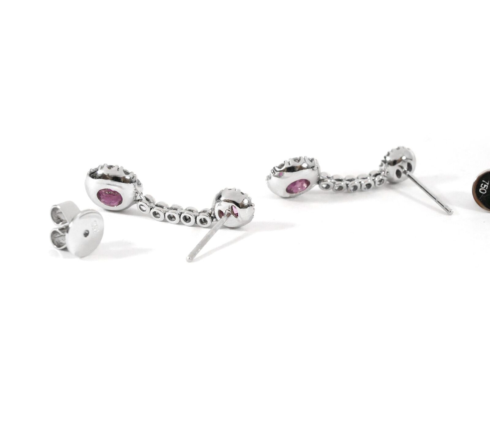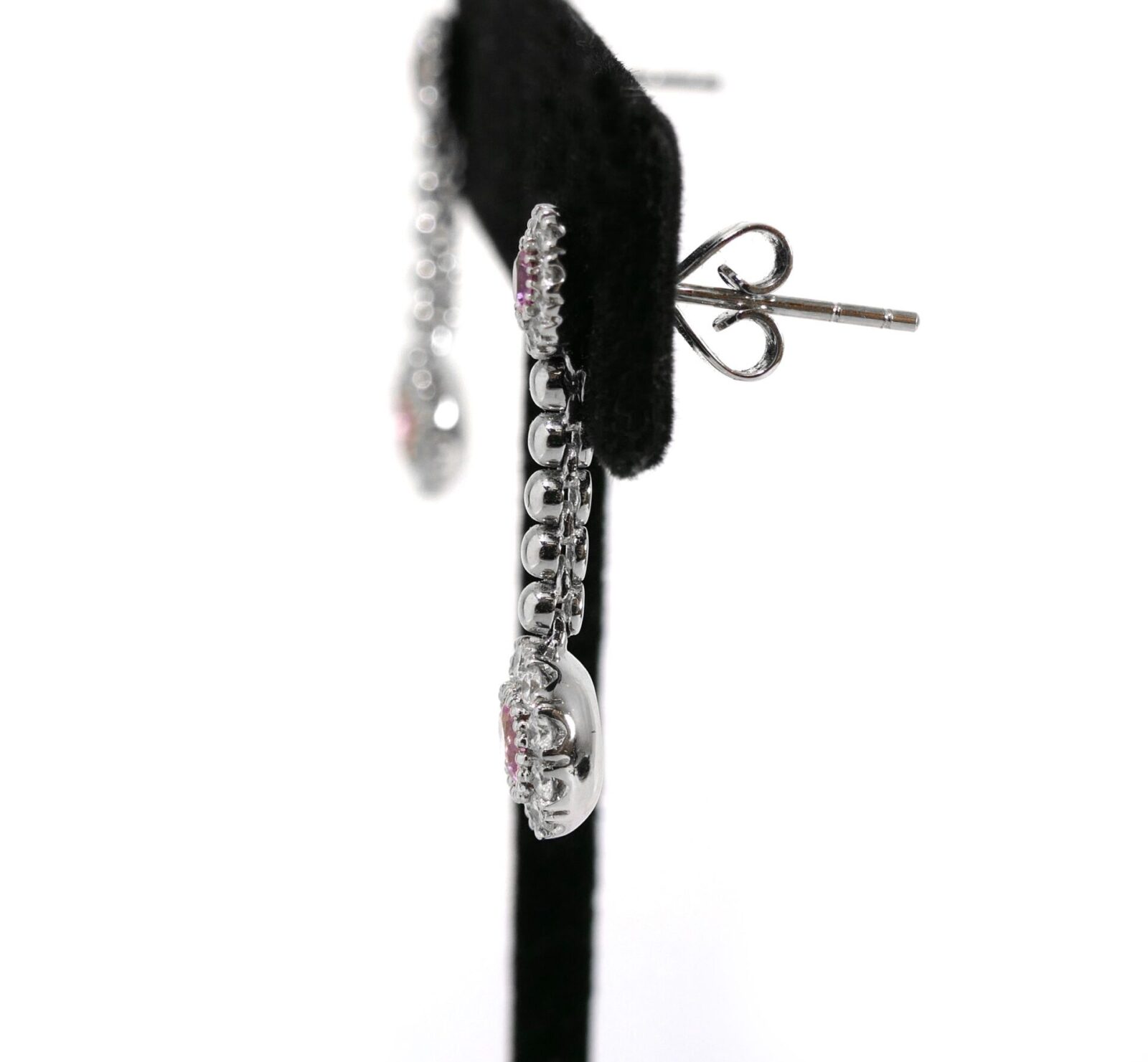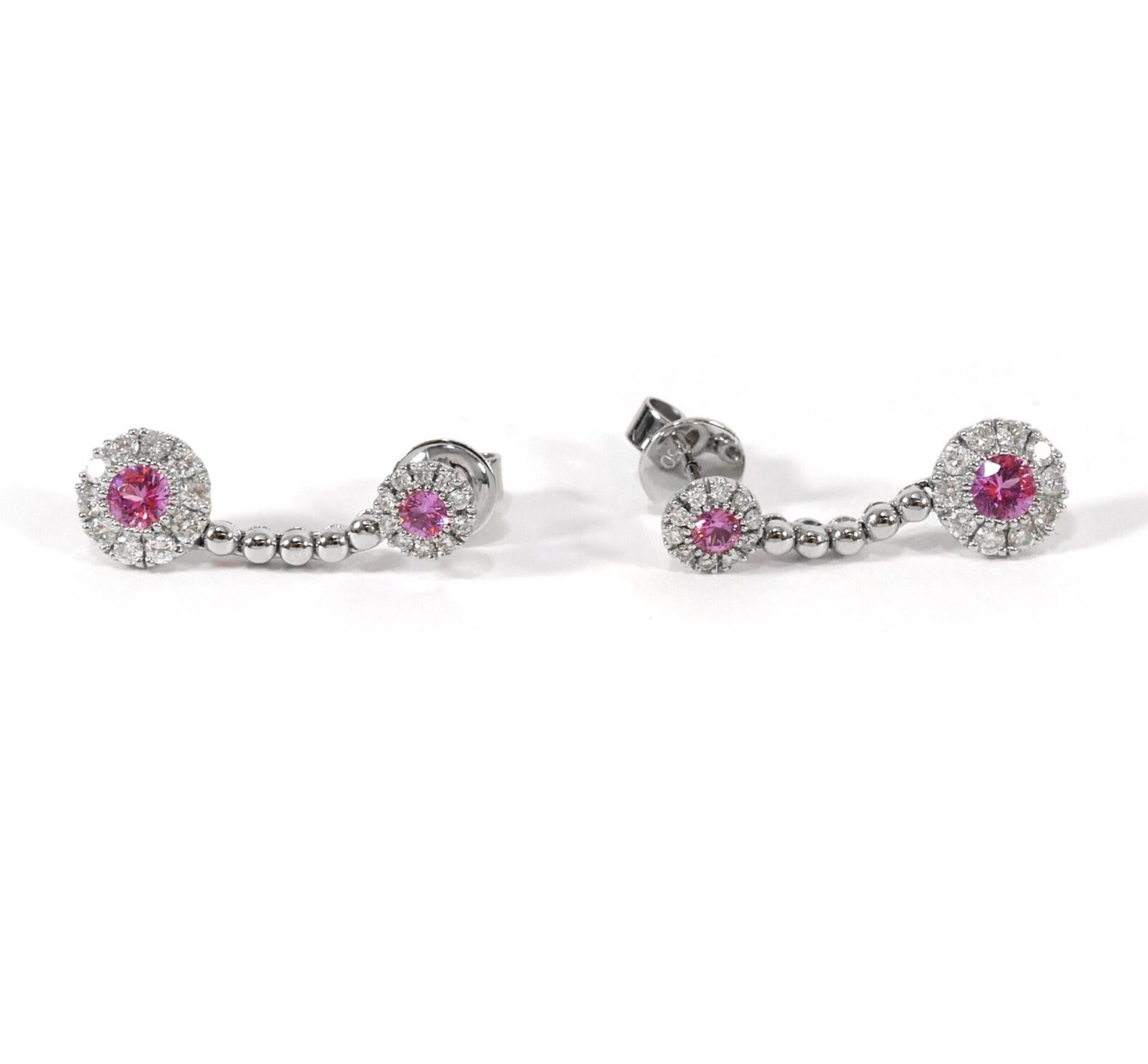 Product Description: These magnificent earrings feature a natural and vibrant pink sapphire with a diamond halo around them, all set into 18k white gold. They hold four pink sapphires totaling to .79 carats, and...