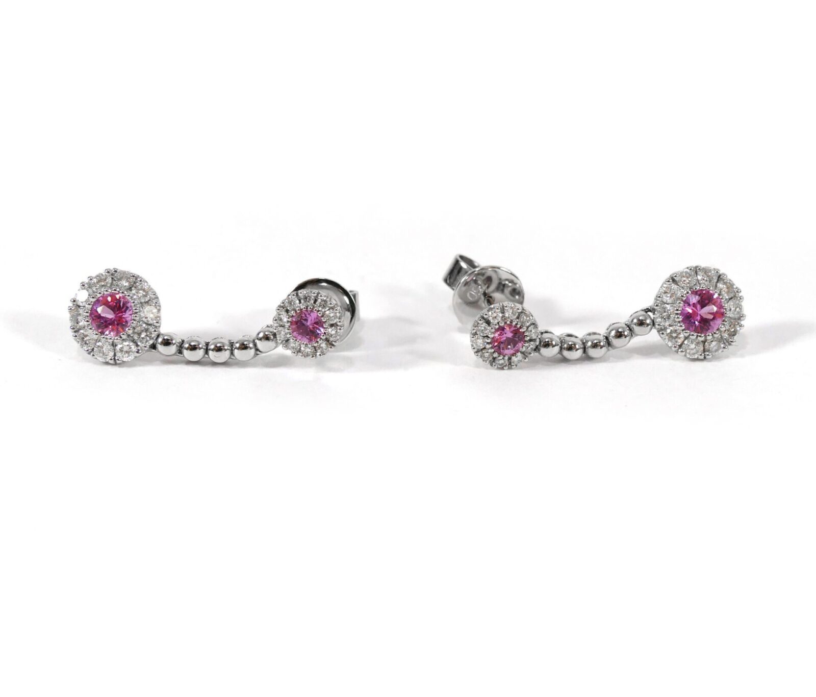 these magnificent earrings feature a natural and vibrant pink sapphire with a diamond halo around them, all set into 18k white gold. They hold four pink sapphires totaling to .79 carats, and 40 diamonds totaling to .59 carats.