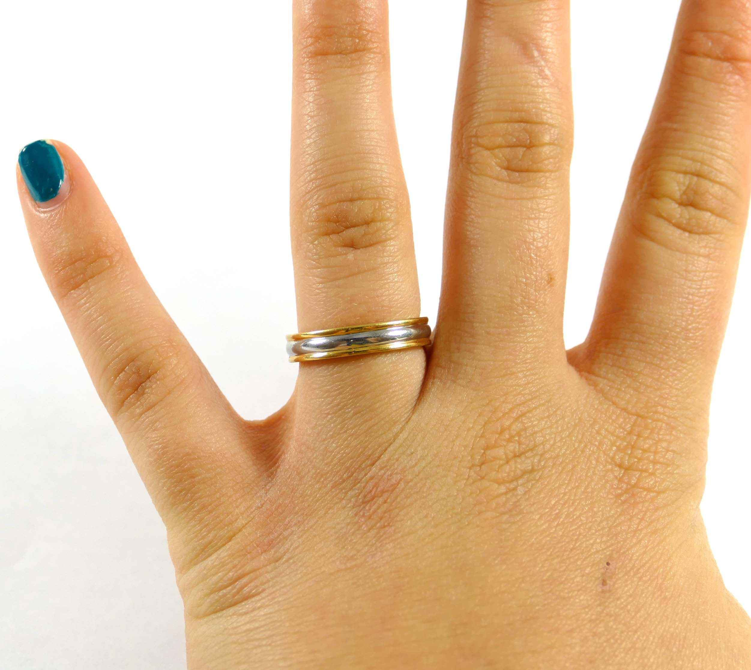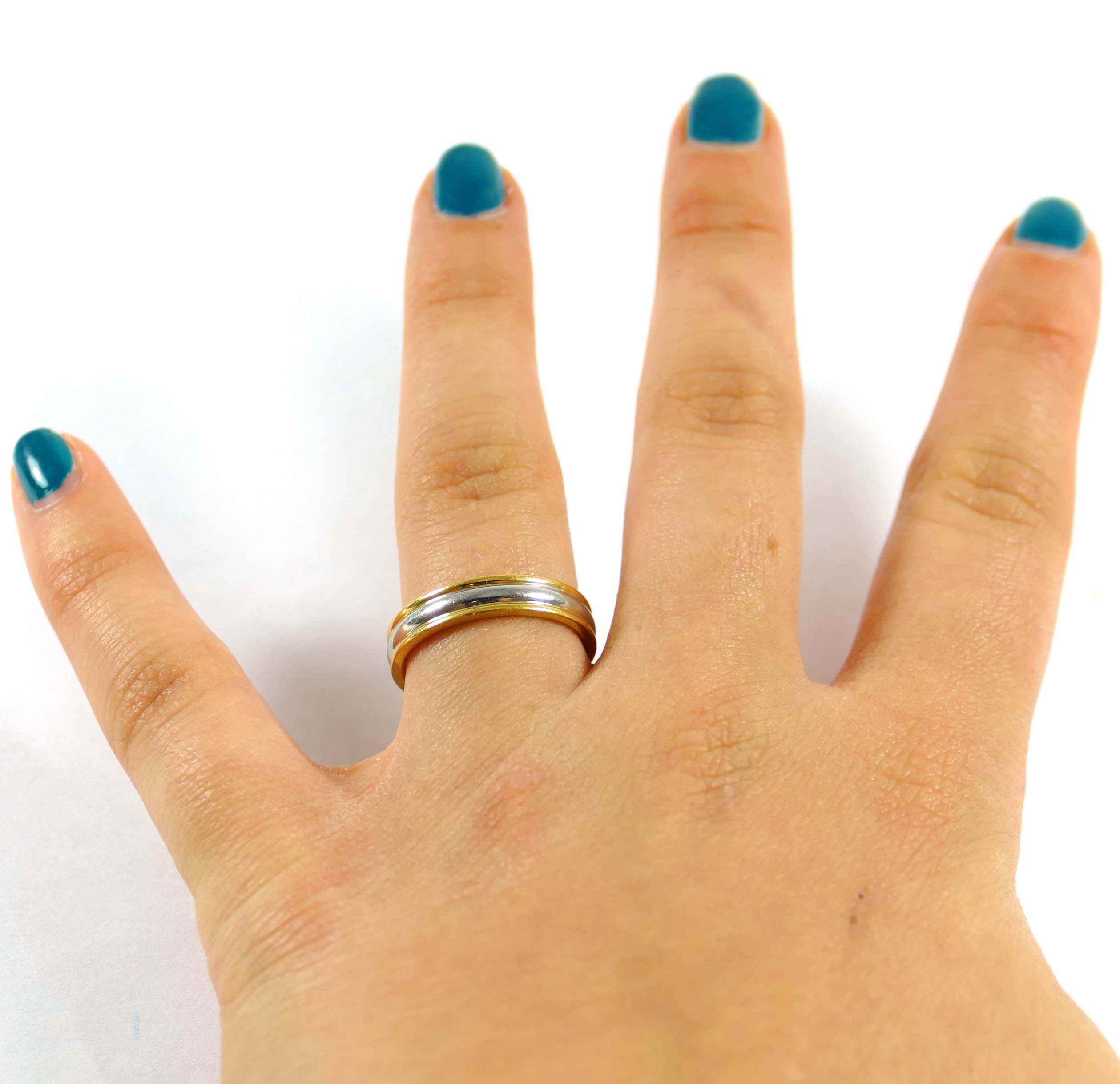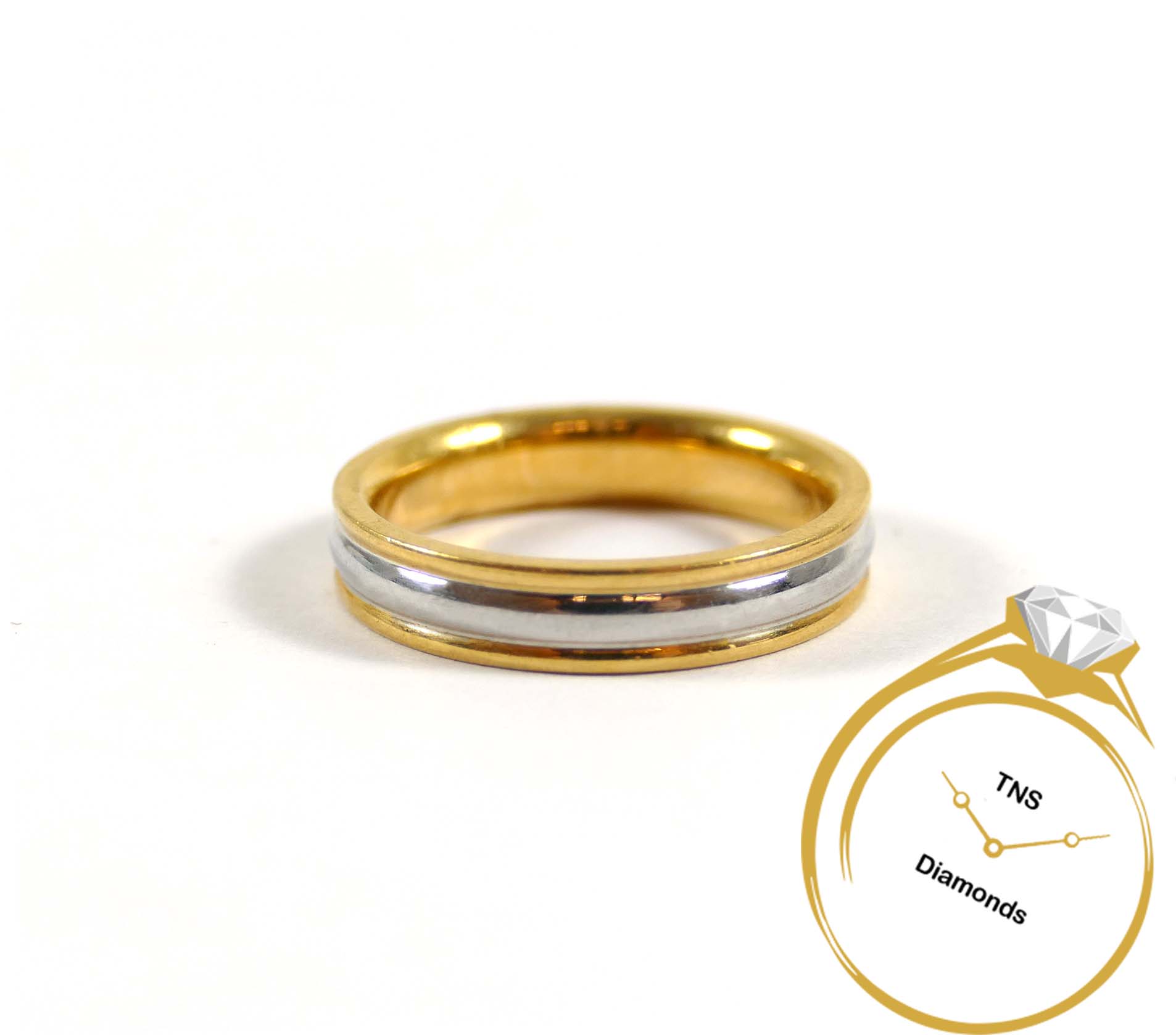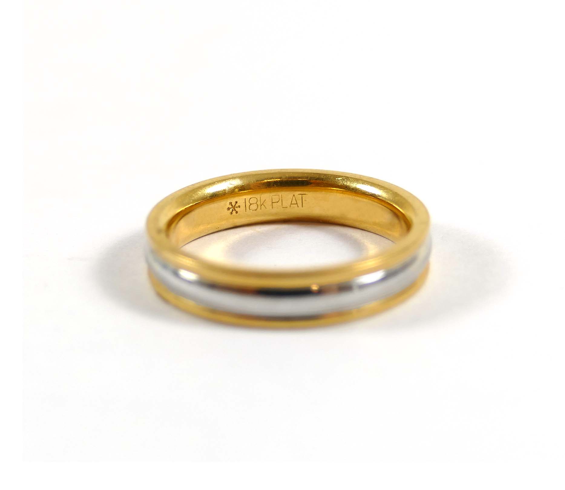 Product Description: Half gold, half platinum, this ring is classy and stylish! The gold is a hefty 18k, and set on the top and bottom of a layer of solid platinum. It's a perfect width, and comfortable to wear....