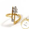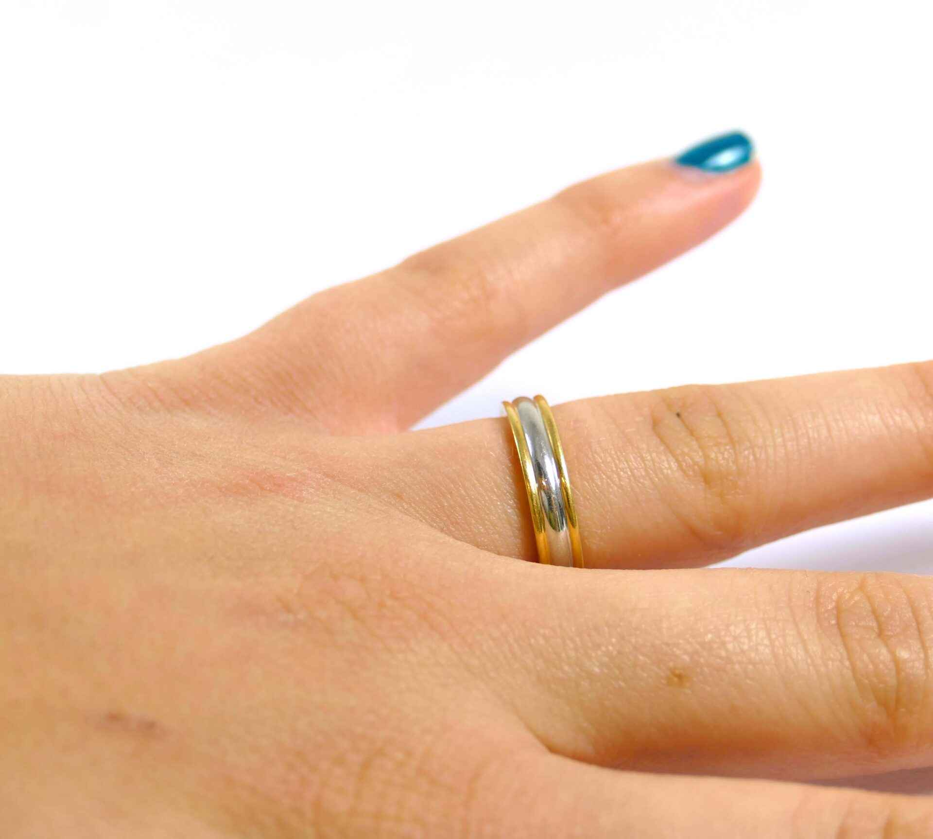 half gold, half platinum, this ring is classy and stylish! the gold is a hefty 18k, and set on the top and bottom of a layer of solid platinum. It’s a perfect width, and comfortable to wear. Gift this ring or wear it yourself!