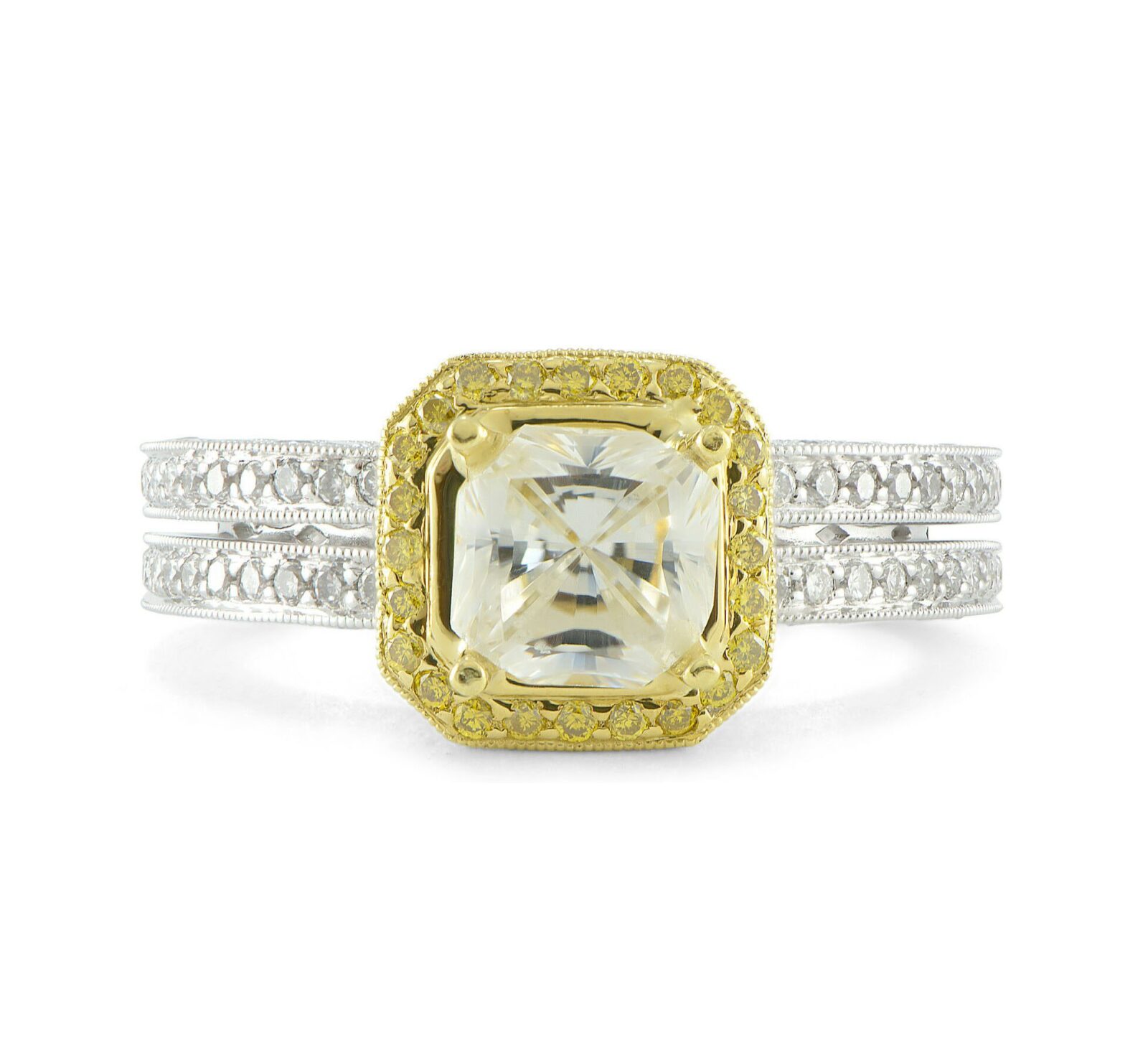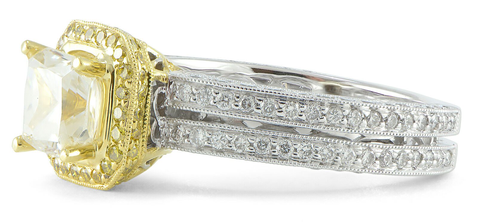 this beautiful 18 karat white gold and yellow gold, semi-mount engagement ring features bead set diamonds along the sides of the center setting. Notice how the side diamonds are placed on a double band. The side diamonds are .82 carats total weight. The halo surrounding the center stone is filled with yellow diamonds that total to .28 carats.
