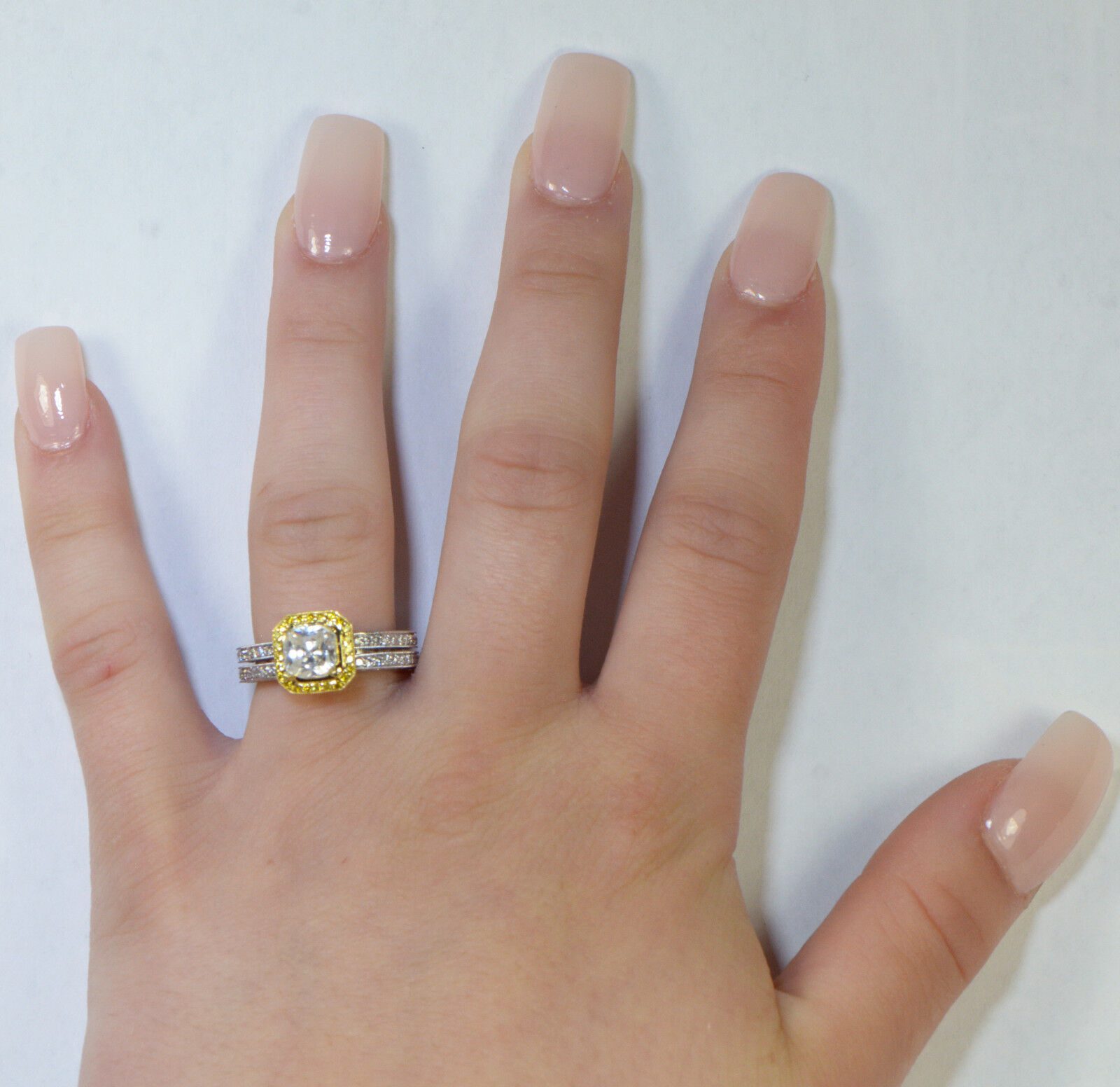 condition: new gender: women’s jewelry brand: fine jewelry jewelry type: ring weight (grams): 6.62g material: 18k white/yellow gold ring main stone: cz ring main stone carat: ring main stone clarity: ring main stone color: ring main stone cut: princess ring surrounding stone approximate total carat weight: .1.1ct ring surrounding stone clarity: vs ring surrounding stone color: f ring surrounding stone material: diamond