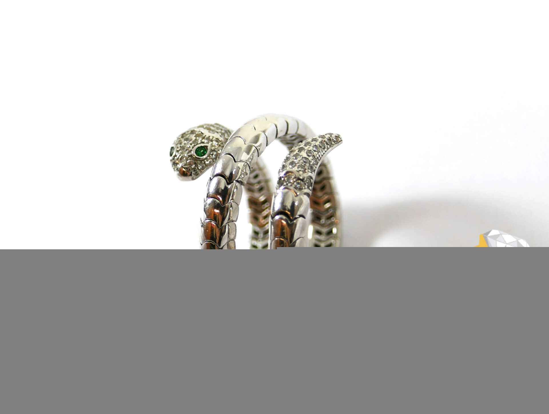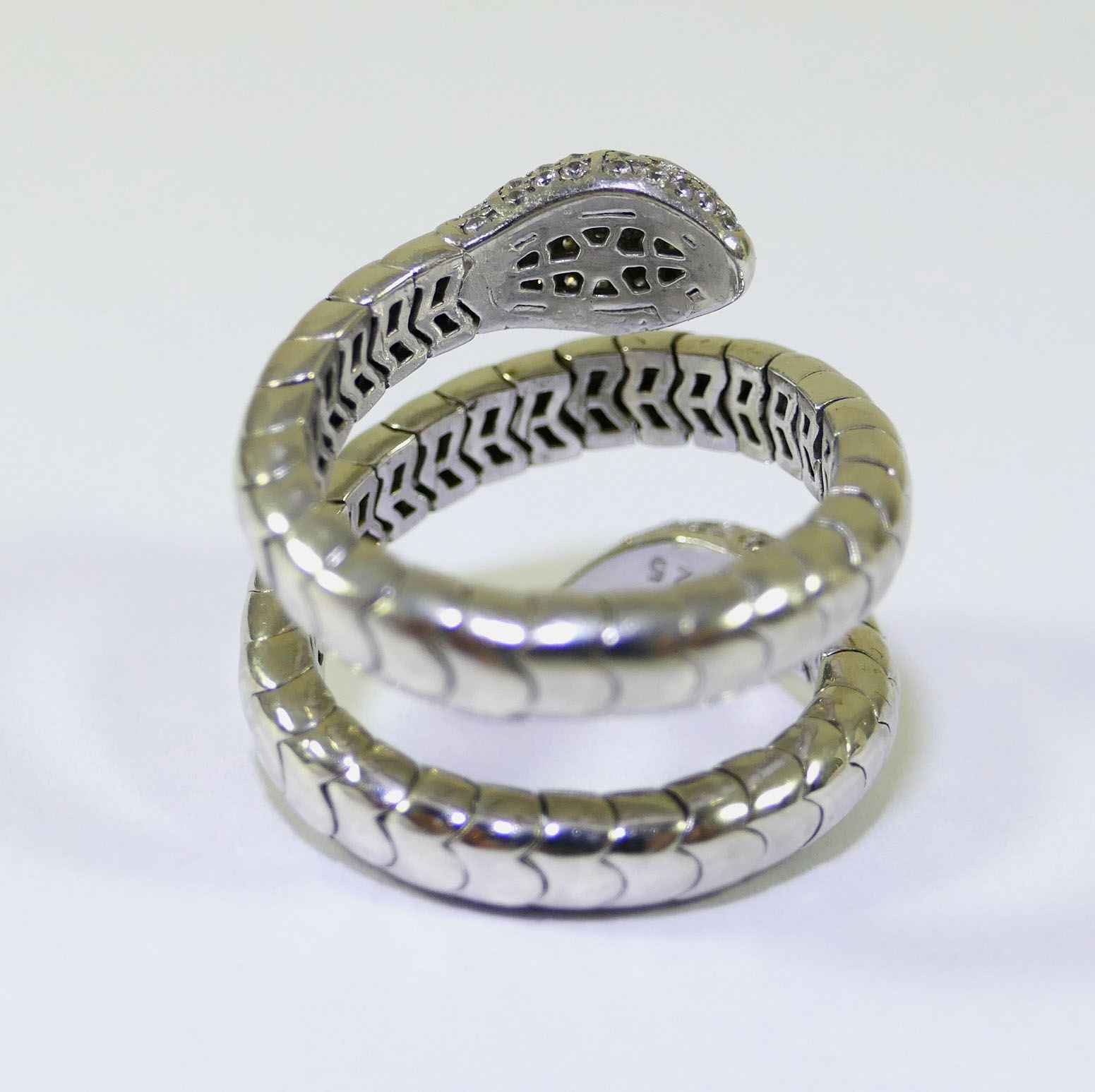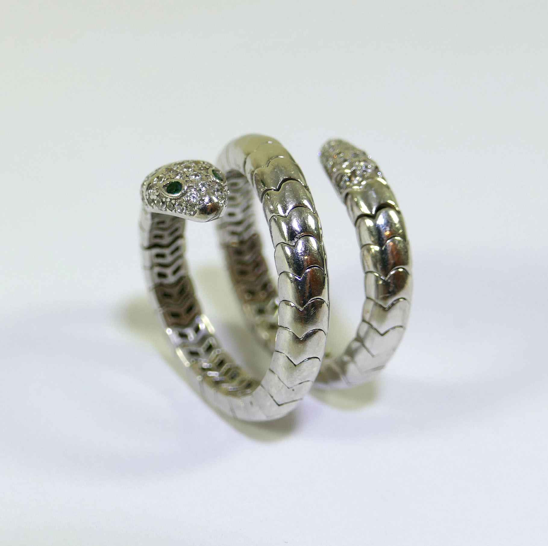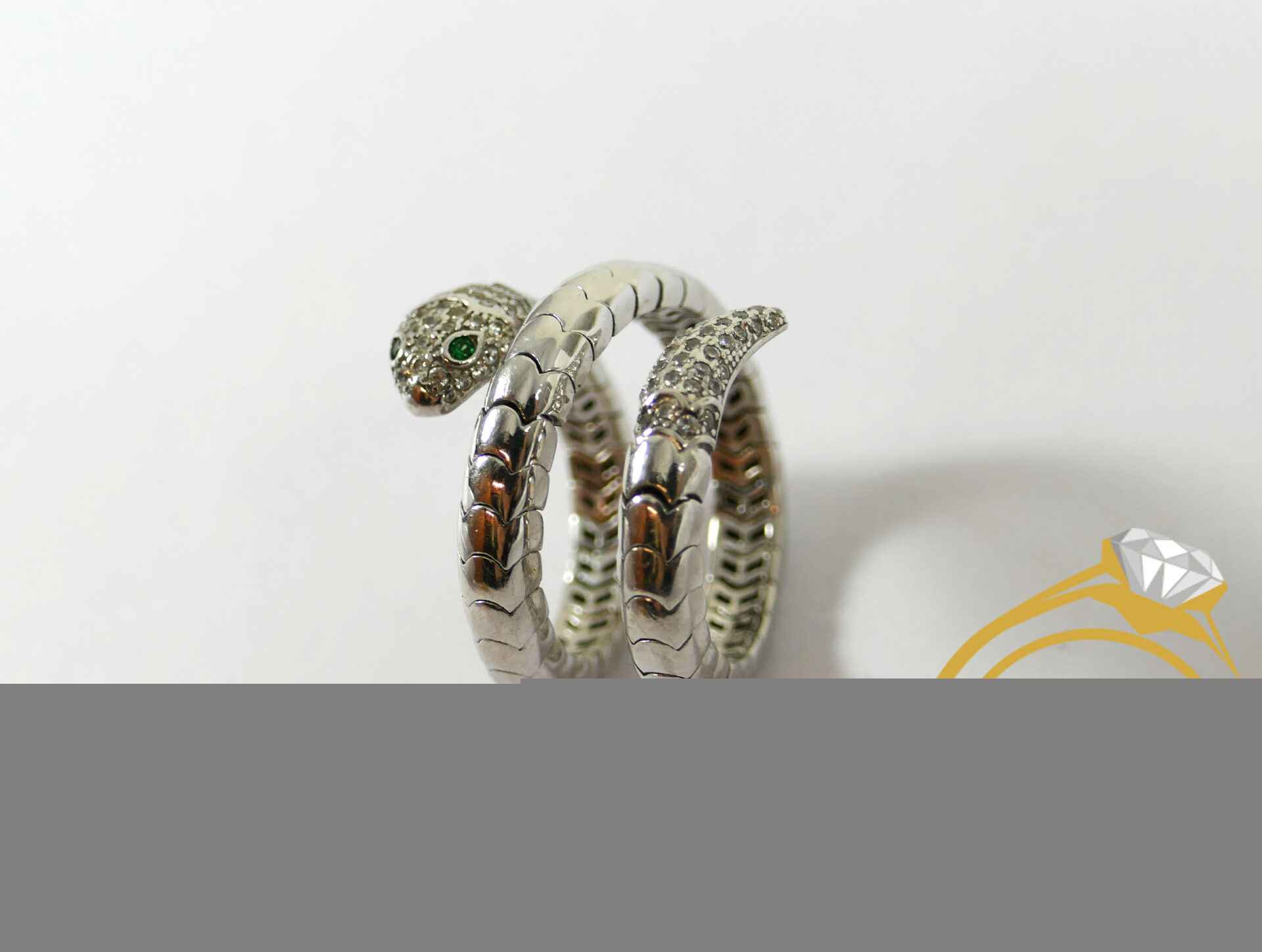 this snake ring is sterling silver 925, and has genuine diamonds on the tail and head of the snake. There are emeralds as the eyes of the snake. this ring is a size 7-8, and weighs 10.2 grams.