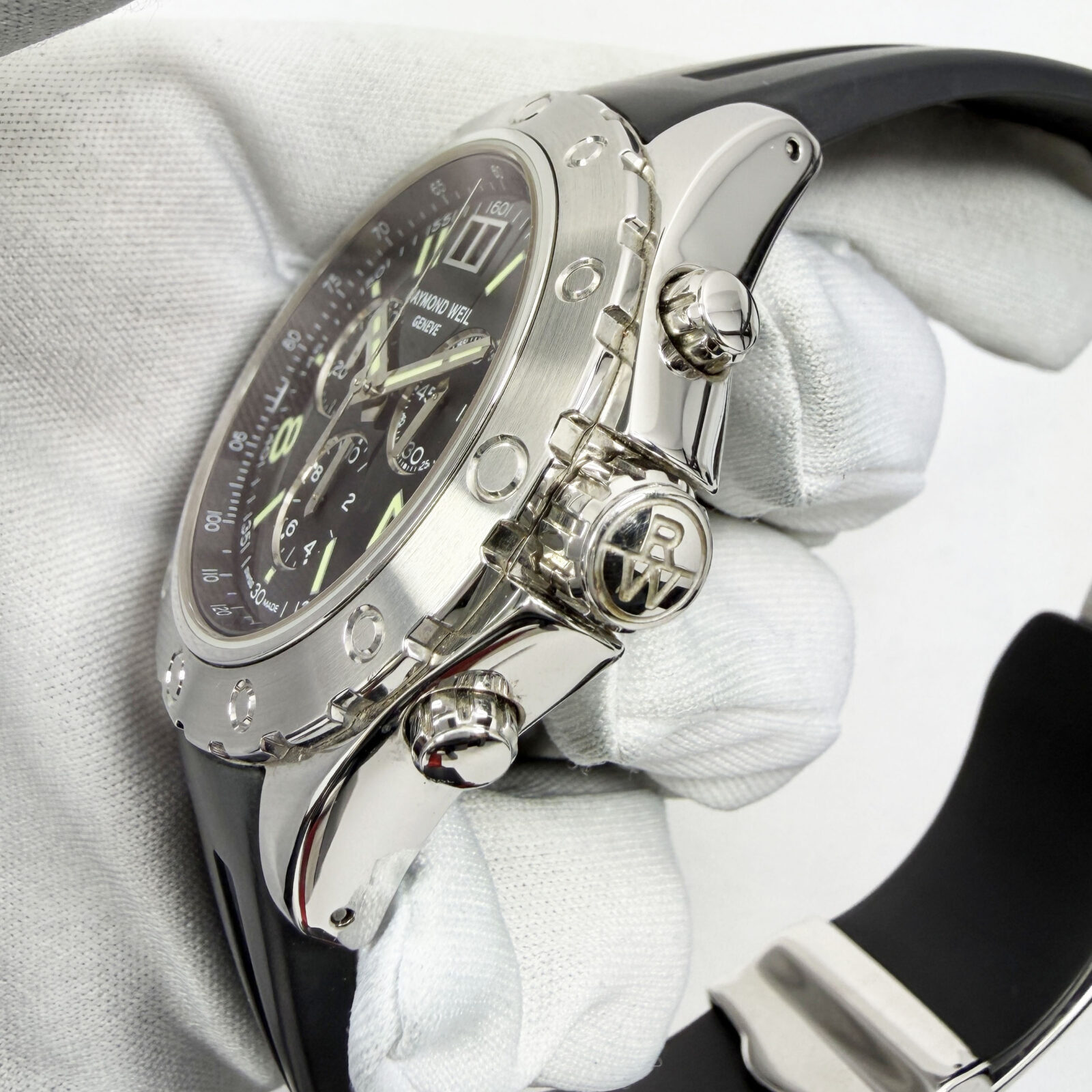 this raymond weil watch comes with its box, booklets, and service paper. The photos shown are of the exact watch being sold and accurately represent its condition. This watch is in stock and ready to ship immediately!