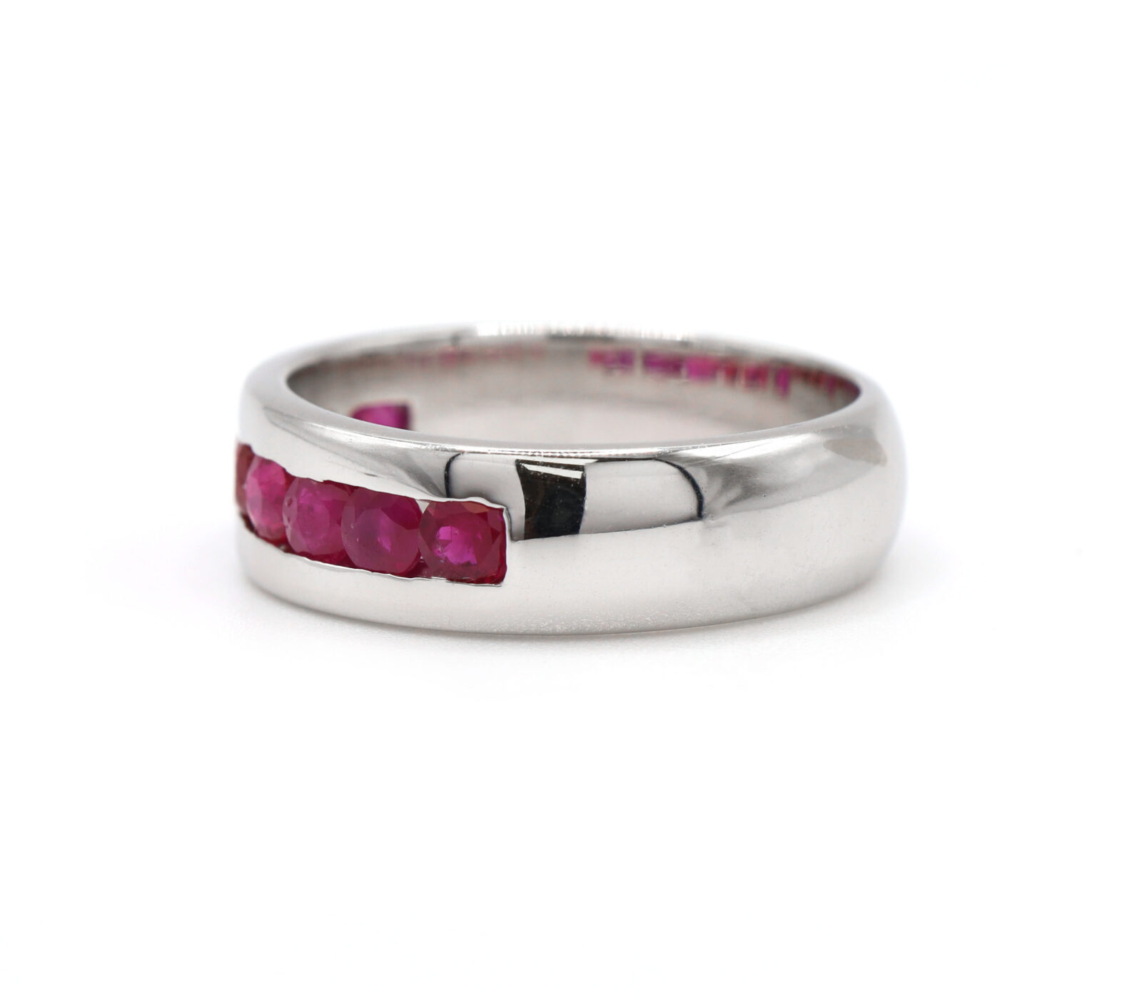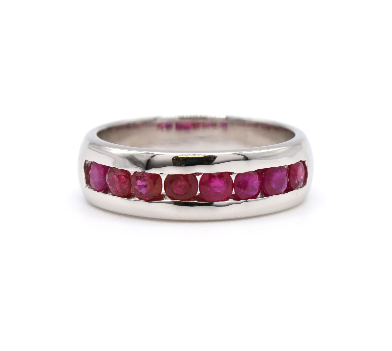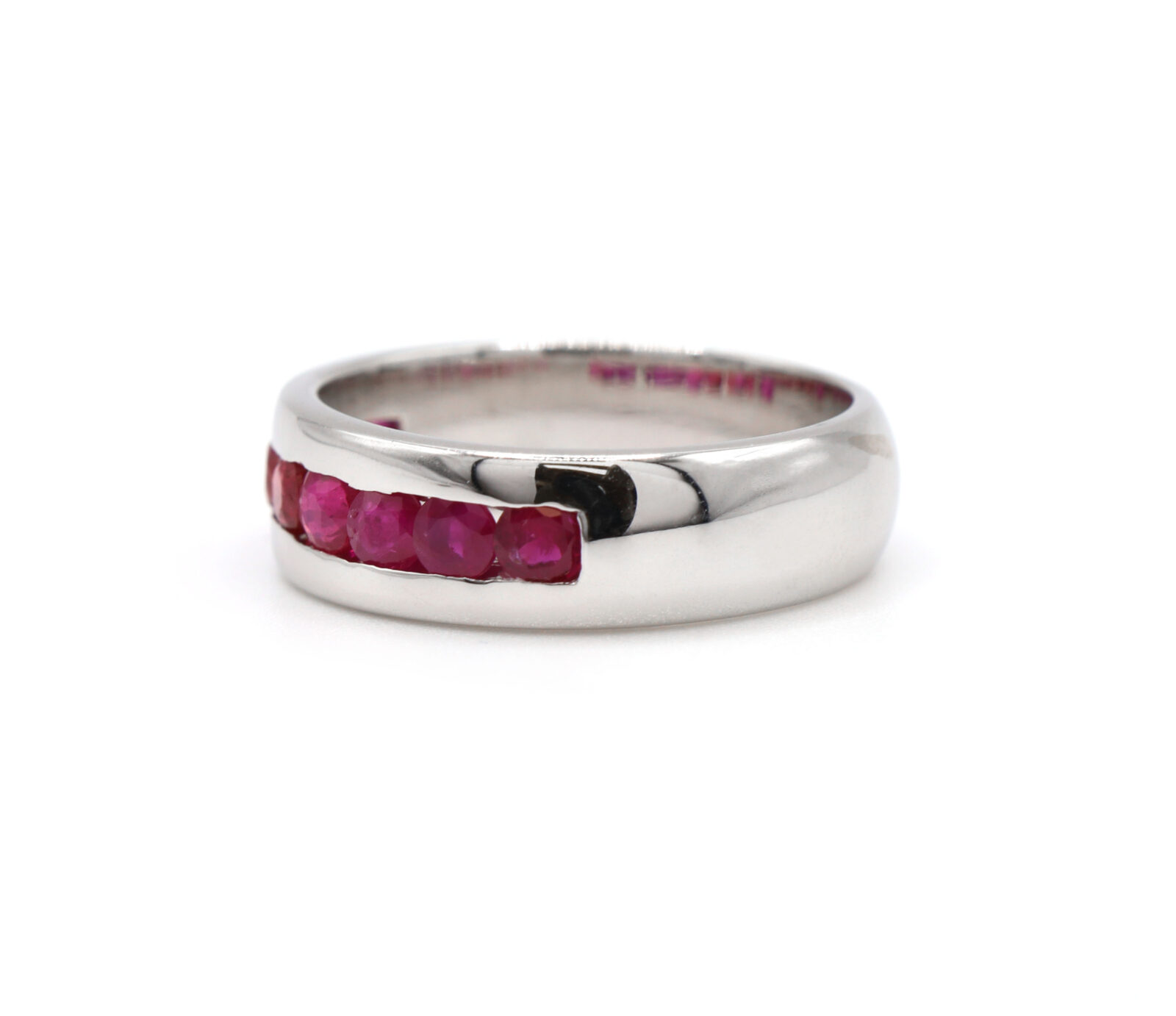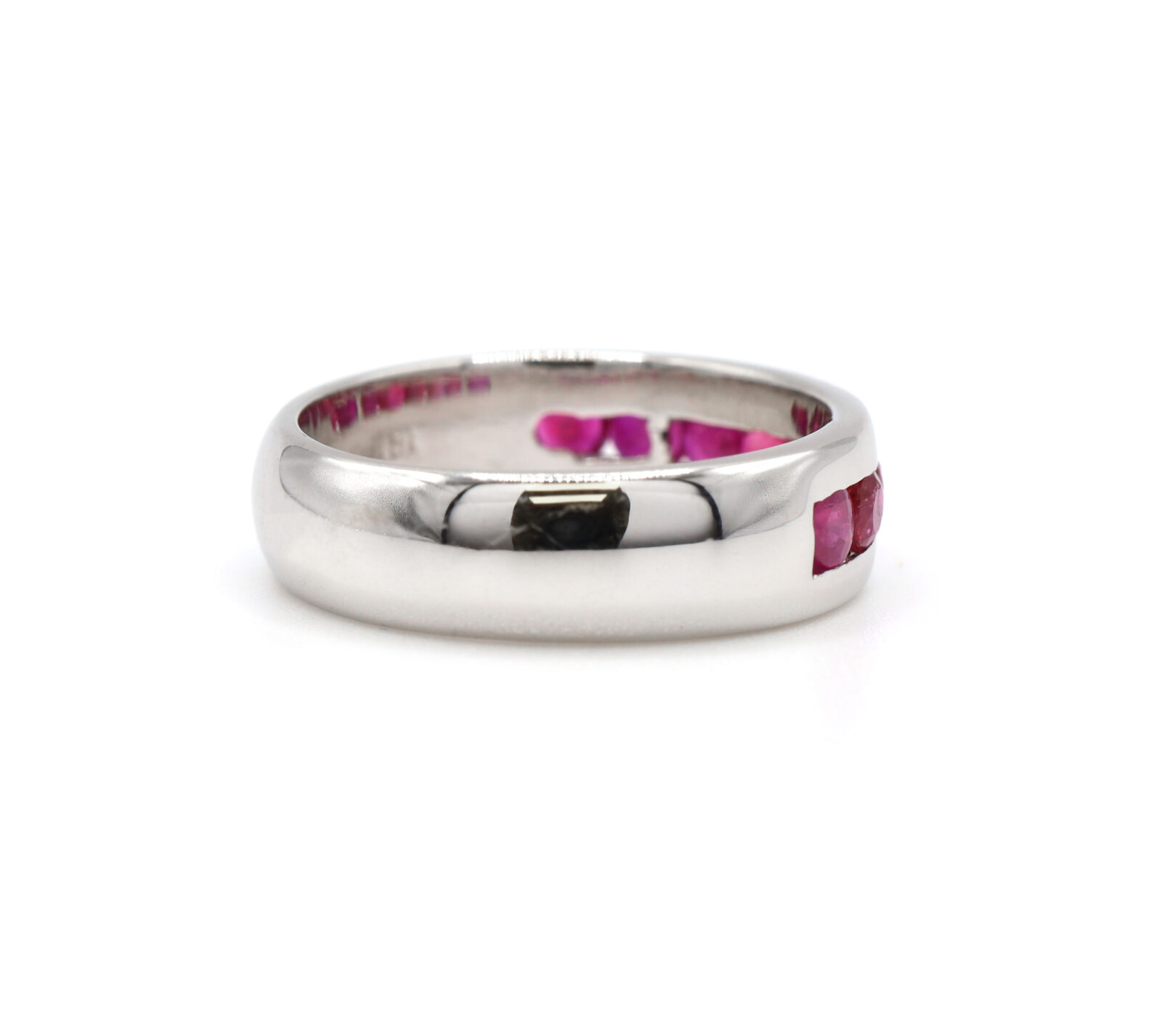 metal: 18k white gold band width: 5.5mm size: 6.25 gemstone: ruby carat weight: approximately 0.80 carat color: red cut: round stone setting: channel set