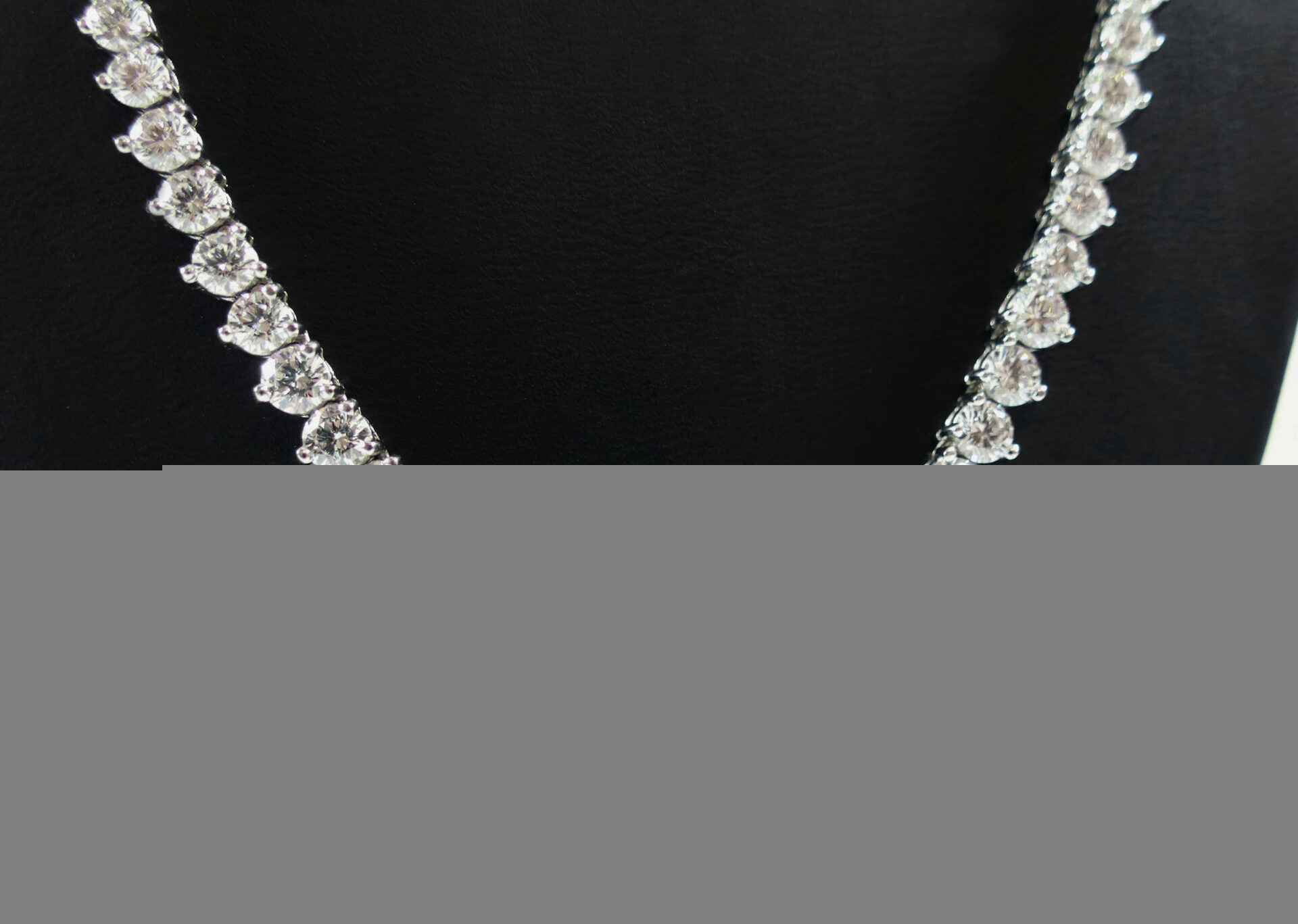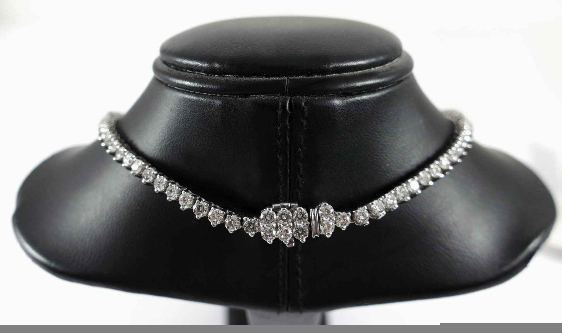 Read Morethis stunning riviera necklace holds all vs diamonds set into solid platinum. There is a total diamond weight of approximately 17 carats.