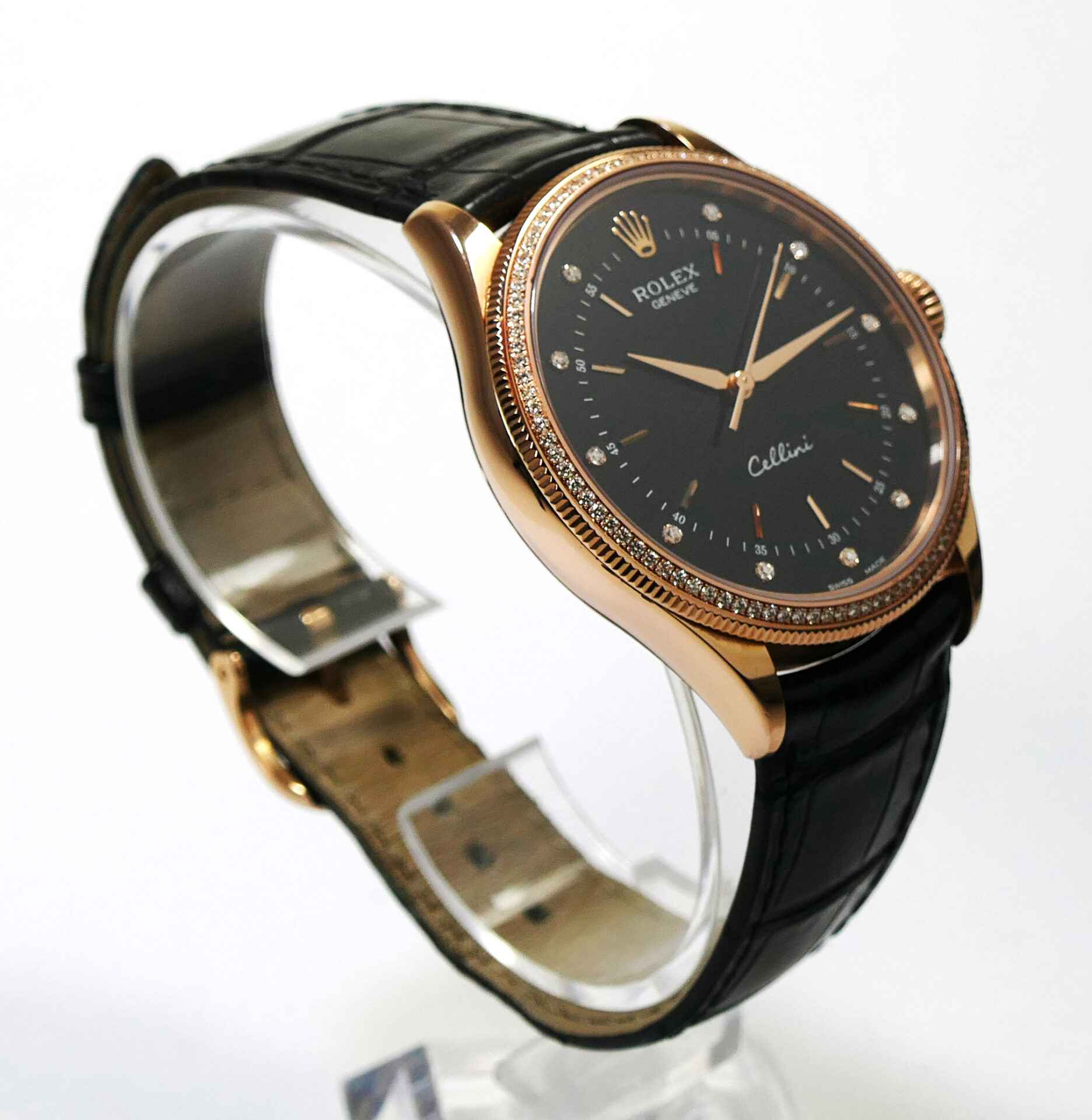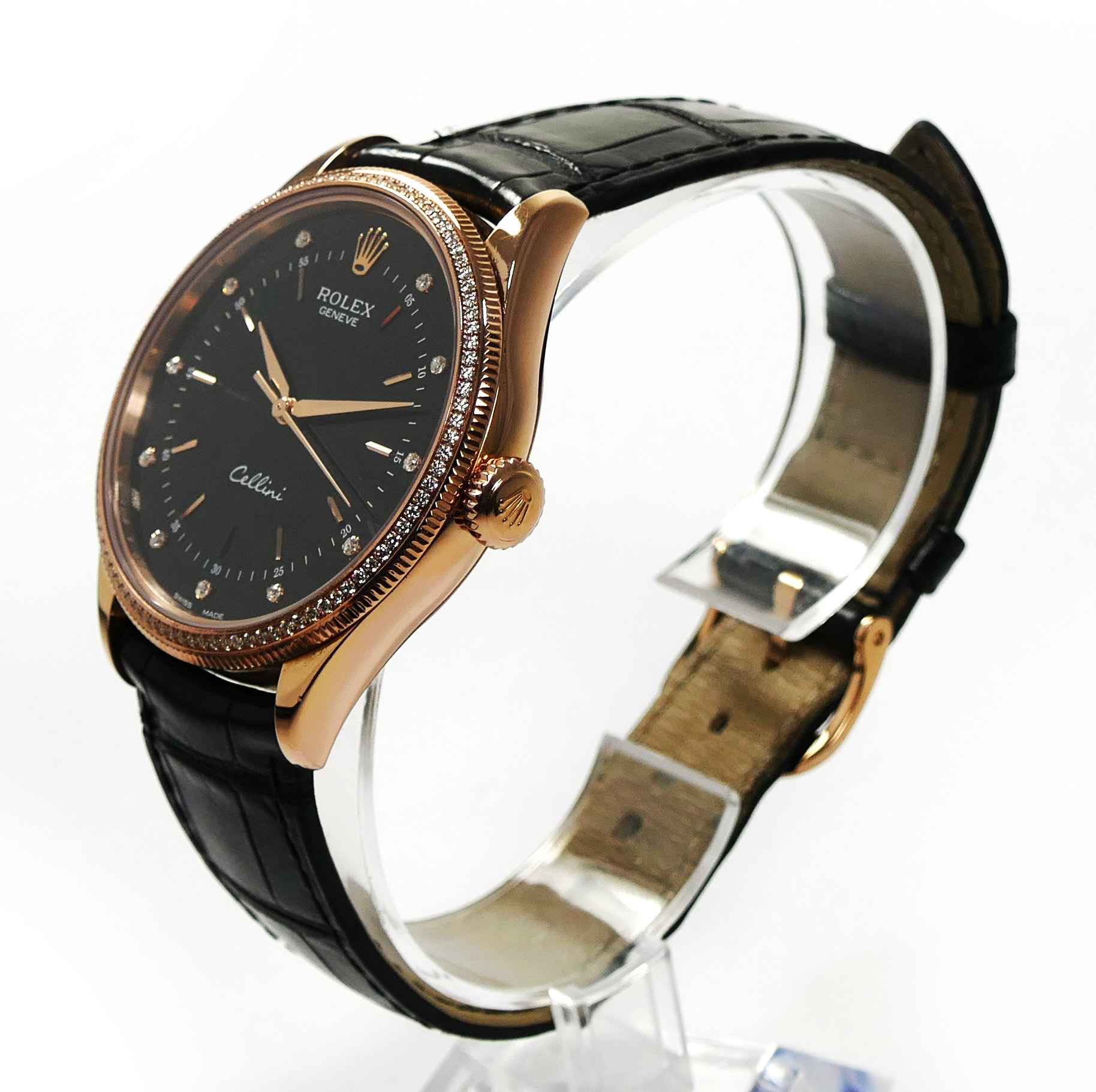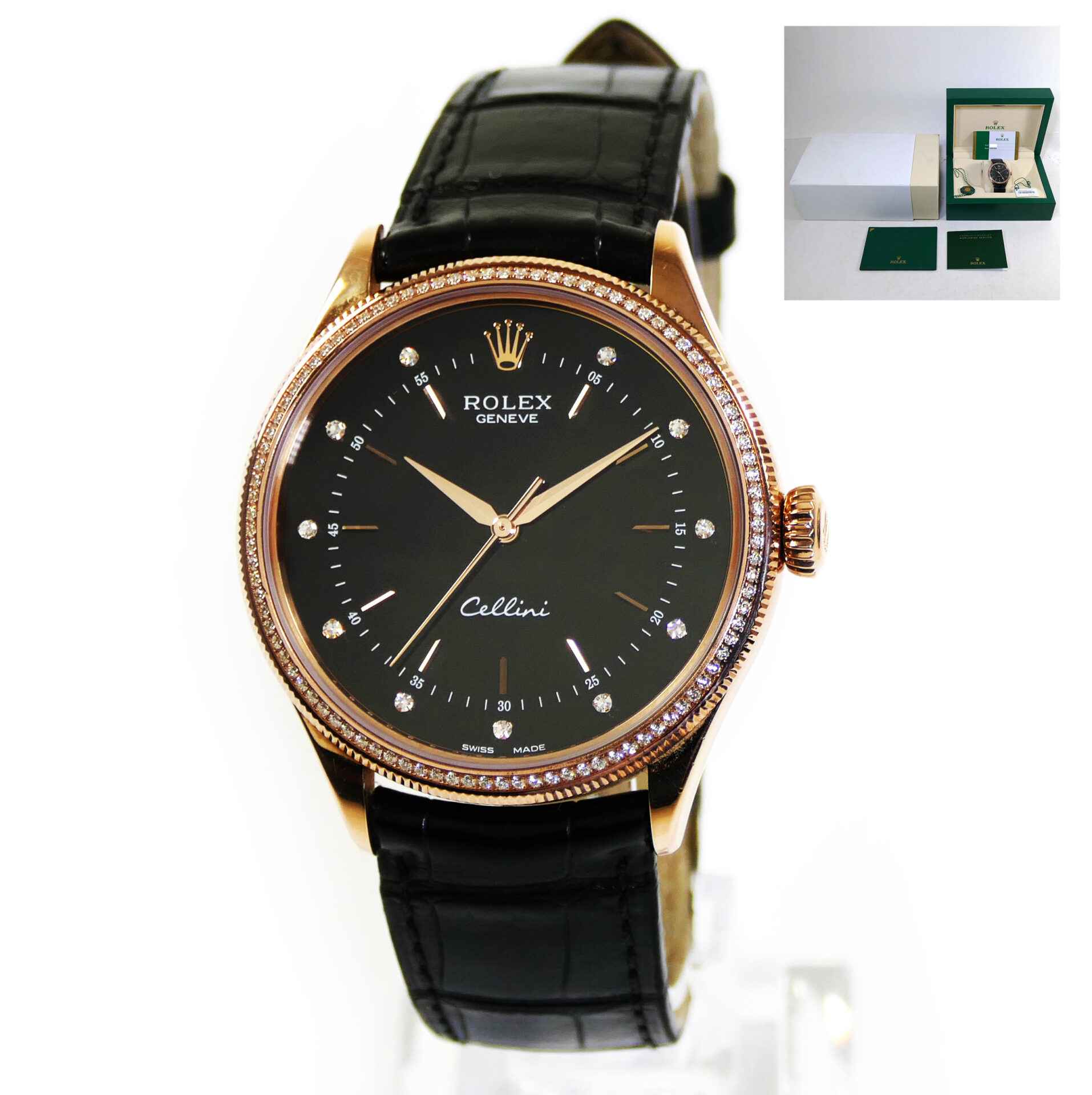 this rolex cellini is in excellent condition and comes with its complete set of box, papers, booklets, hang tags, and warranty card dated august 3rd, 2019. This cellini features a 18k everose gold case with factory set diamonds and also comes on a long strap. This watch is in stock and ready to ship immediately!