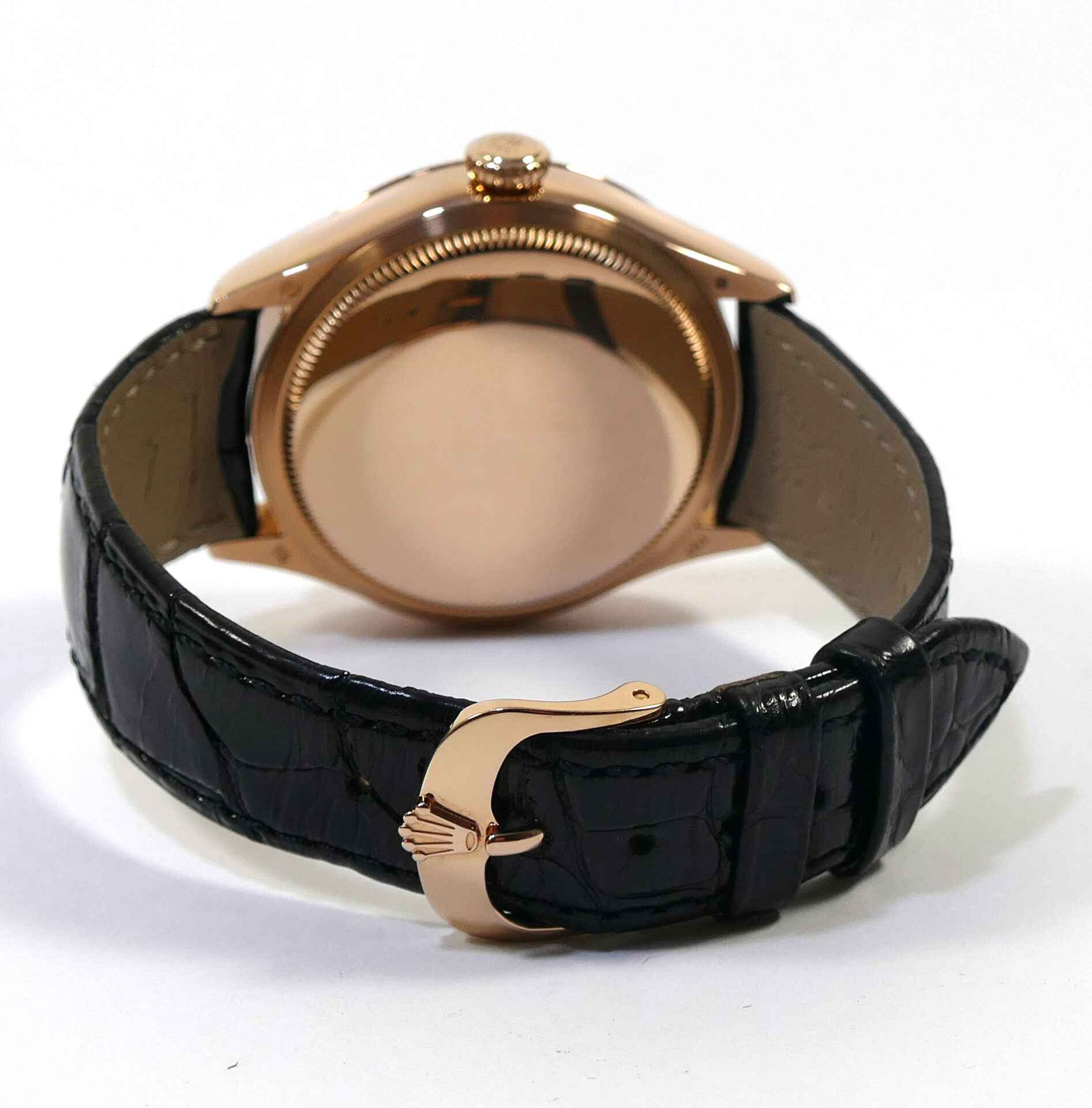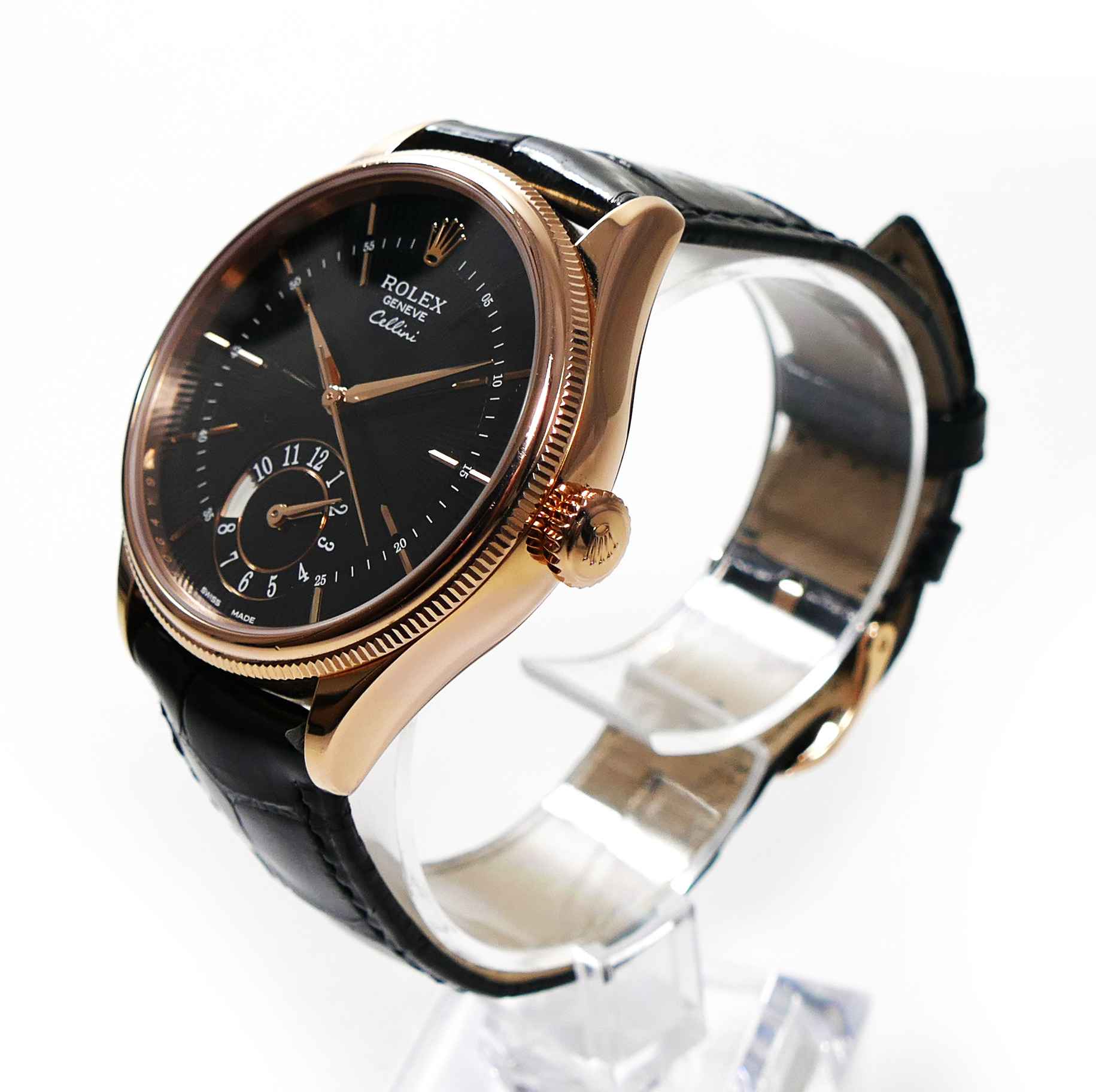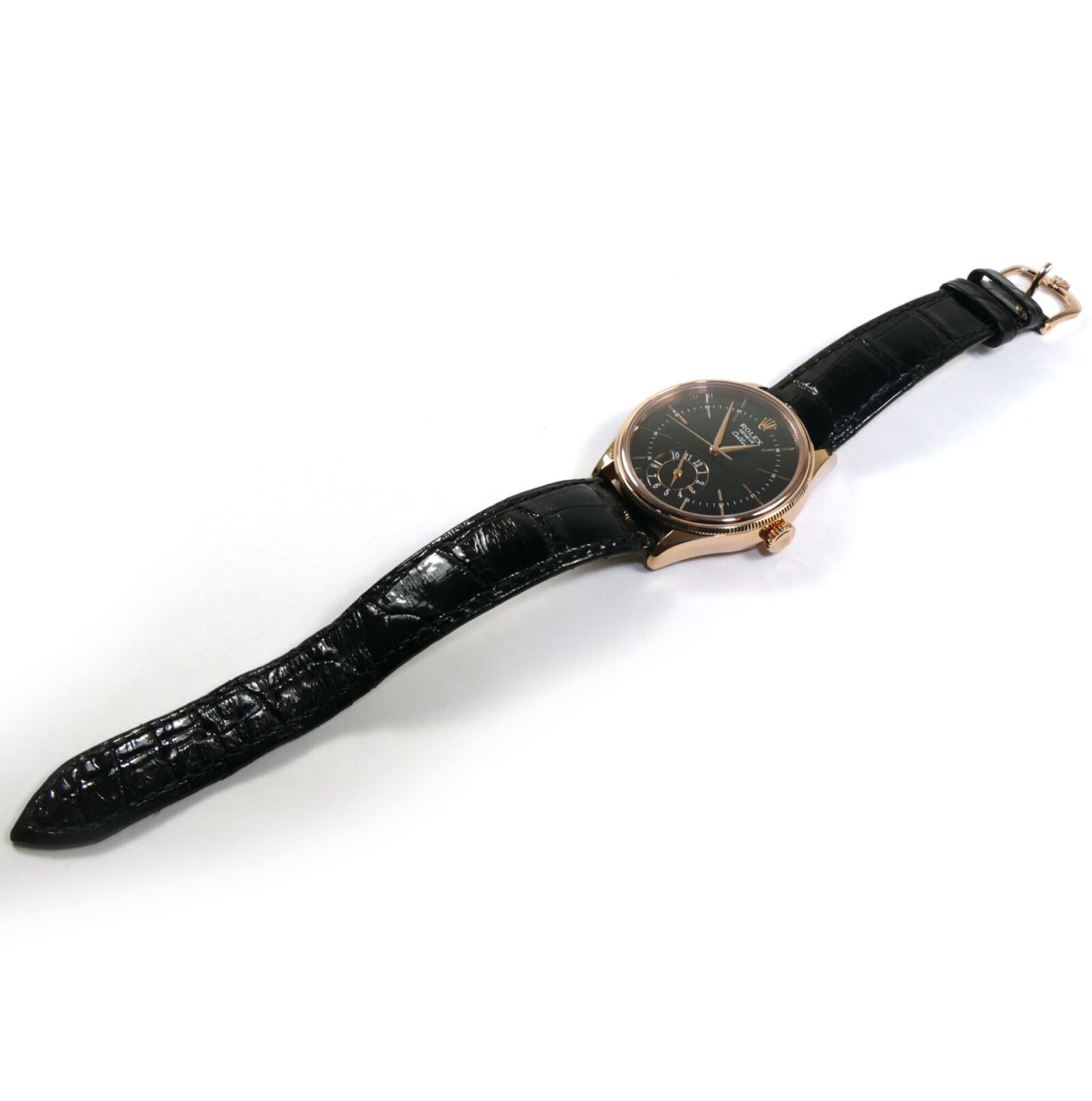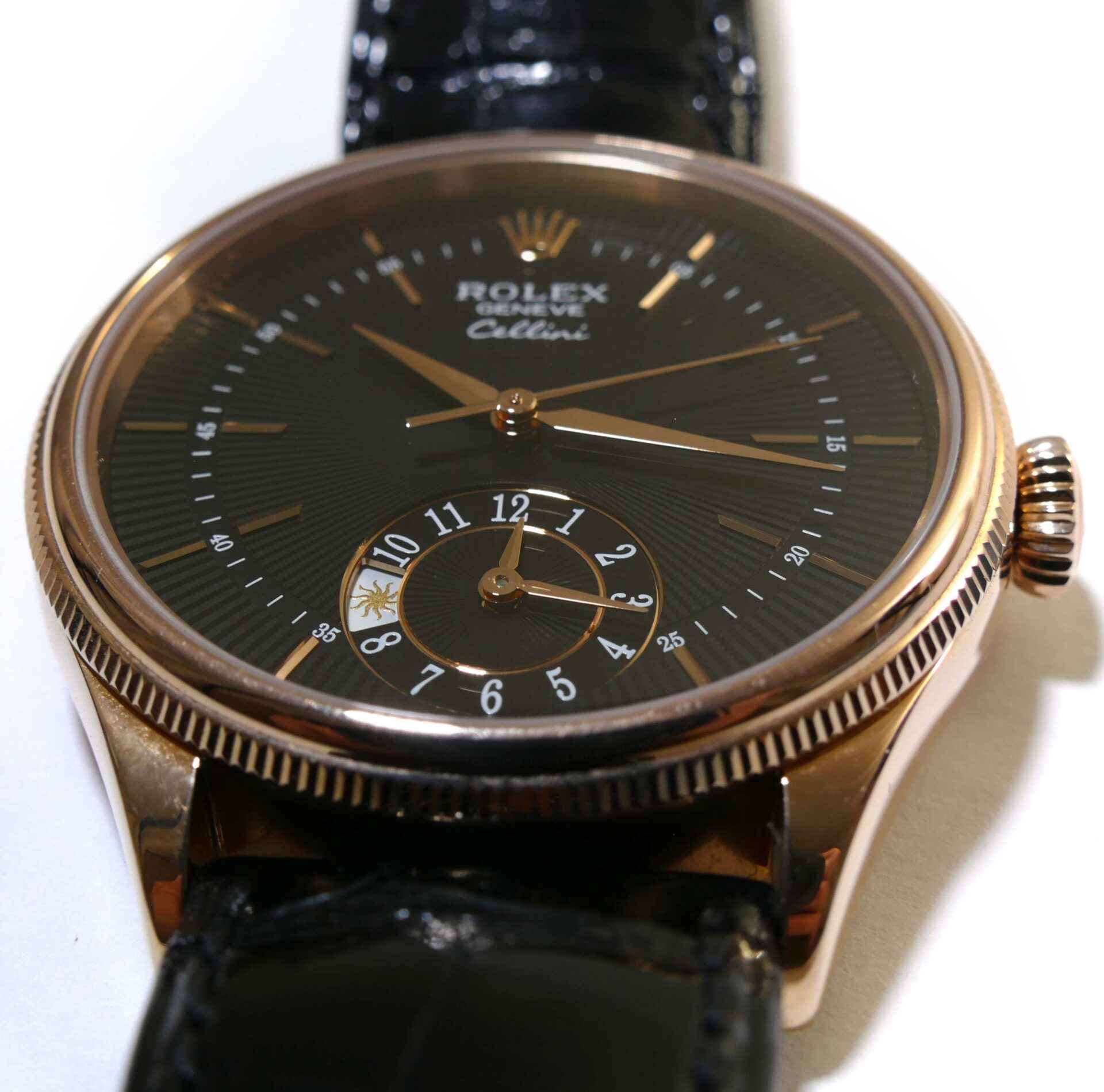 Read Morethis rolex cellini is in excellent condition and is in stock and ready to ship immediately! this cellini features an 18k everose gold case, a black crocodile skin strap, a black guilloche dial, and also displays a second time zone on the sub-dial with a day/night indicator as shown in the photos attached.