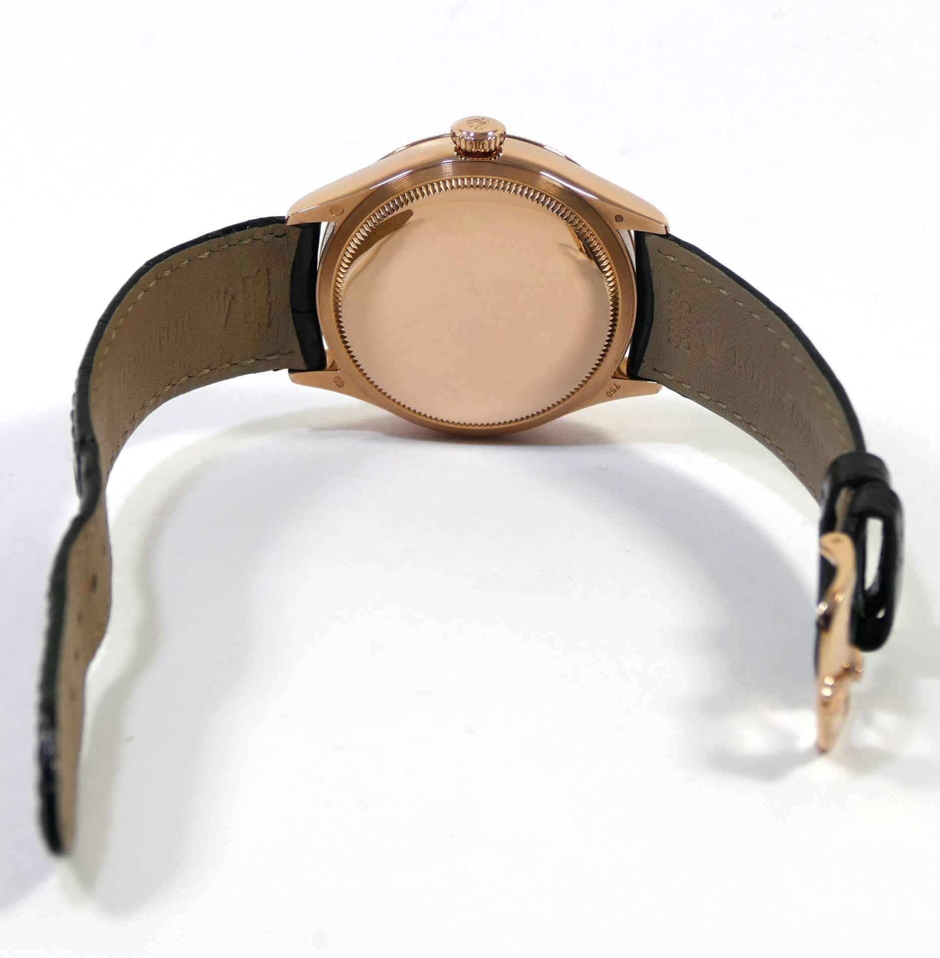 This Rolex Cellini is in excellent condition and is in stock and ready to ship immediately! This Cellini features an 18k Everose gold case, a black crocodile skin strap, a black guilloche dial, and also displays a second...