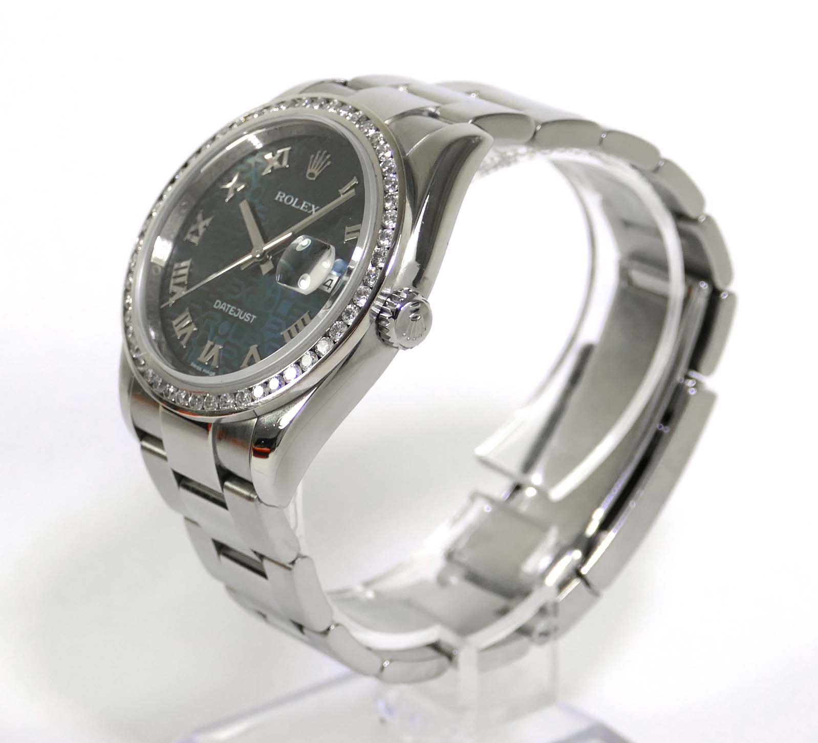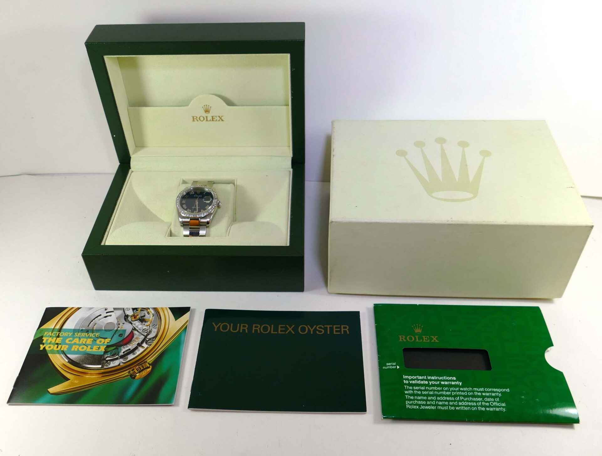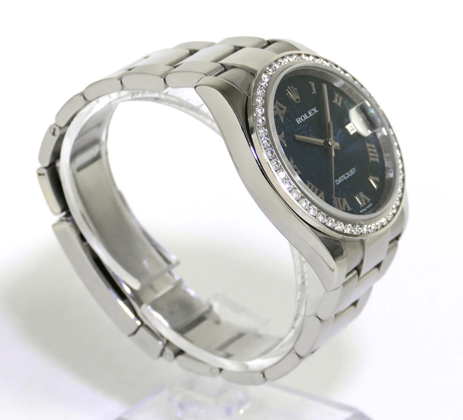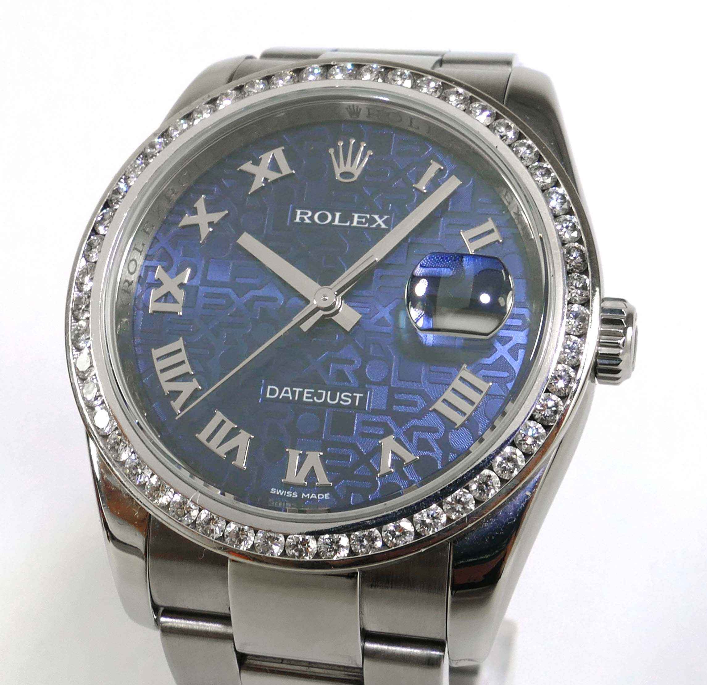 Read Morethis watch is in great overall condition and is functioning accurately. It features a beautiful custom 2.2ct diamond bezel with vs colorless diamonds. It comes with its original box and booklets, however no warranty certificate. The inner chapter ring is engraved (rehaut), and it is an m serial. The bracelet will fit up to a 7.5 inch wrist.