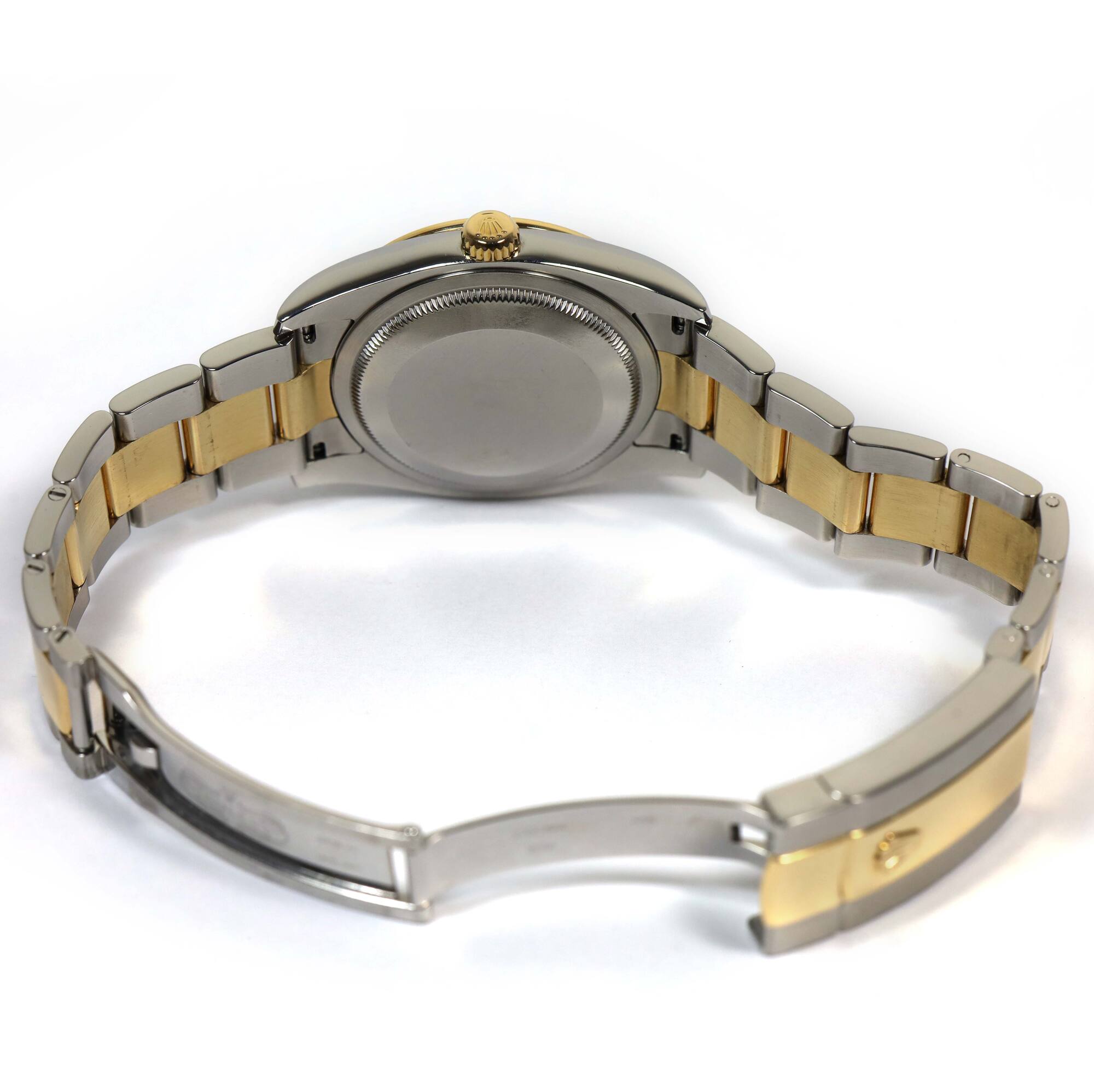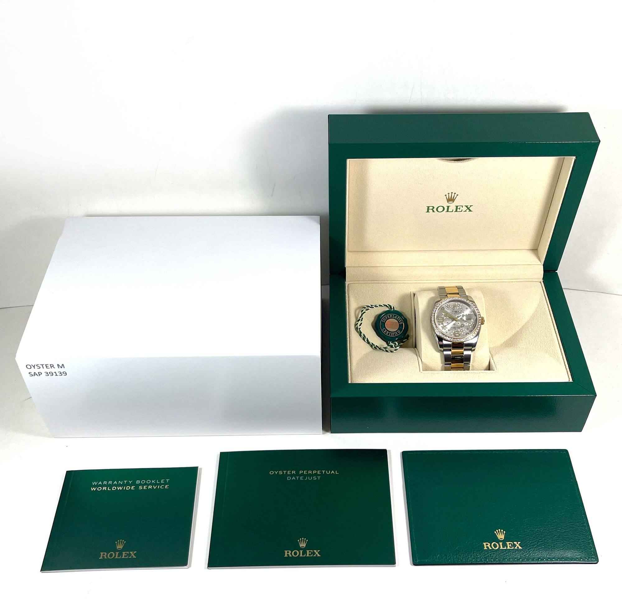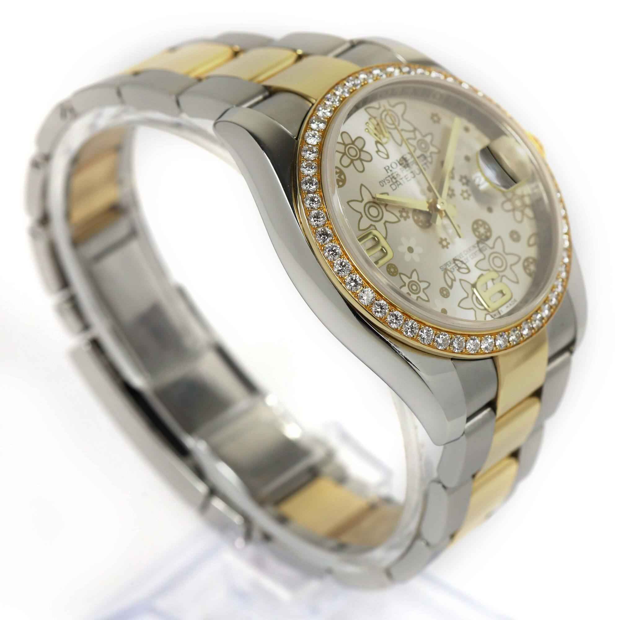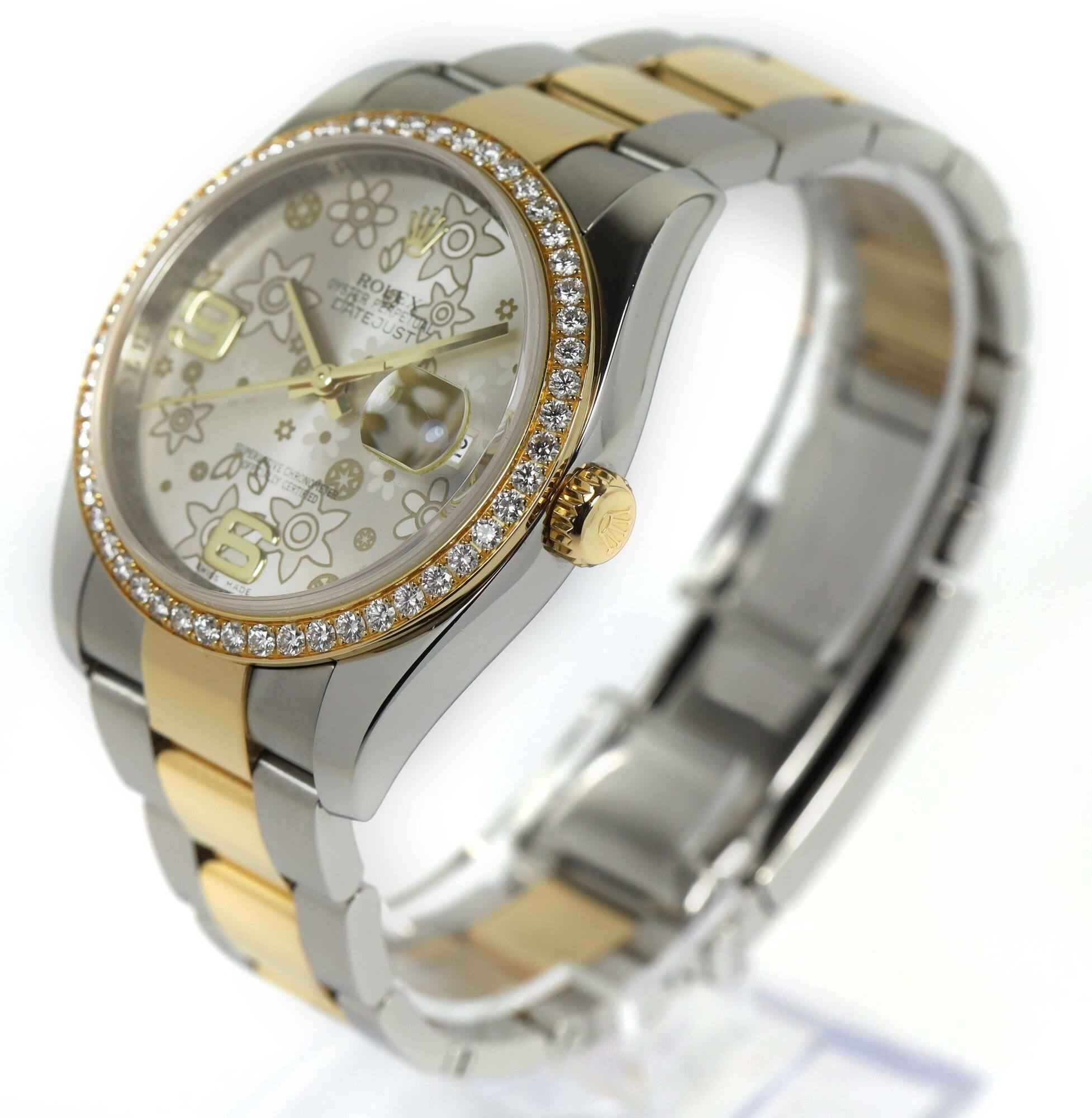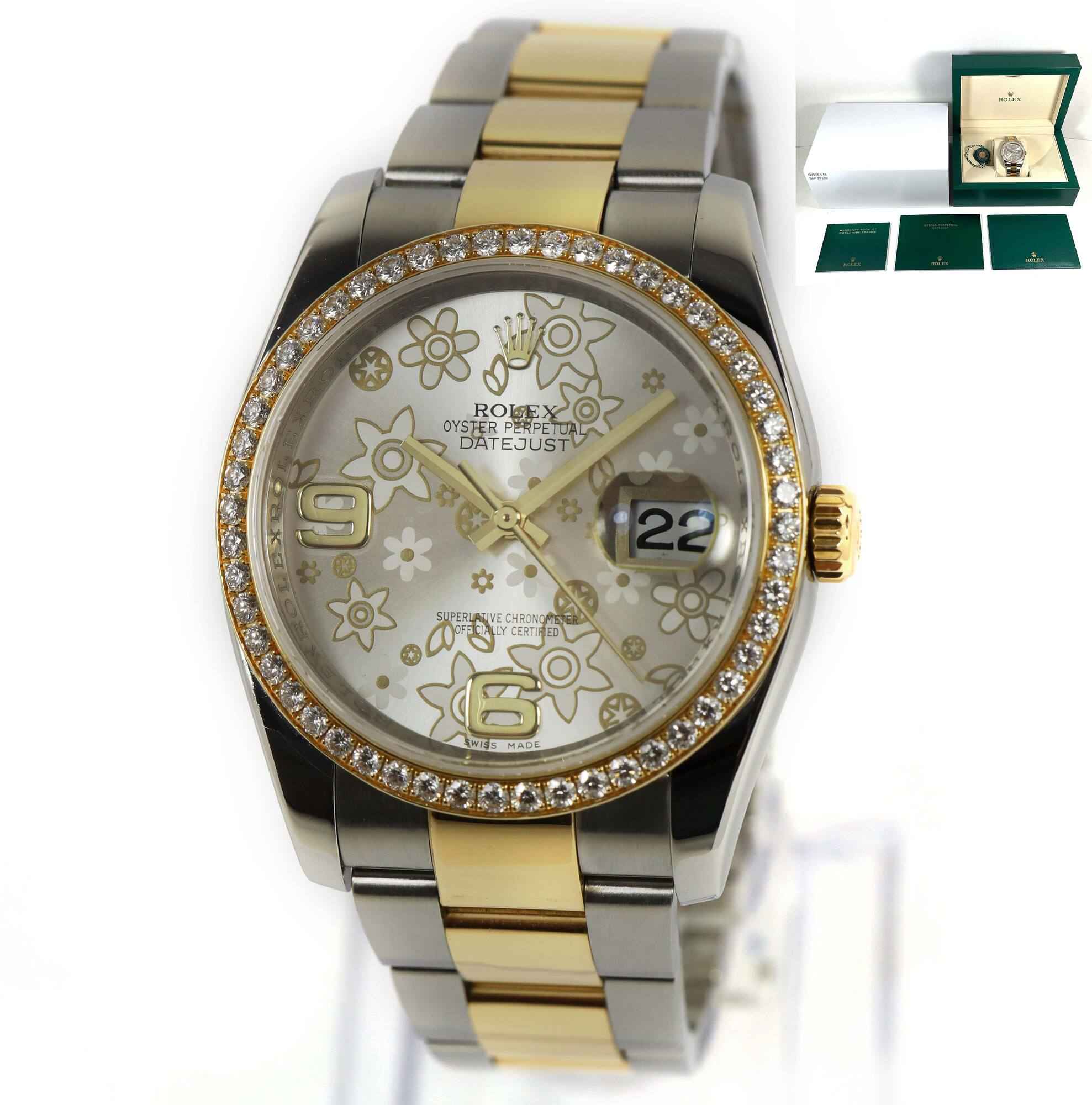 THIS ROLEX IS IN EXCELLENT CONDITION AND COMES WITH ITS BOX AND BOOKLETS ONLY AS SHOWN IN THE PICTURES ATTACHED. THIS WATCH FEATURES A 36MM STAINLESS STEEL CASE THAT SURROUNDS A SILVER FLOWER ARABIC DIAL WITH A FACTORY DIAMOND BEZEL AND COMES ON A TWO-TONE ...