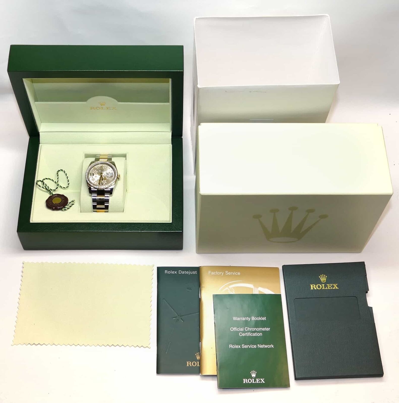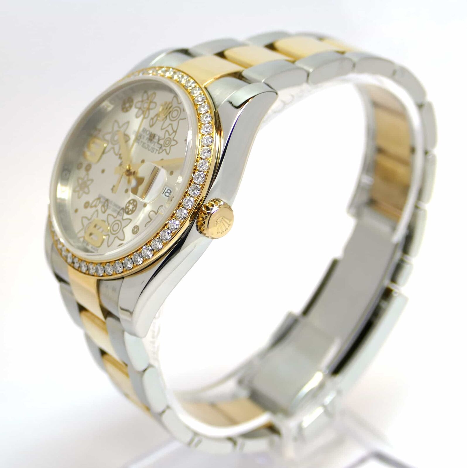 this rolex is in excellent condition and features a factory original diamond bezel and factory original flower dial. Included is the original box and booklets, however the warranty card is not included.