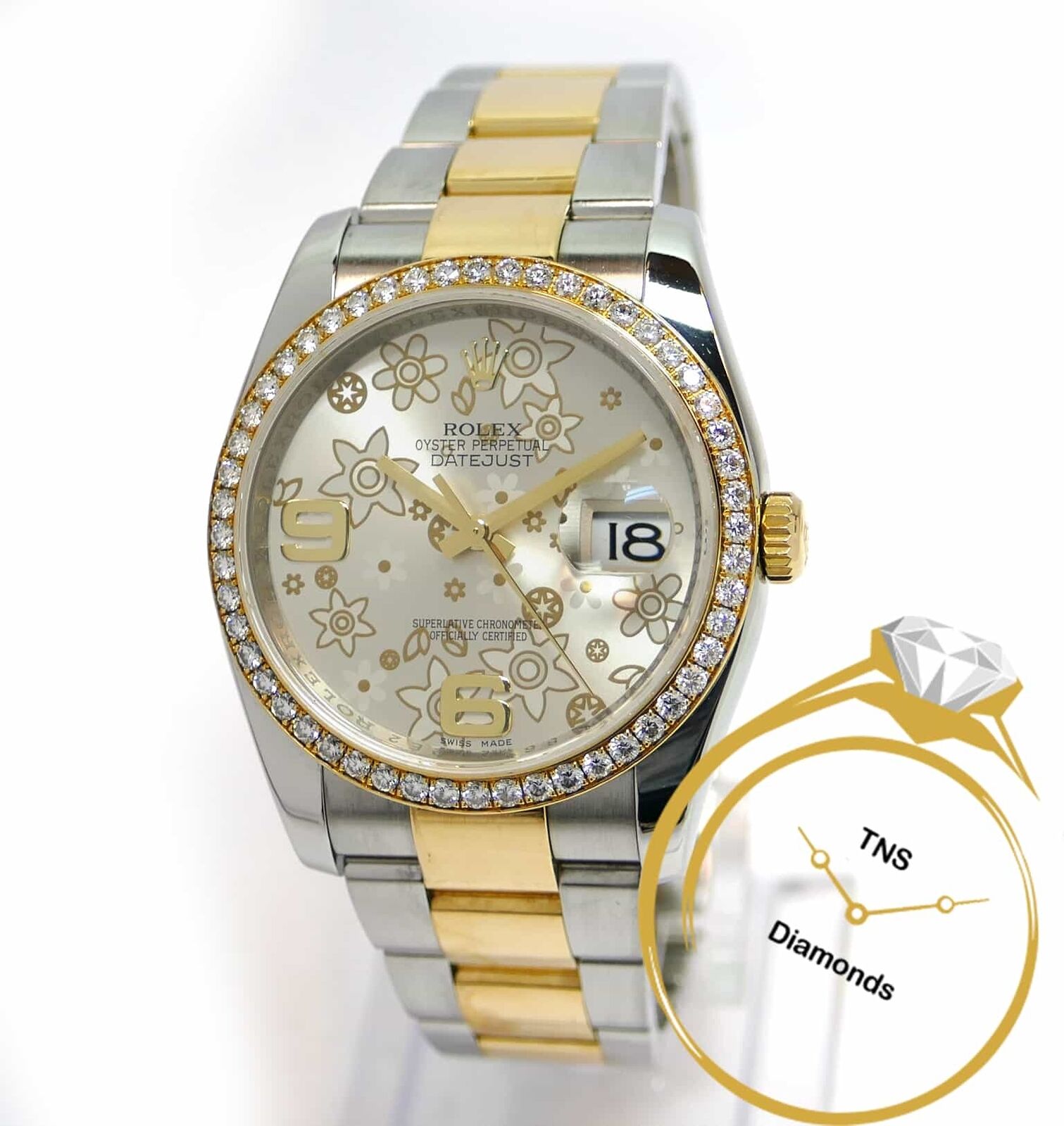 This Rolex is in excellent condition and features a Factory Original Diamond Bezel and Factory Original Flower Dial. Included is the original box and booklets, however the warranty card is not included.