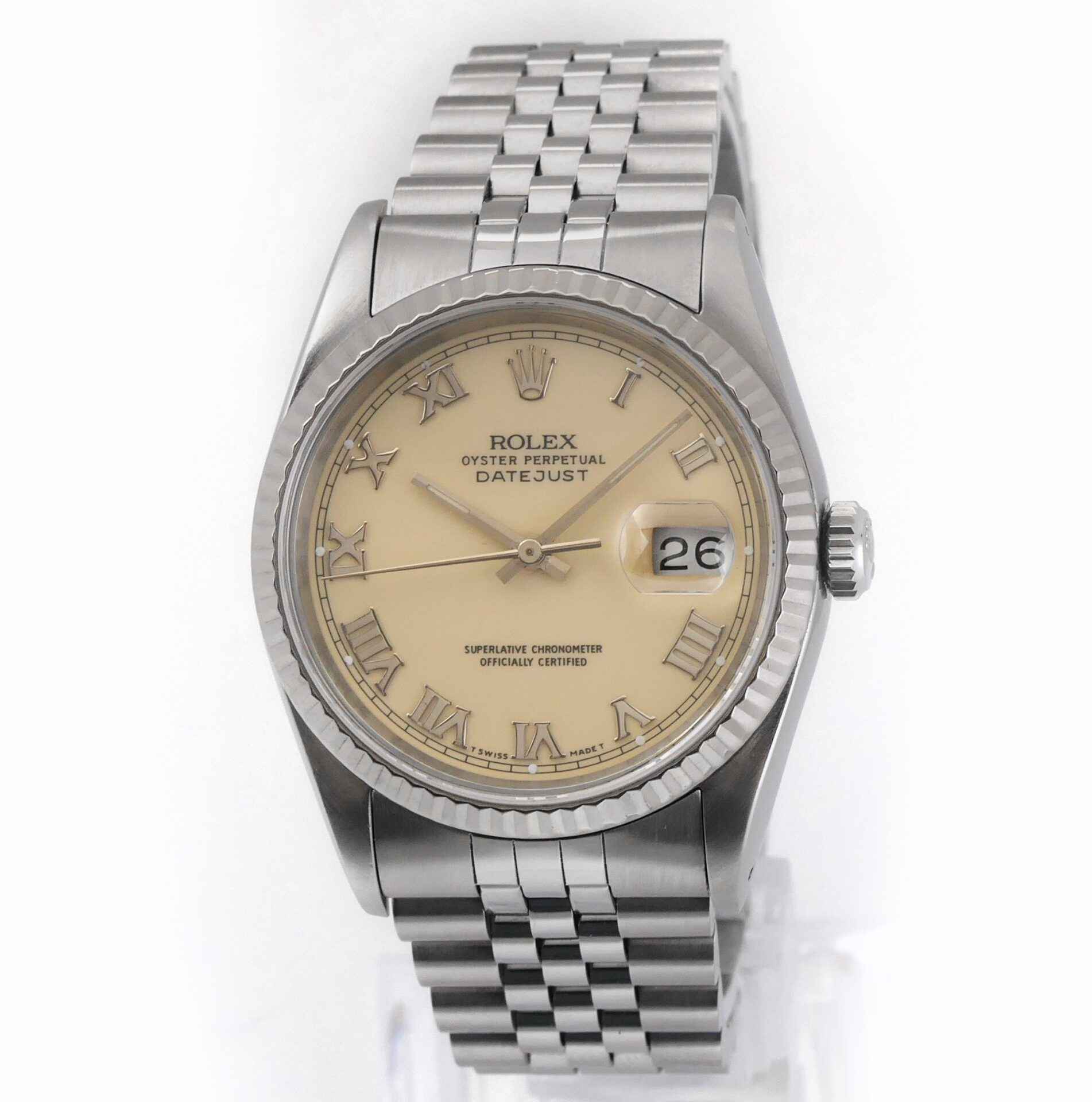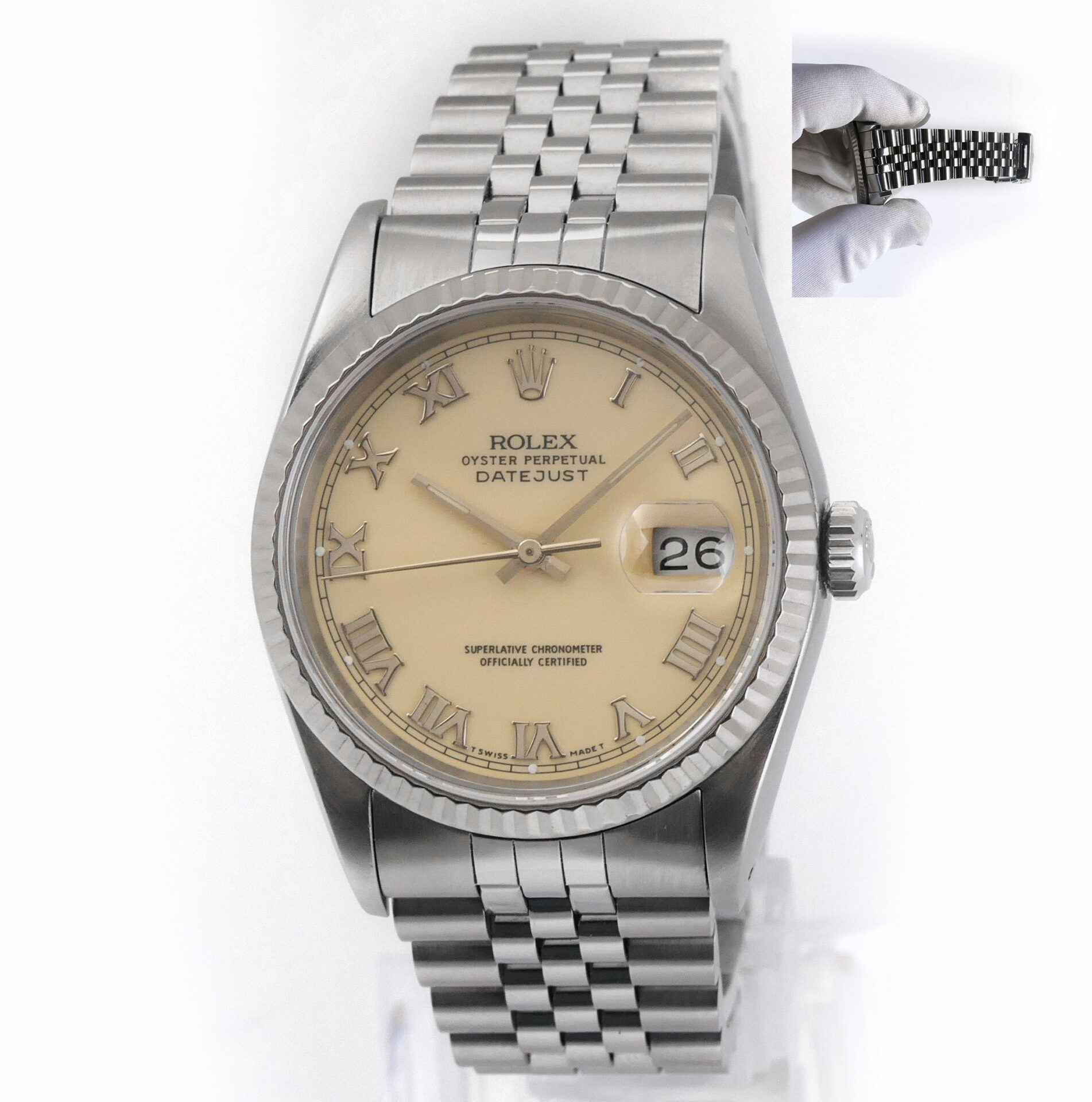 Read Morethis rolex is in excellent condition but does not come with box or papers. This watch has a serial number starting with “x” which dates the production year to be around 1991. This watch features a unique cream dial with roman numerals on a stainless steel jubilee band. The jubilee band on this watch is in excellent condition as shown in the photos attached. This watch is in stock and ready to ship immediately!