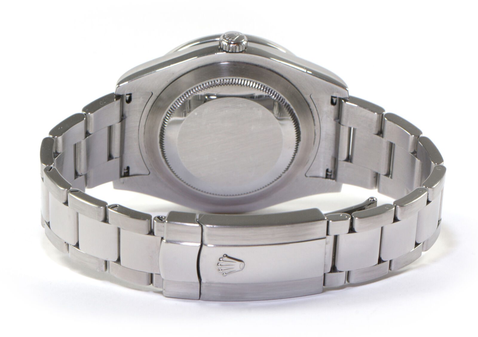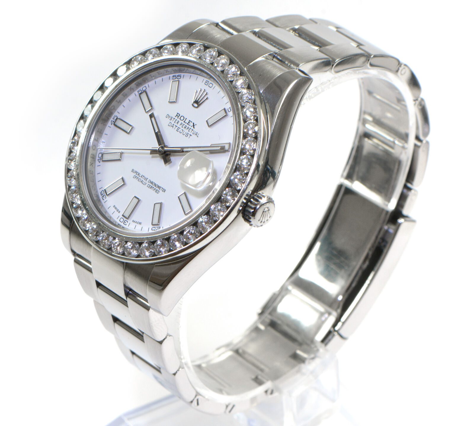 this rolex is in excellent condition and comes with a 12-month warranty. It features a custom 4.5 carat diamond bezel with g color and si clarity diamonds.