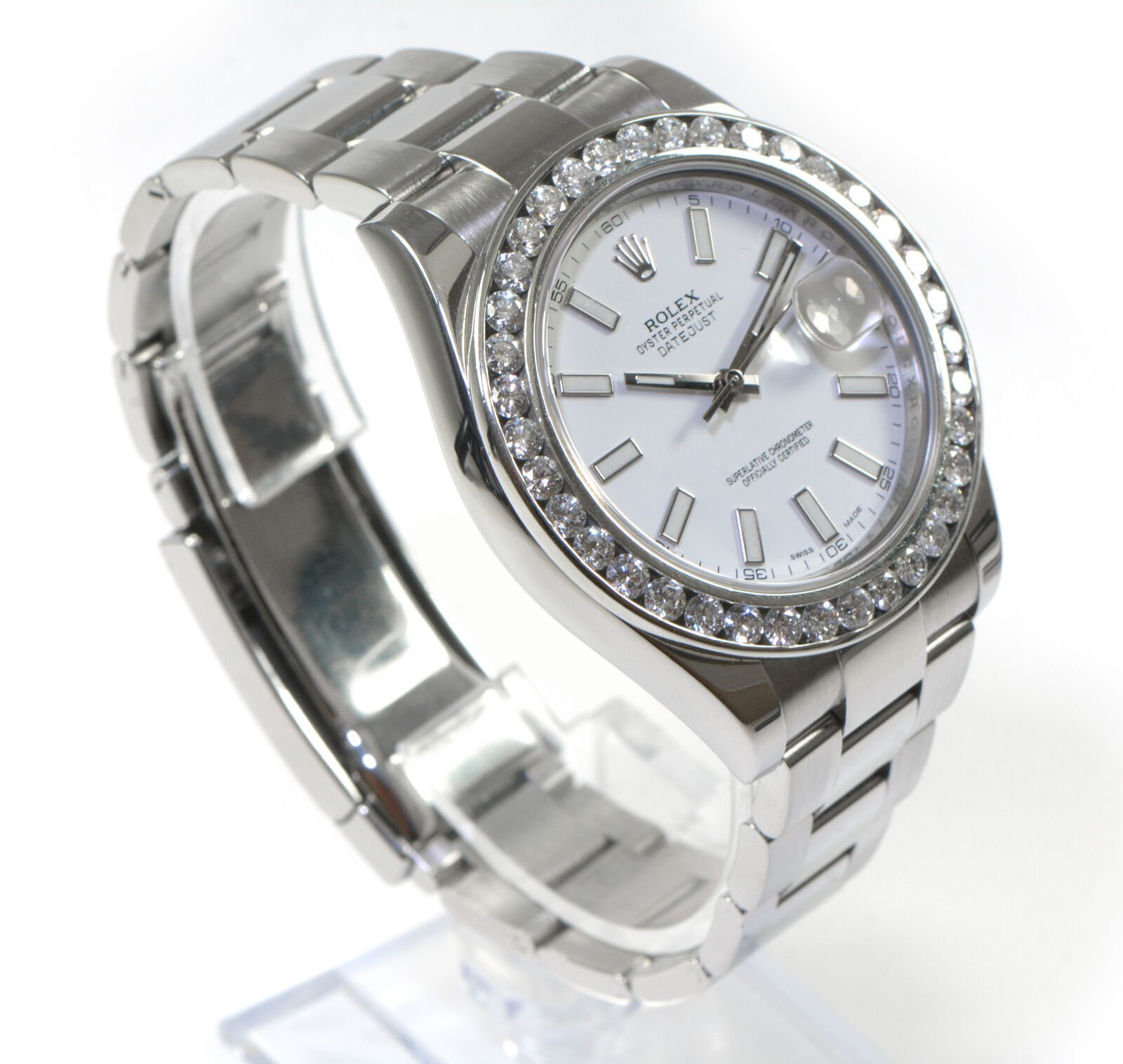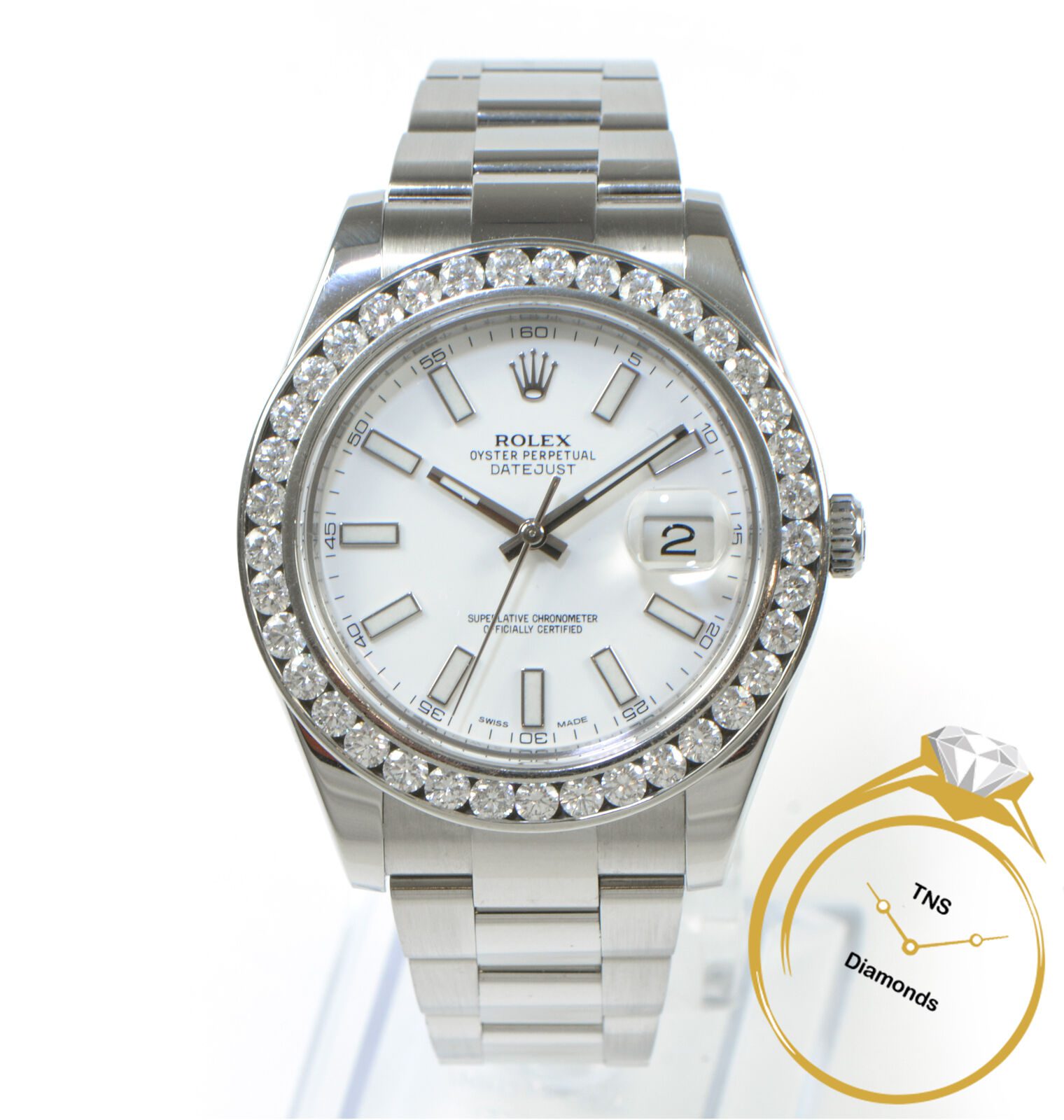 condition: excellent gender: men’s watches band: stainless steel oyster watches box: tns diamonds box watches brand: rolex watches case diameter (mm): 41 watches caseback: solid watches crystal: sapphire watches dial: white stick watches functions: date watches model: 116300 watches movement: automatic watches papers: no original papers watches series: datejust ii watches warranty: 1 year tns diamonds warranty