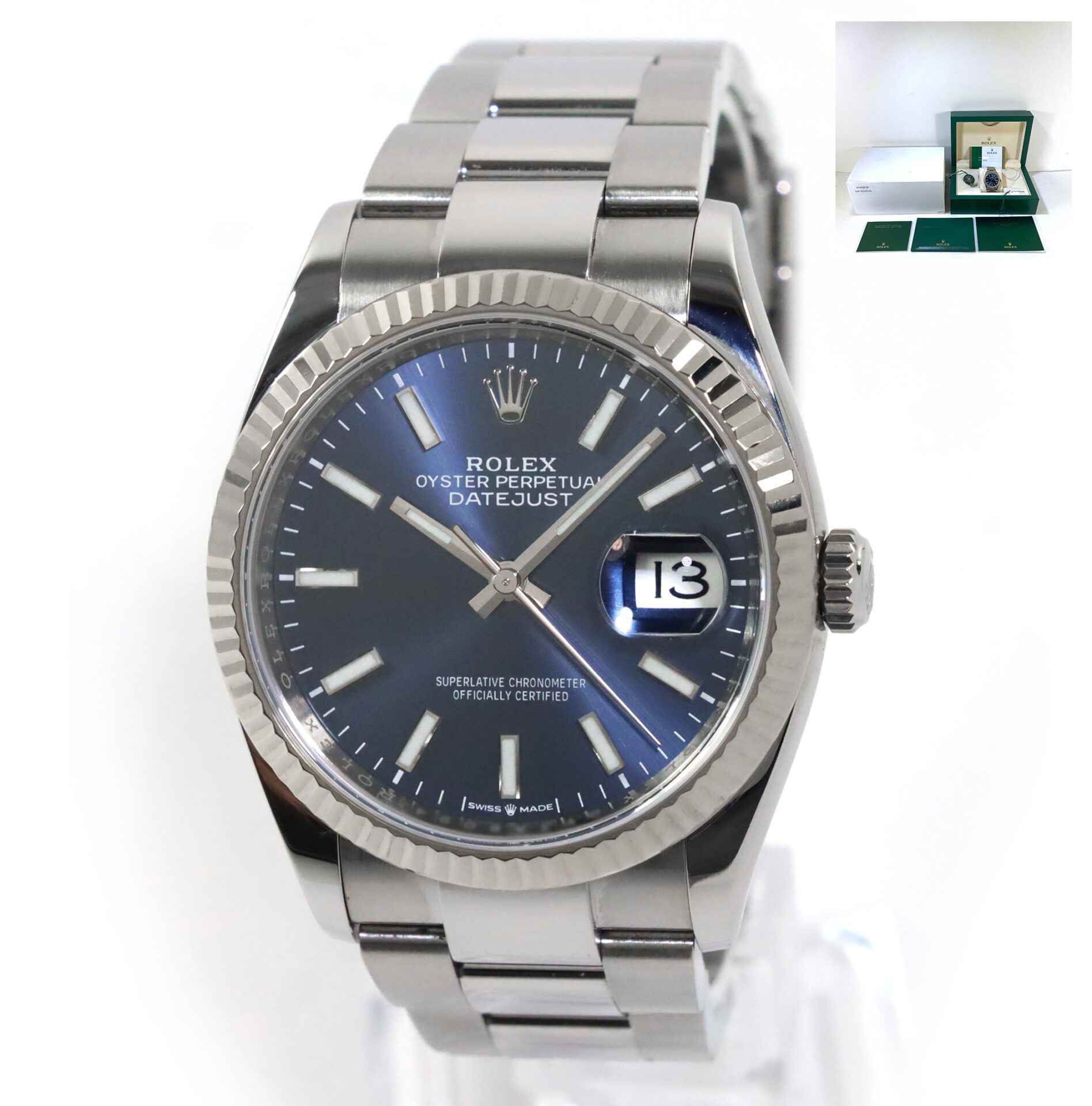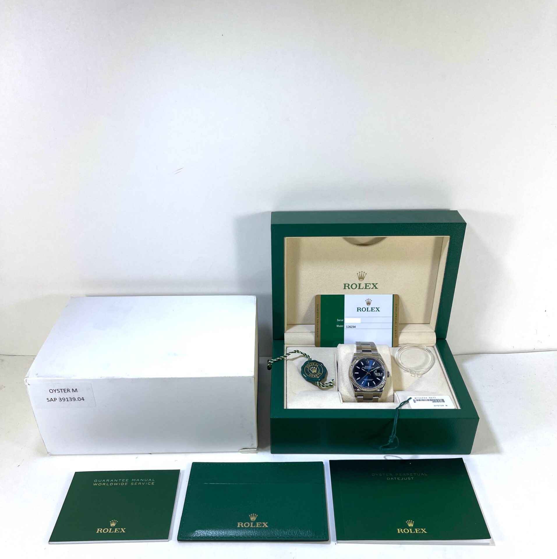 this rolex is in excellent condition and comes with box, papers, hang tags, bezel protector and warranty card. This watch is in stock and available to ship immediately!