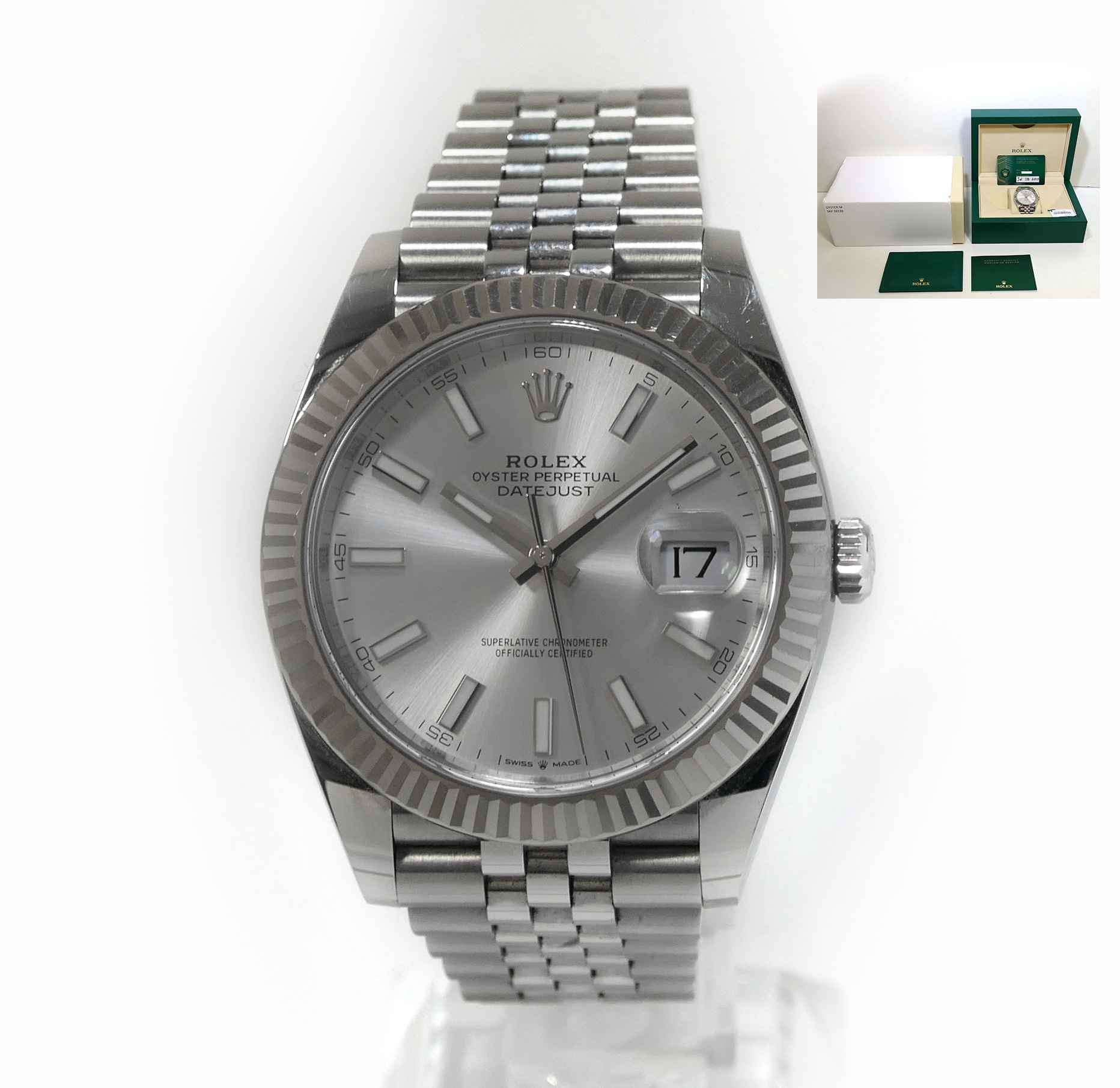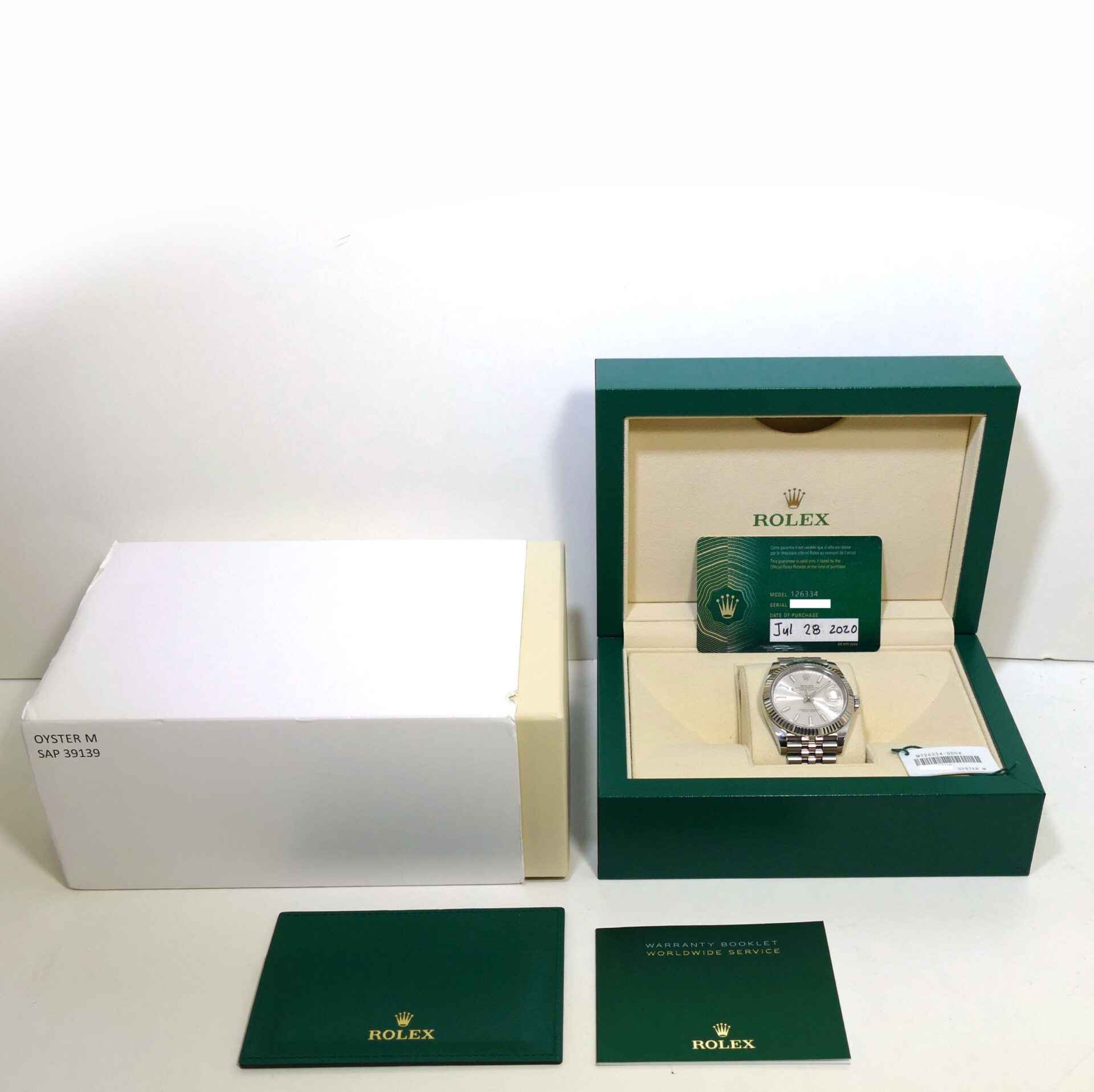 this rolex is in excellent condition and comes with box, papers, hang tag, and warranty card dated july 28th, 2020. This watch is in stock and ready to ship immediately!