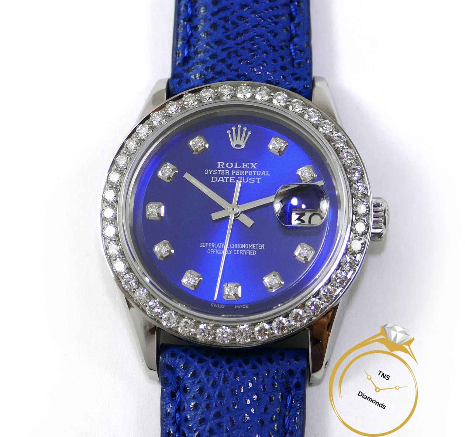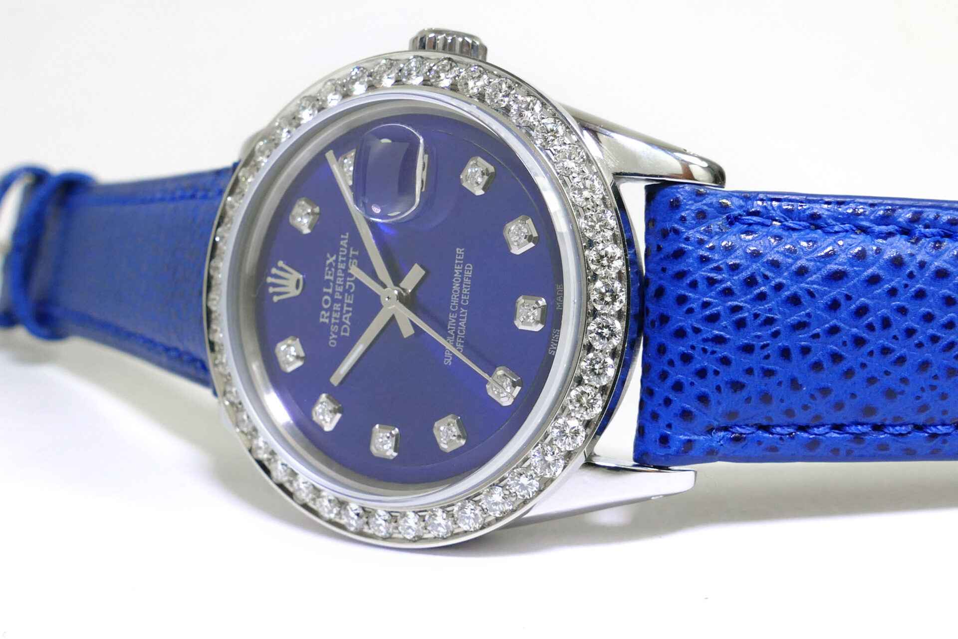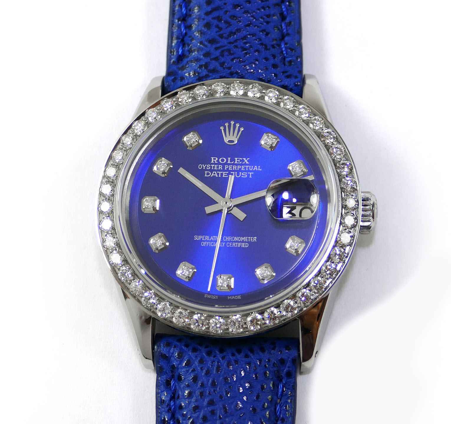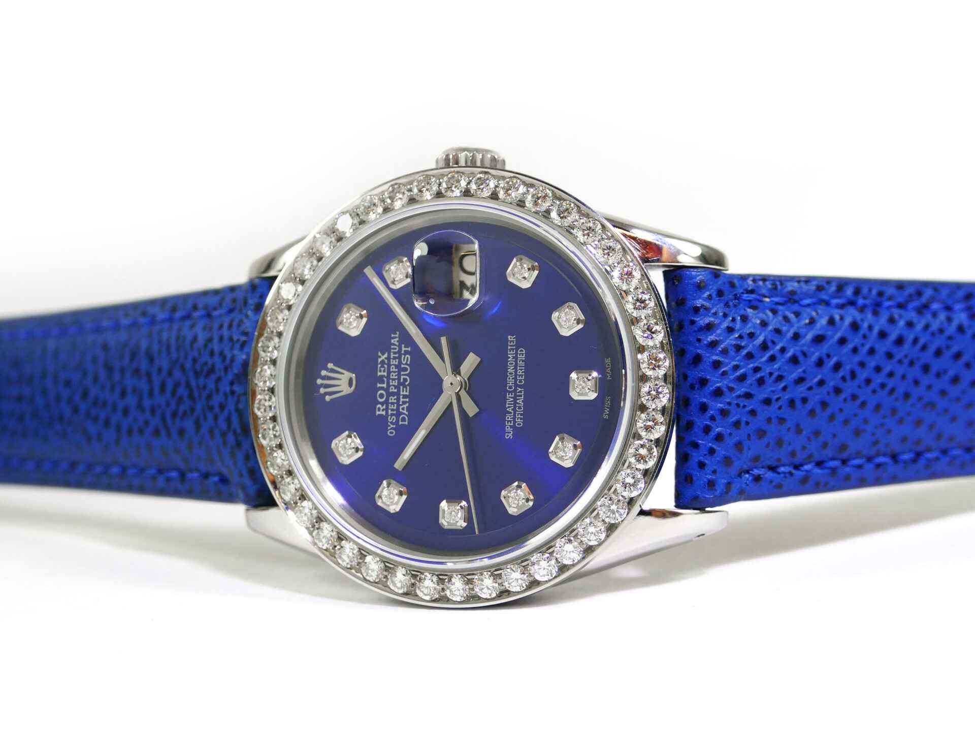 This Rolex is in excellent condition and features a custom Blue Diamond Dial, and a Custom 2 Carat Diamond Bezel with VS Clarity, Colorless Diamonds. It comes on a beautiful Genuine Calfskin Blue Leather Strap, and ge...
