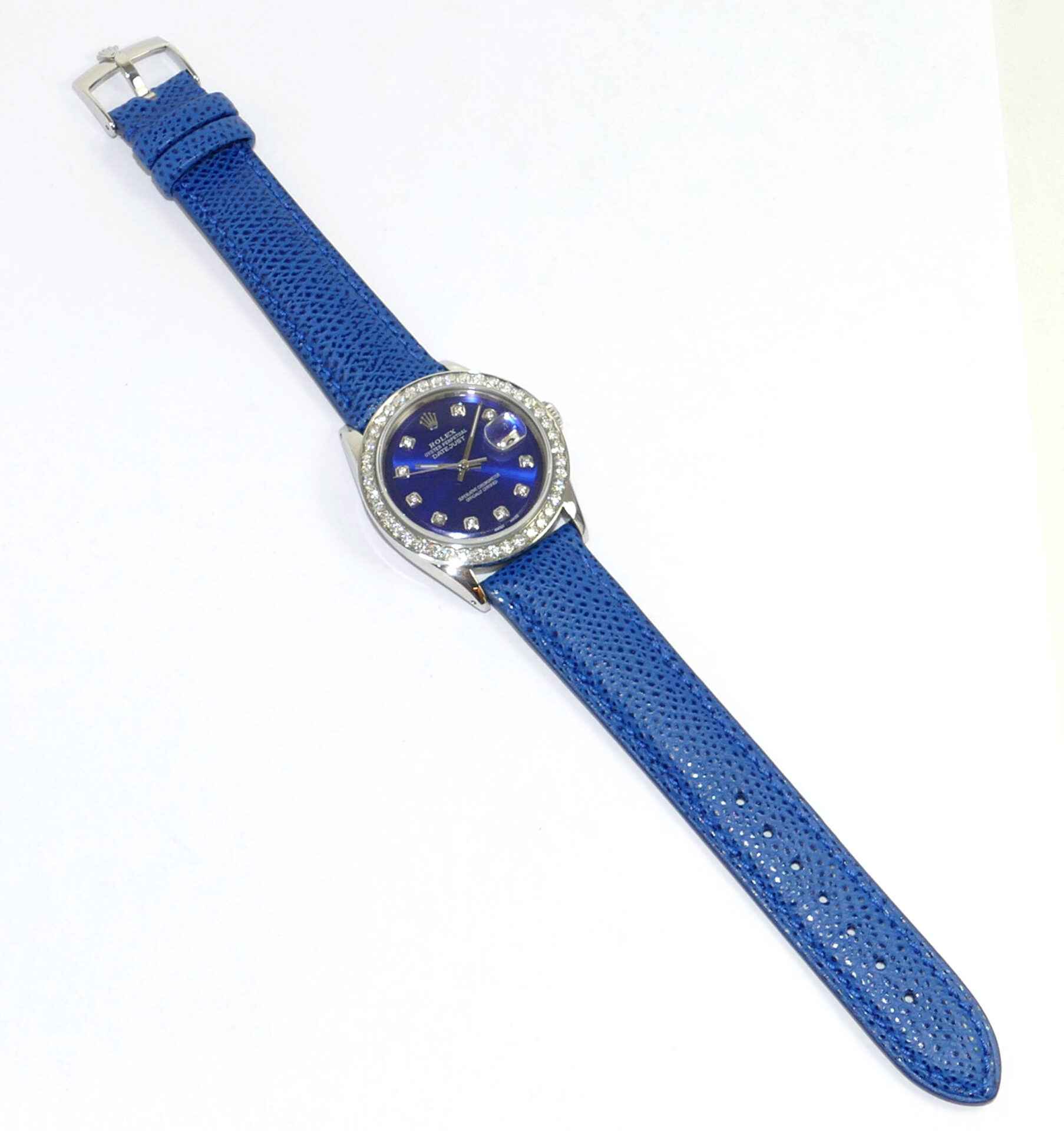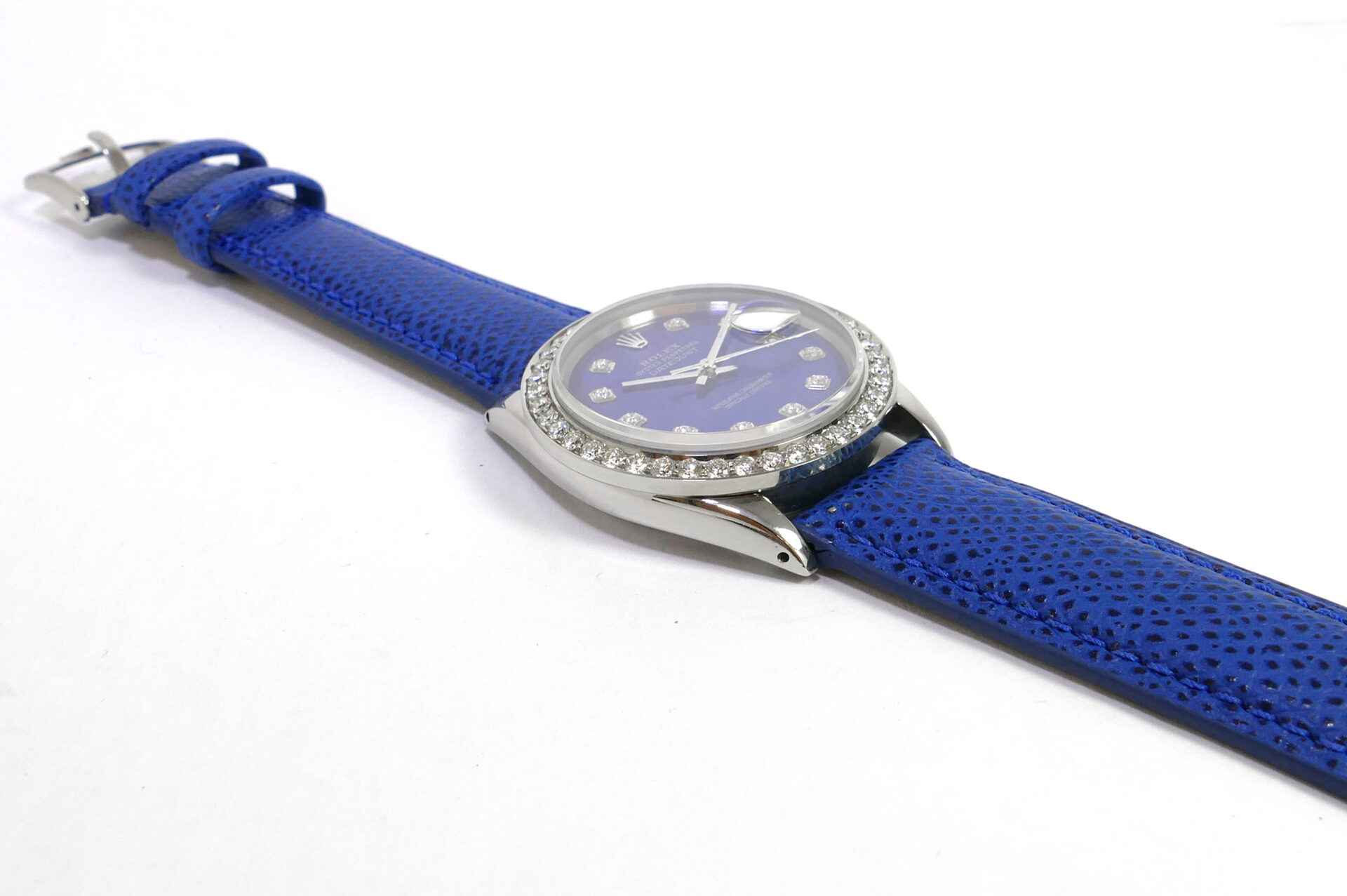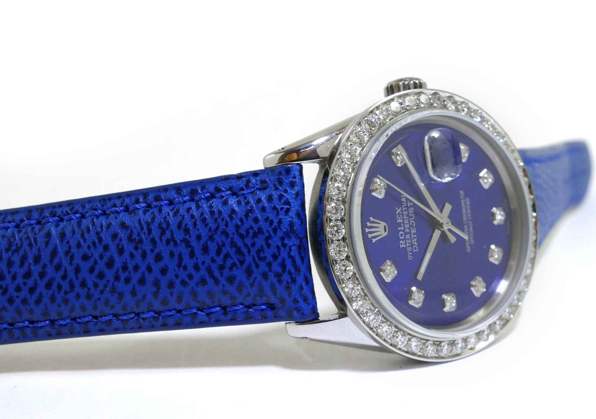 This Rolex is in excellent condition and features a custom Blue Diamond Dial, and a Custom 2 Carat Diamond Bezel with VS Clarity, Colorless Diamonds. It comes on a beautiful Genuine Calfskin Blue Leather Strap, and ge...