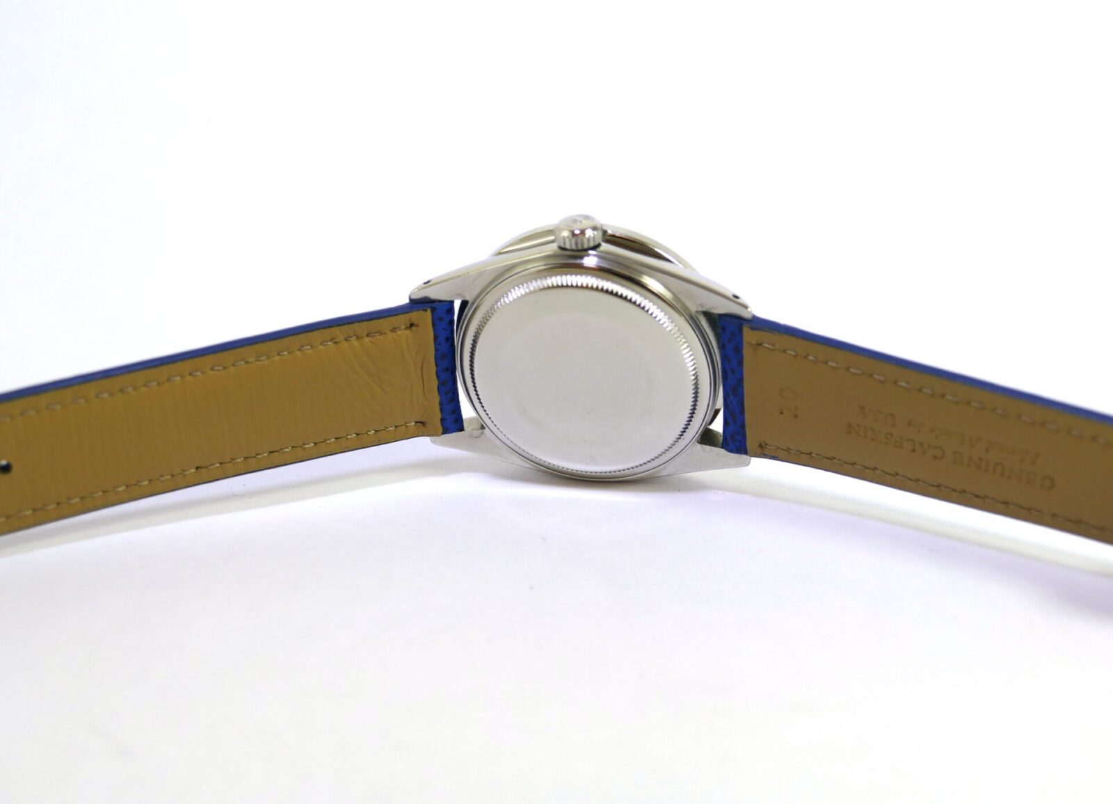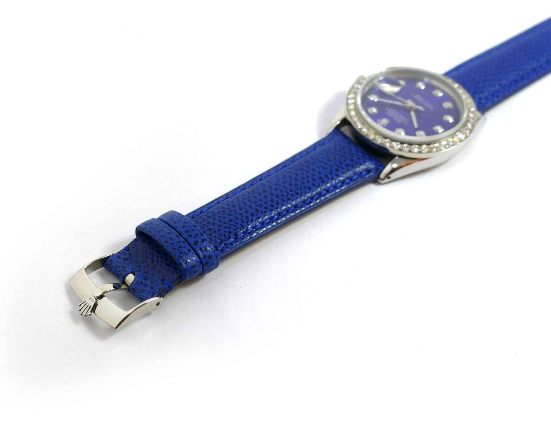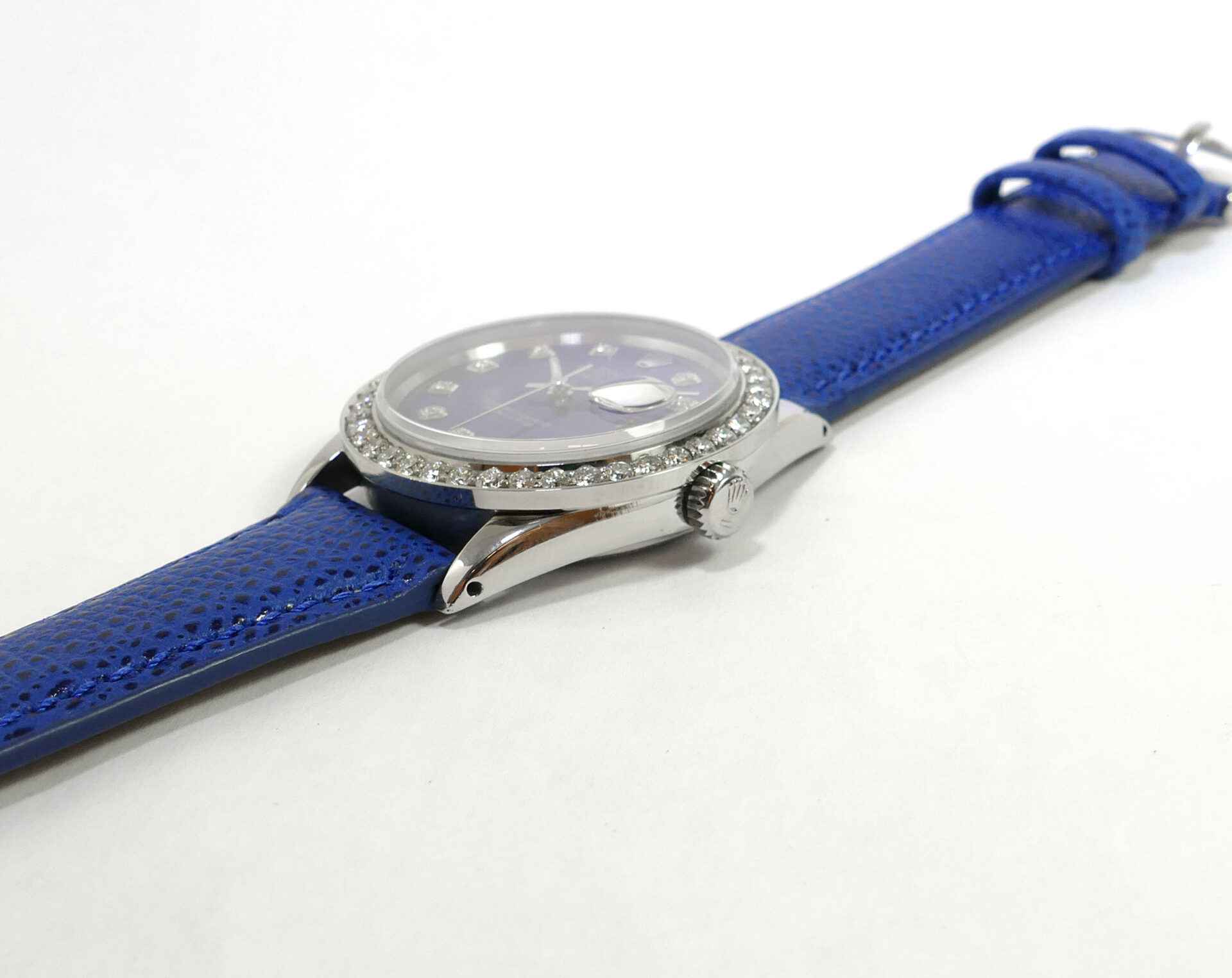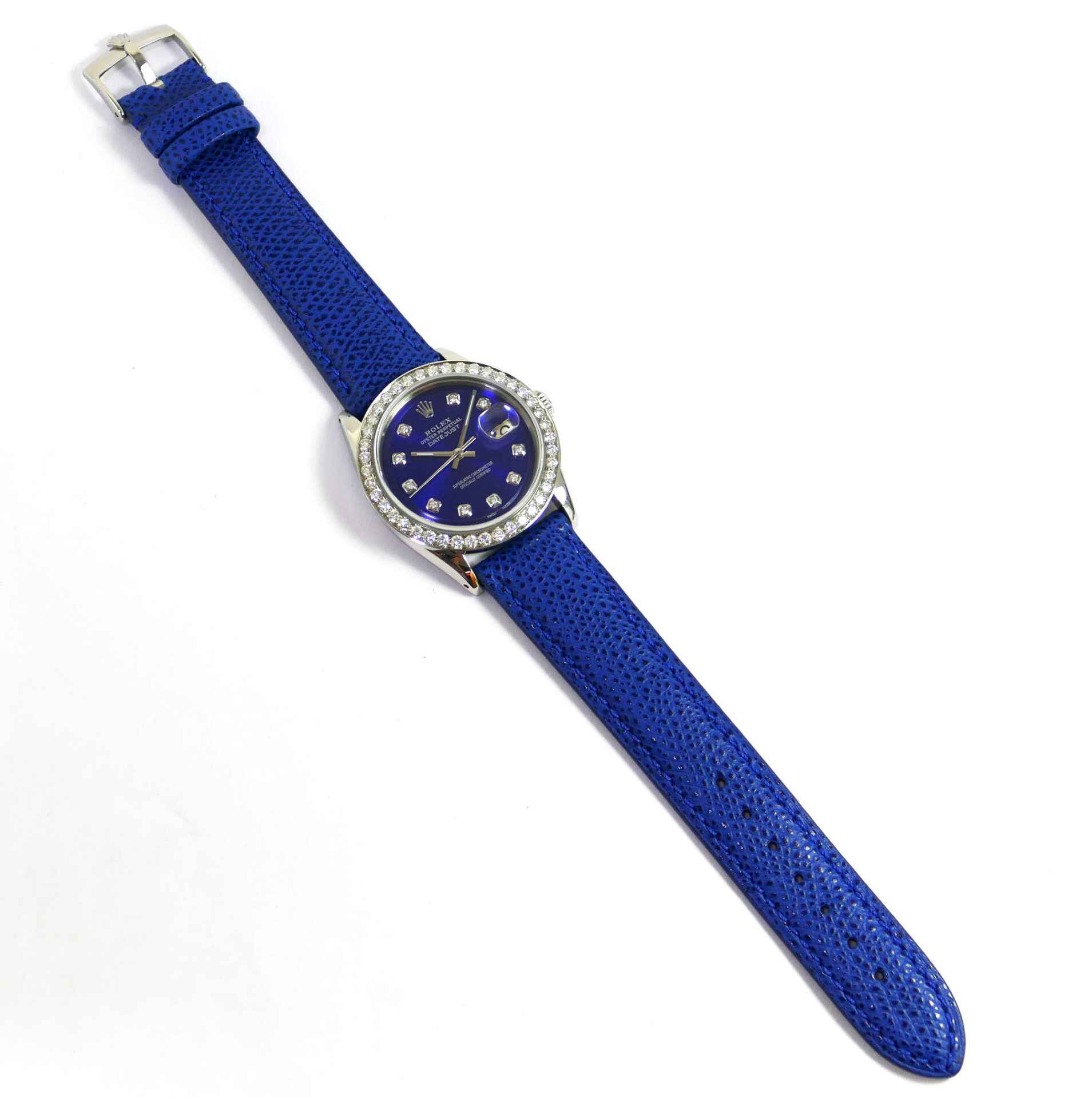 This Rolex is in excellent condition and features a custom Blue Diamond Dial, and a Custom 2 Carat Diamond Bezel with VS Clarity, Colorless Diamonds. It comes on a beautiful Genuine Calfskin Blue Leather Strap, and ge...