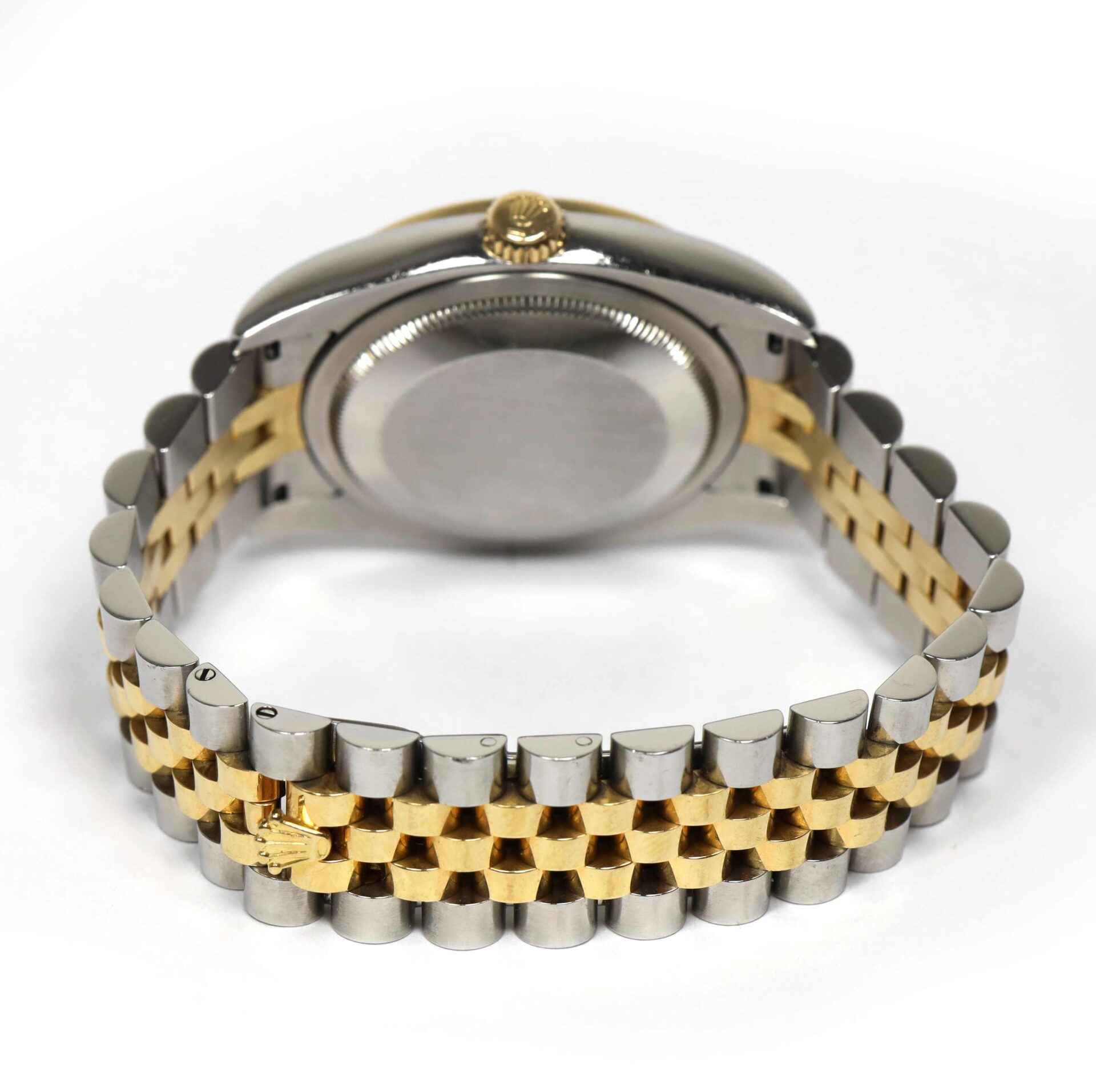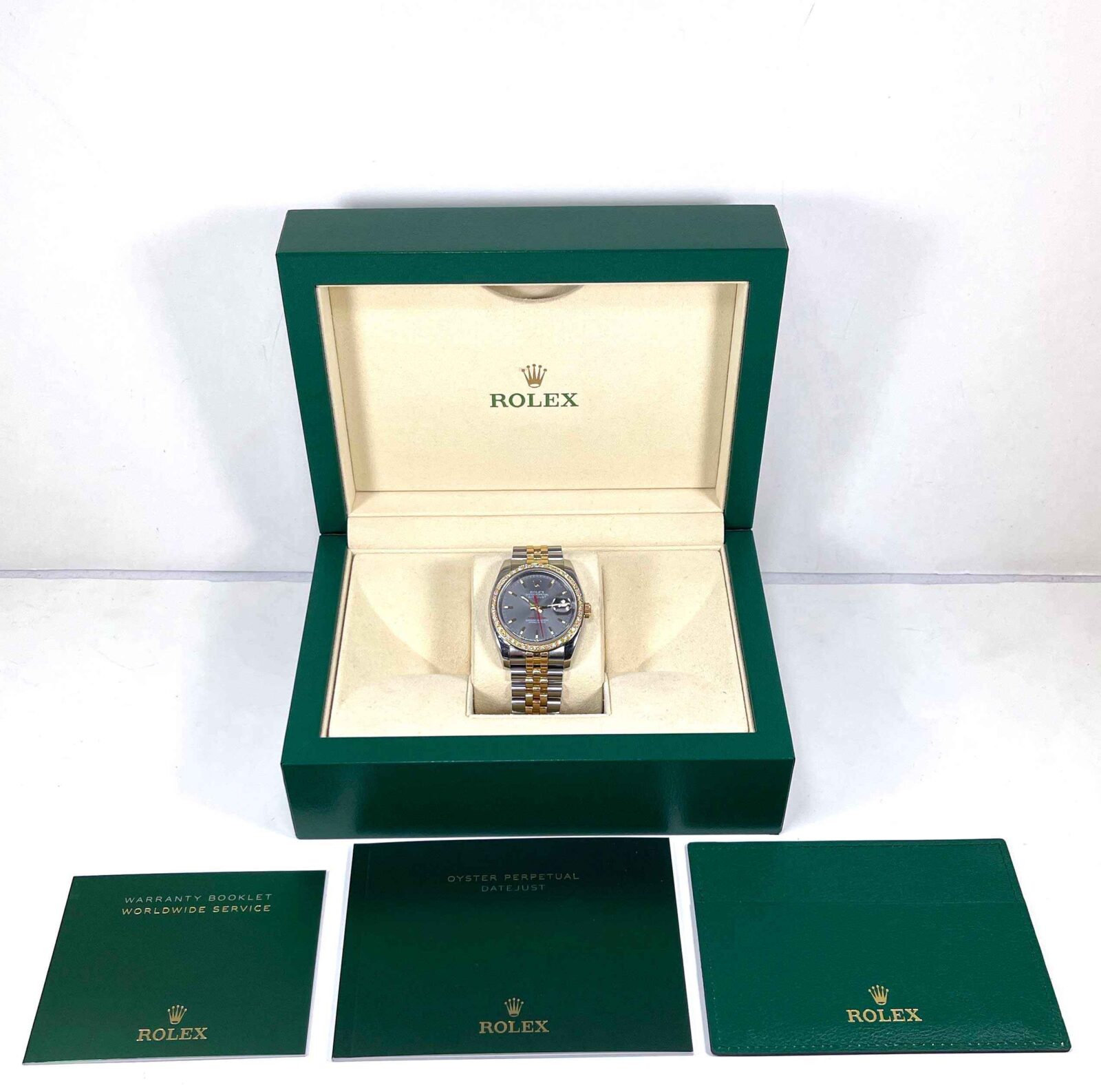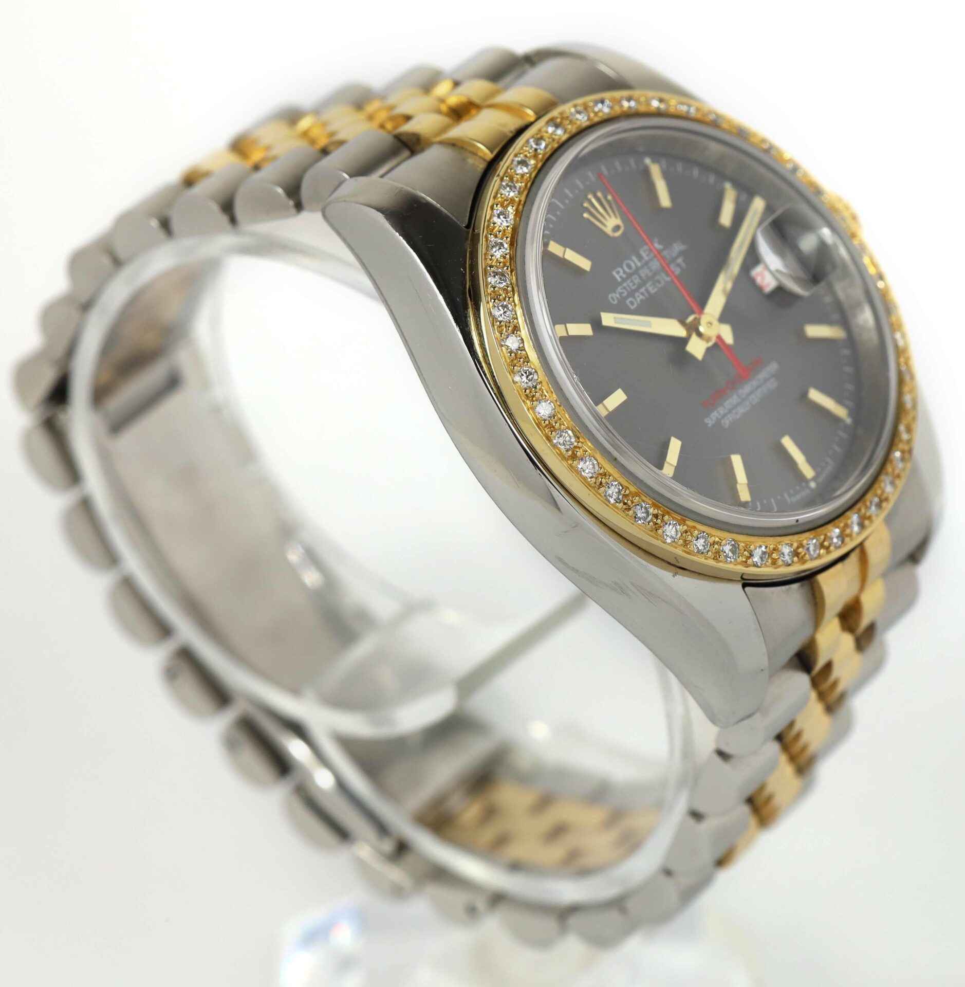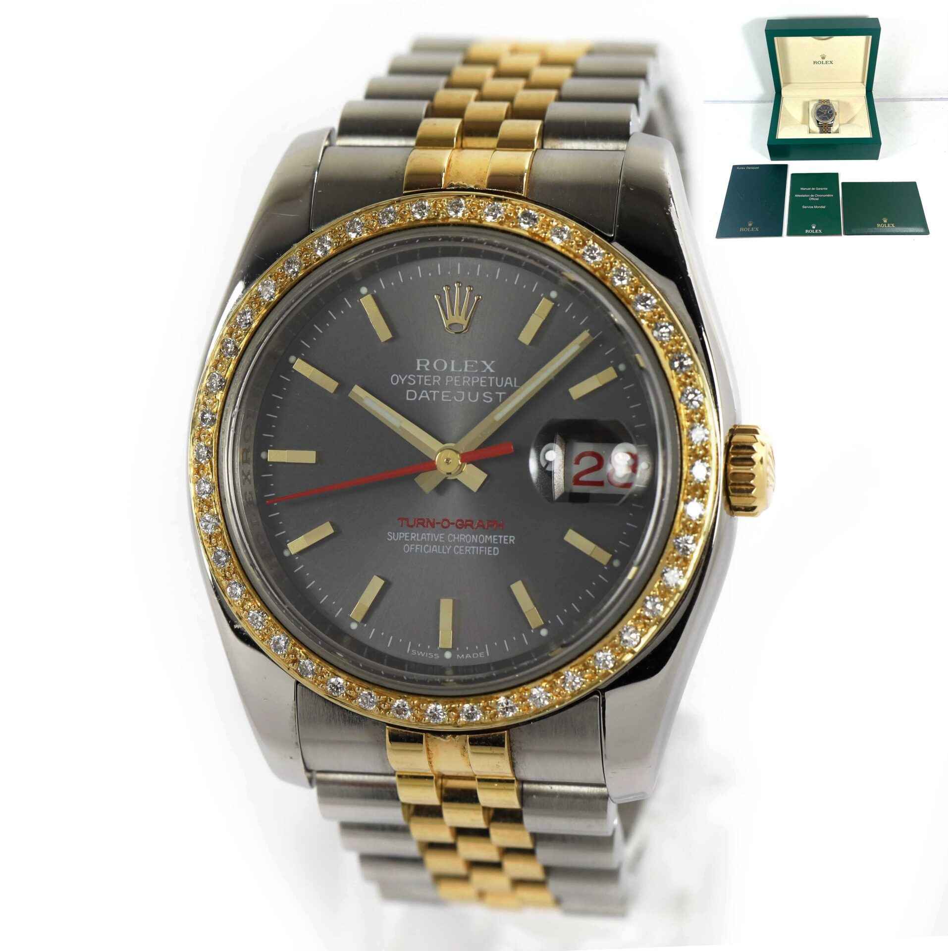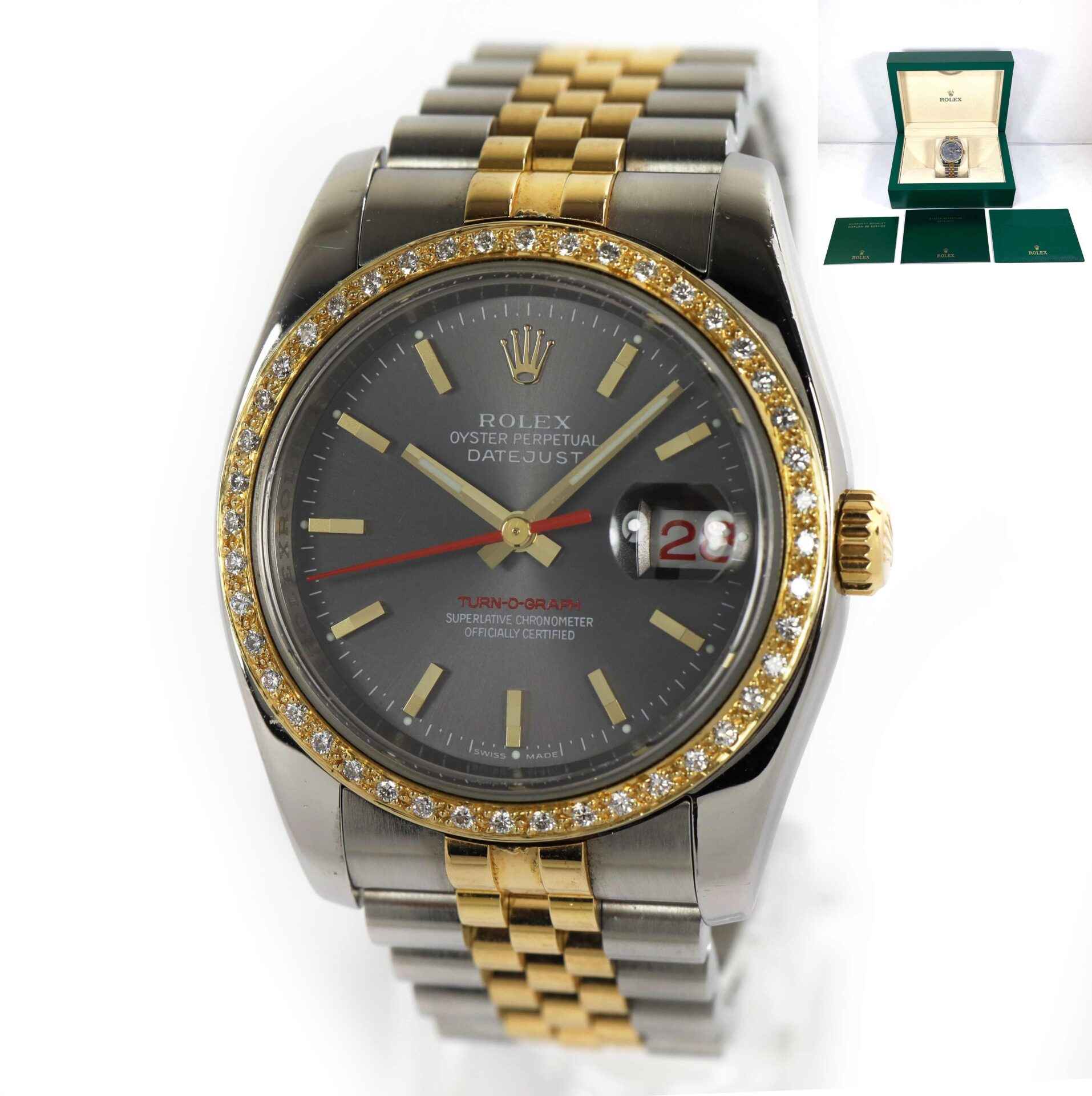 This Rolex is in excellent condition and comes with its box and booklets as shown in the photos attached. This watch features a stainless steel case surrounding a grey index dial with an 18k yellow gold diamond bezel and...