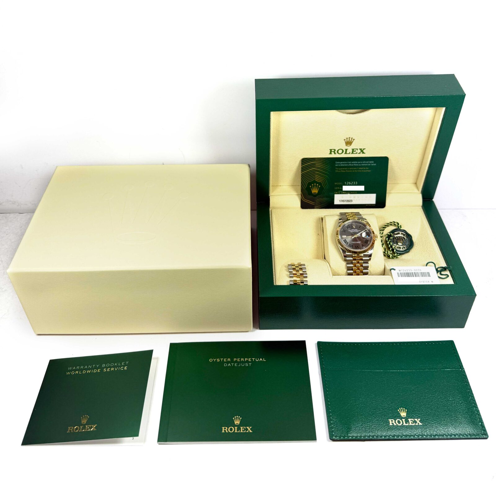 this rolex is in excellent overall condition and comes with its box, booklets, hang tags, spare links, and warranty card dated july 17th, 2023 as shown in the pictures attached. This watch is in stock and available to ship immediately!