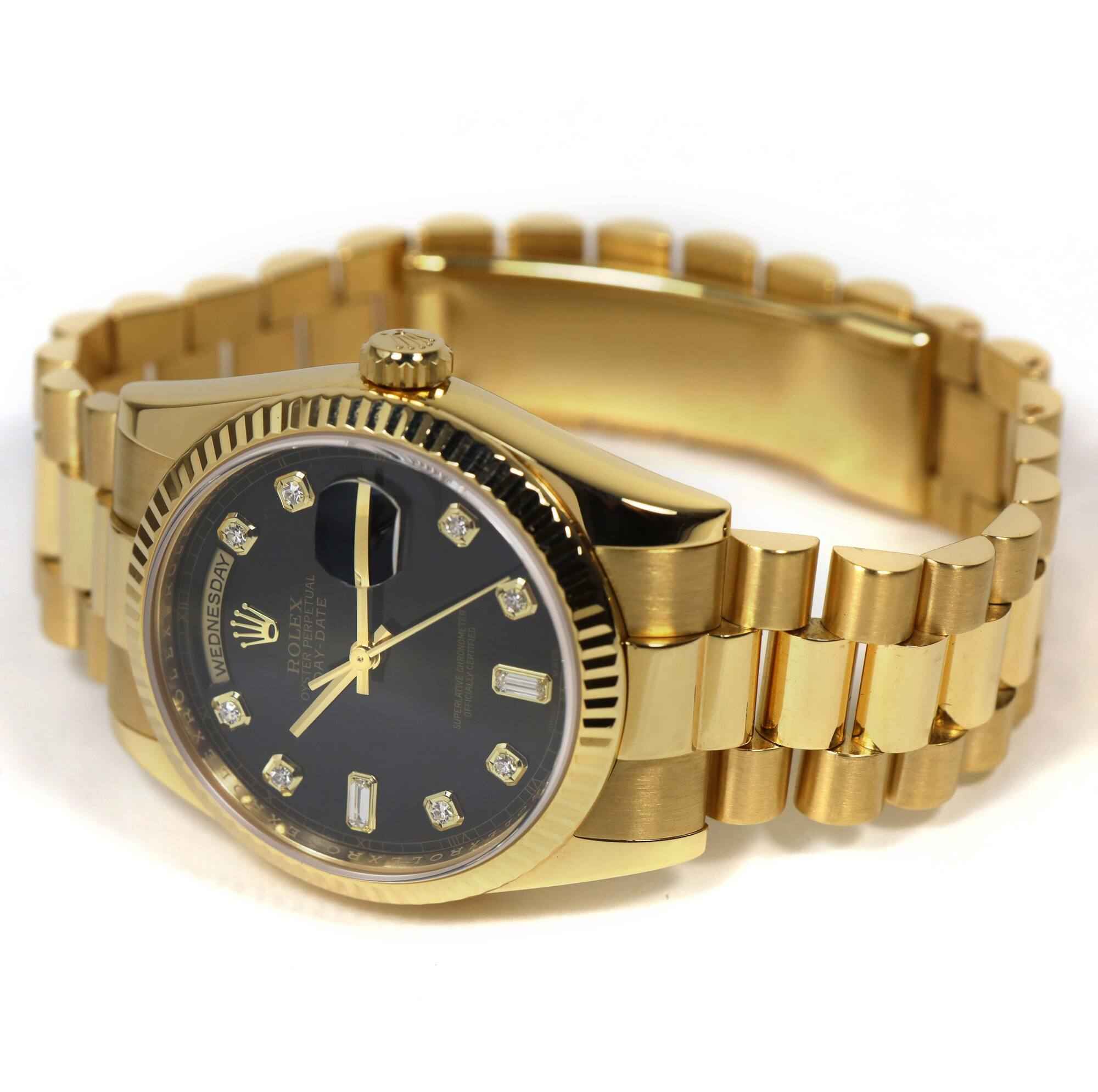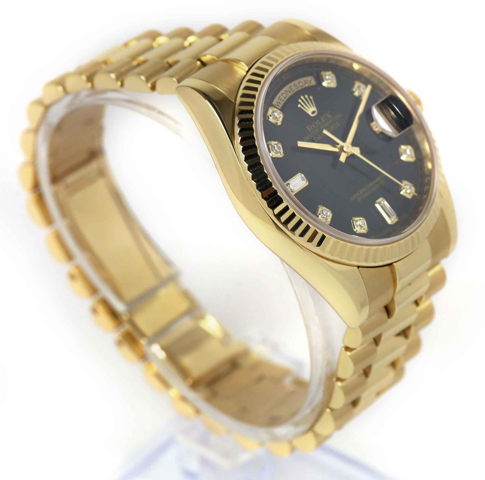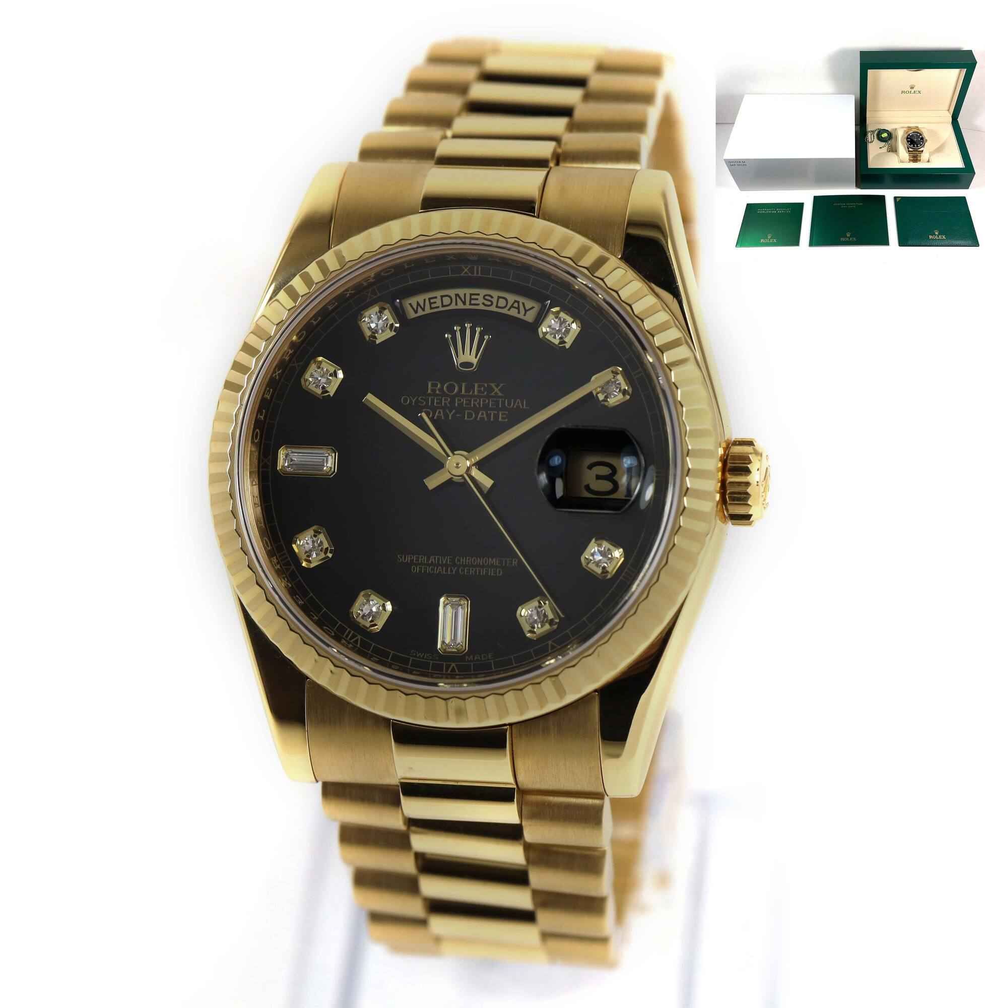 THIS ROLEX IS IN EXCELLENT CONDITION AND COMES WITH ITS BOX, BOOKLETS, AND HANG TAG ONLY AS SHOWN IN THE PICTURES ATTACHED. THIS WATCH FEATURES A 36MM 18K YELLOW GOLD CASE THAT SURROUNDS A FACTORY BLACK DIAMOND DIAL AND COMES ON A YELLOW GOLD PRESIDENT BAND...