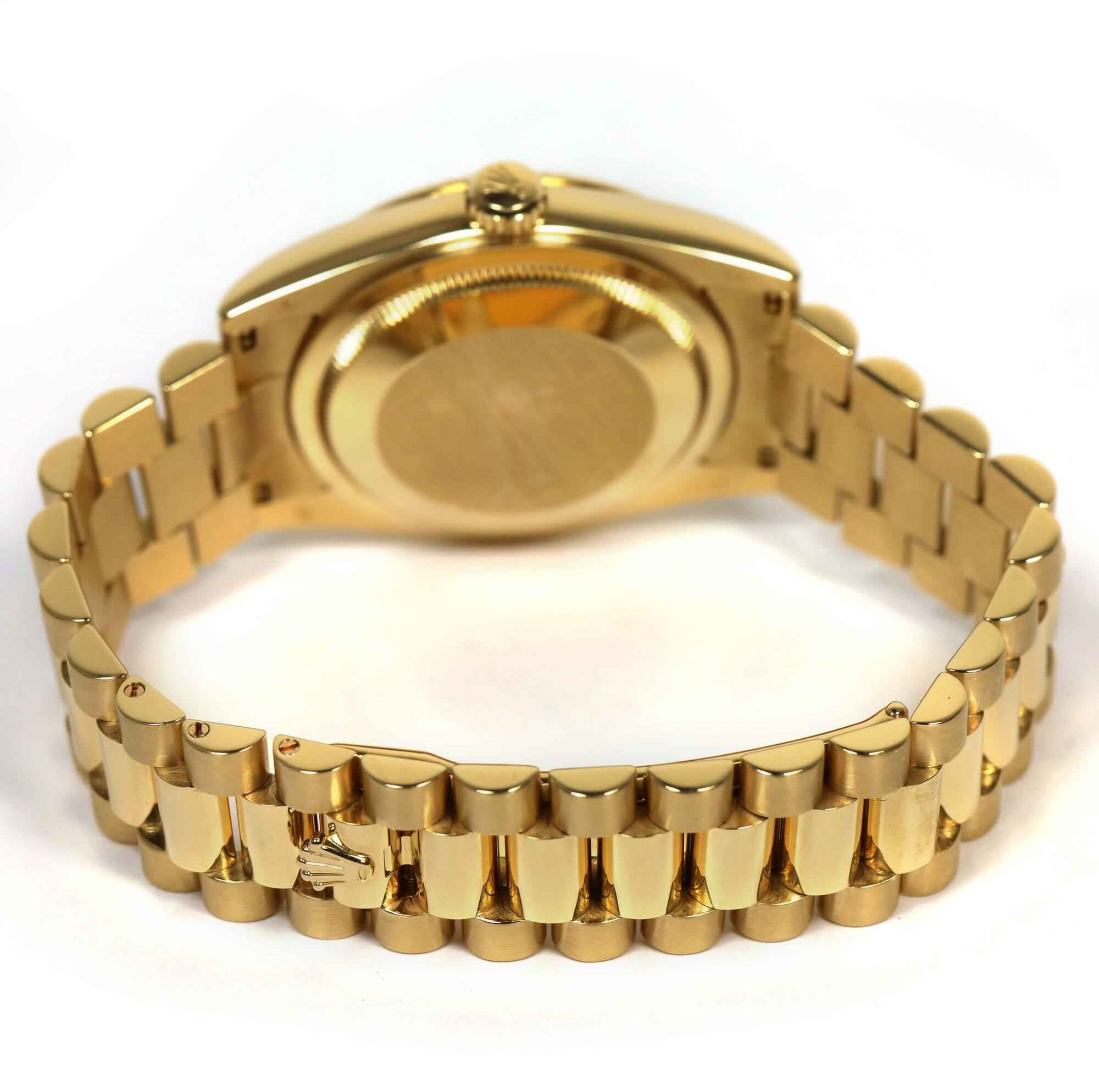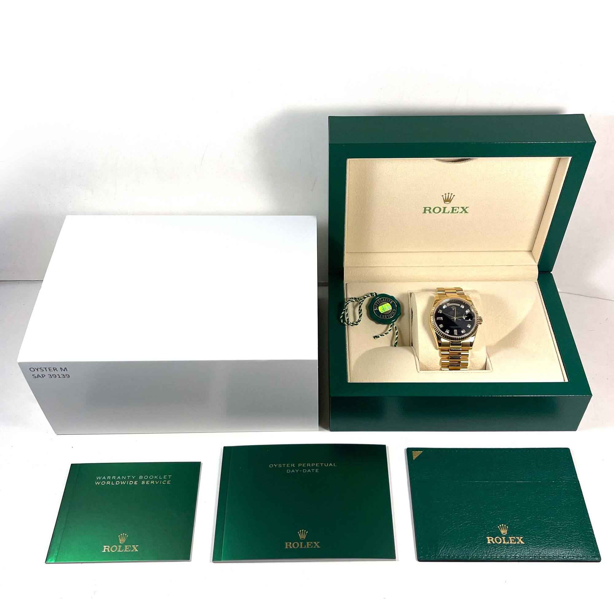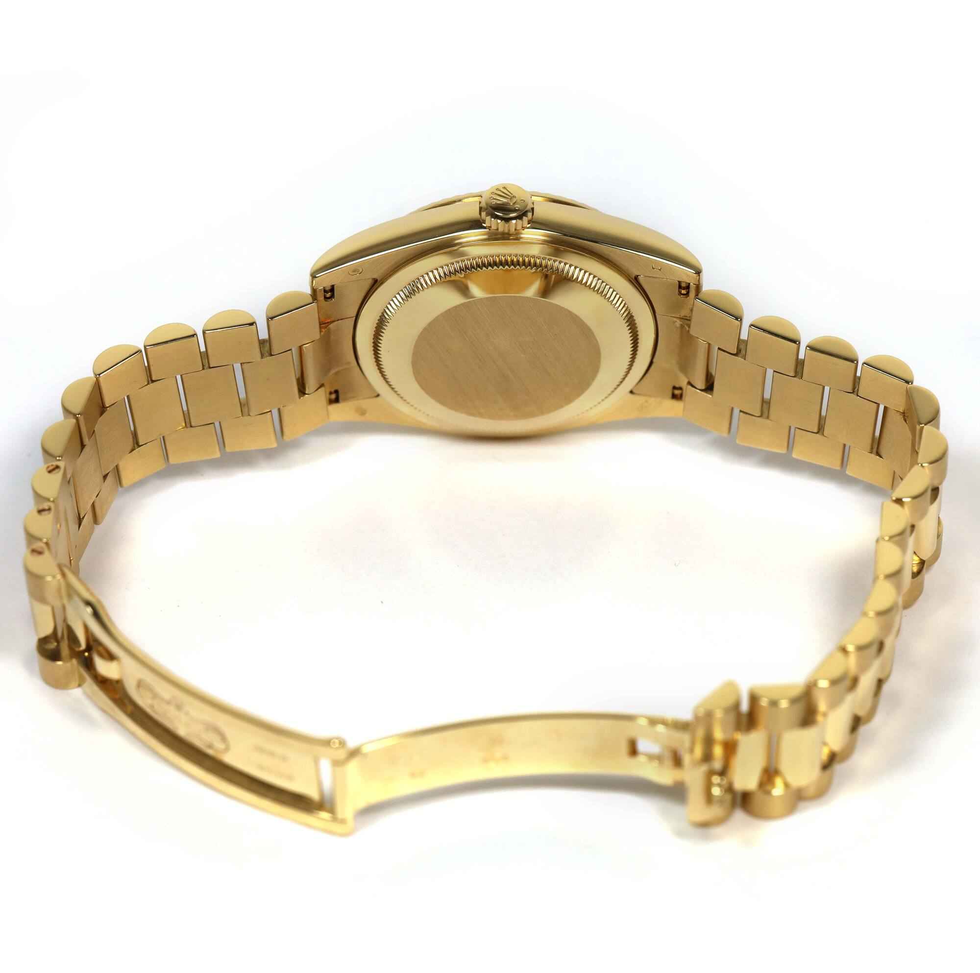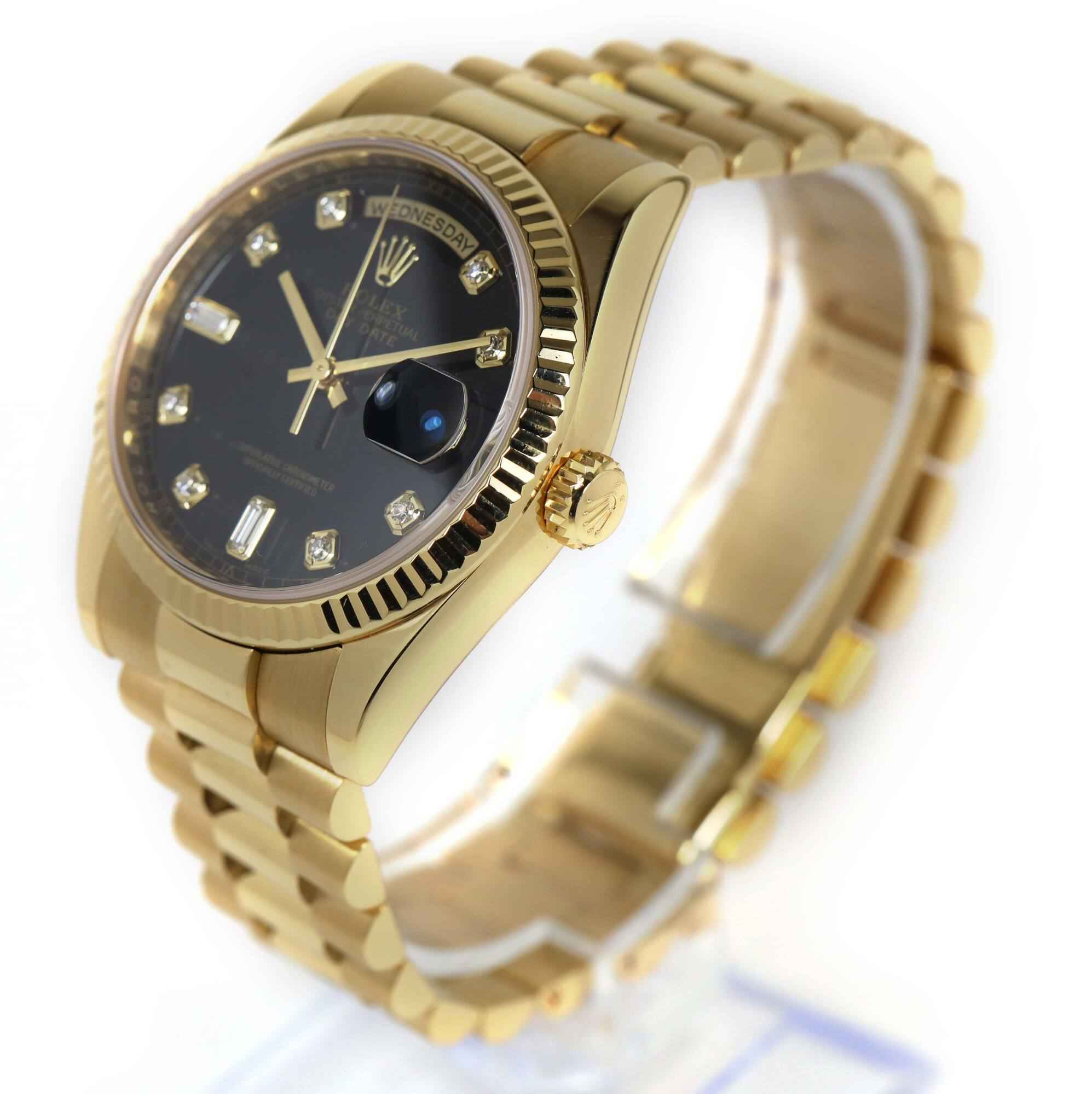 THIS ROLEX IS IN EXCELLENT CONDITION AND COMES WITH ITS BOX, BOOKLETS, AND HANG TAG ONLY AS SHOWN IN THE PICTURES ATTACHED. THIS WATCH FEATURES A 36MM 18K YELLOW GOLD CASE THAT SURROUNDS A FACTORY BLACK DIAMOND DIAL AND COMES ON A YELLOW GOLD PRESIDENT BAND...