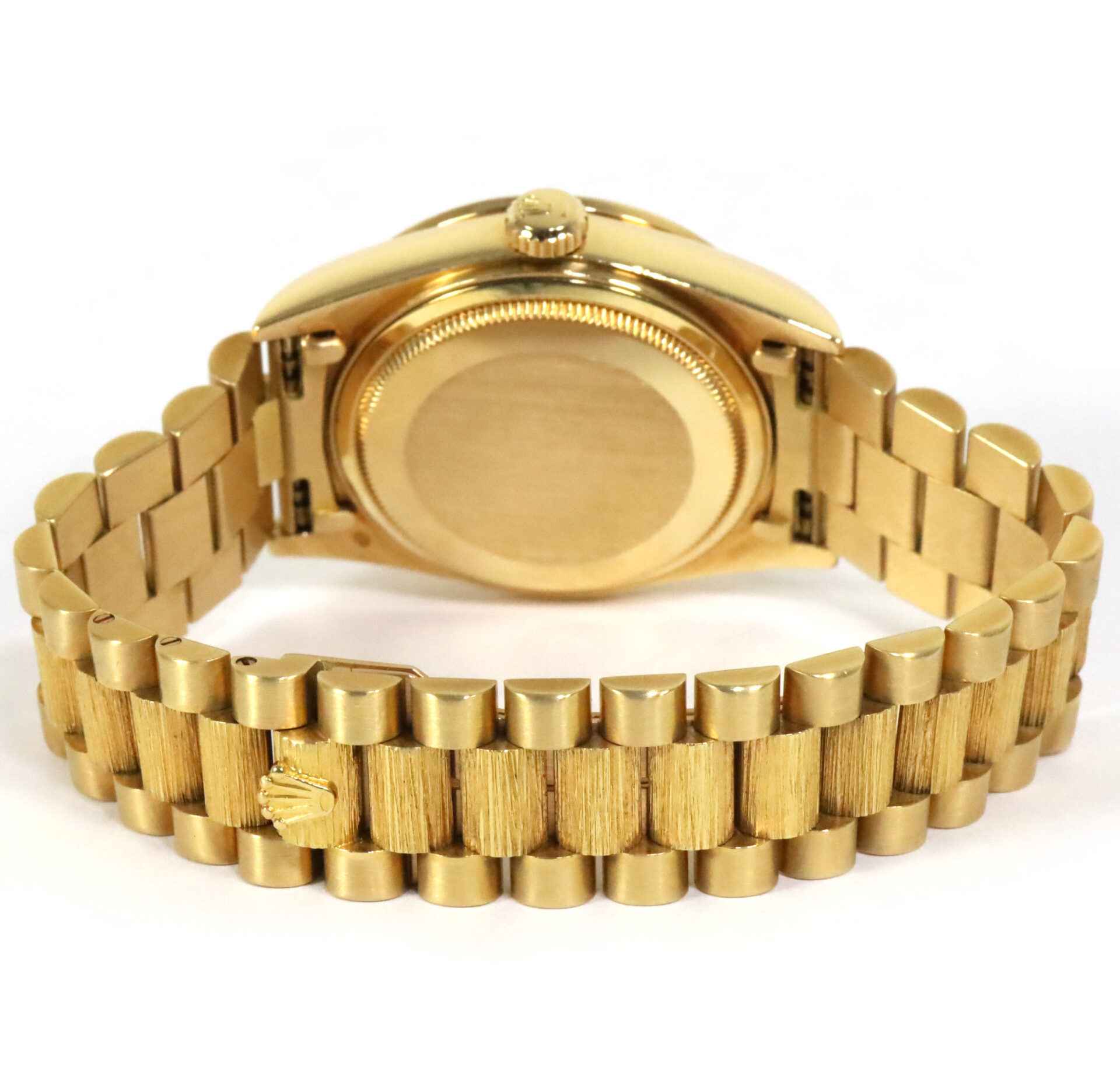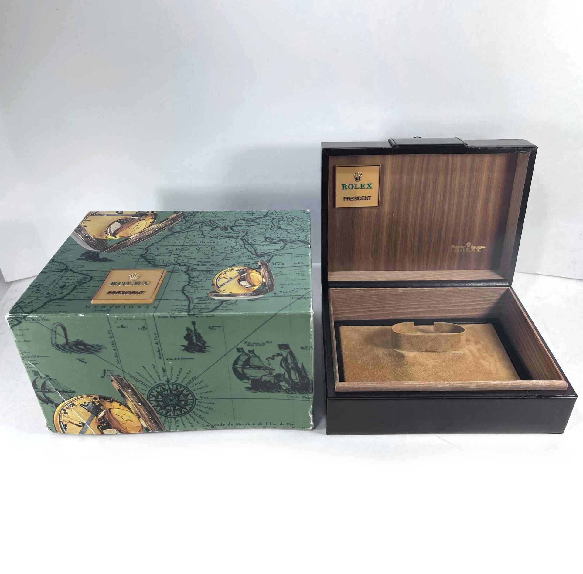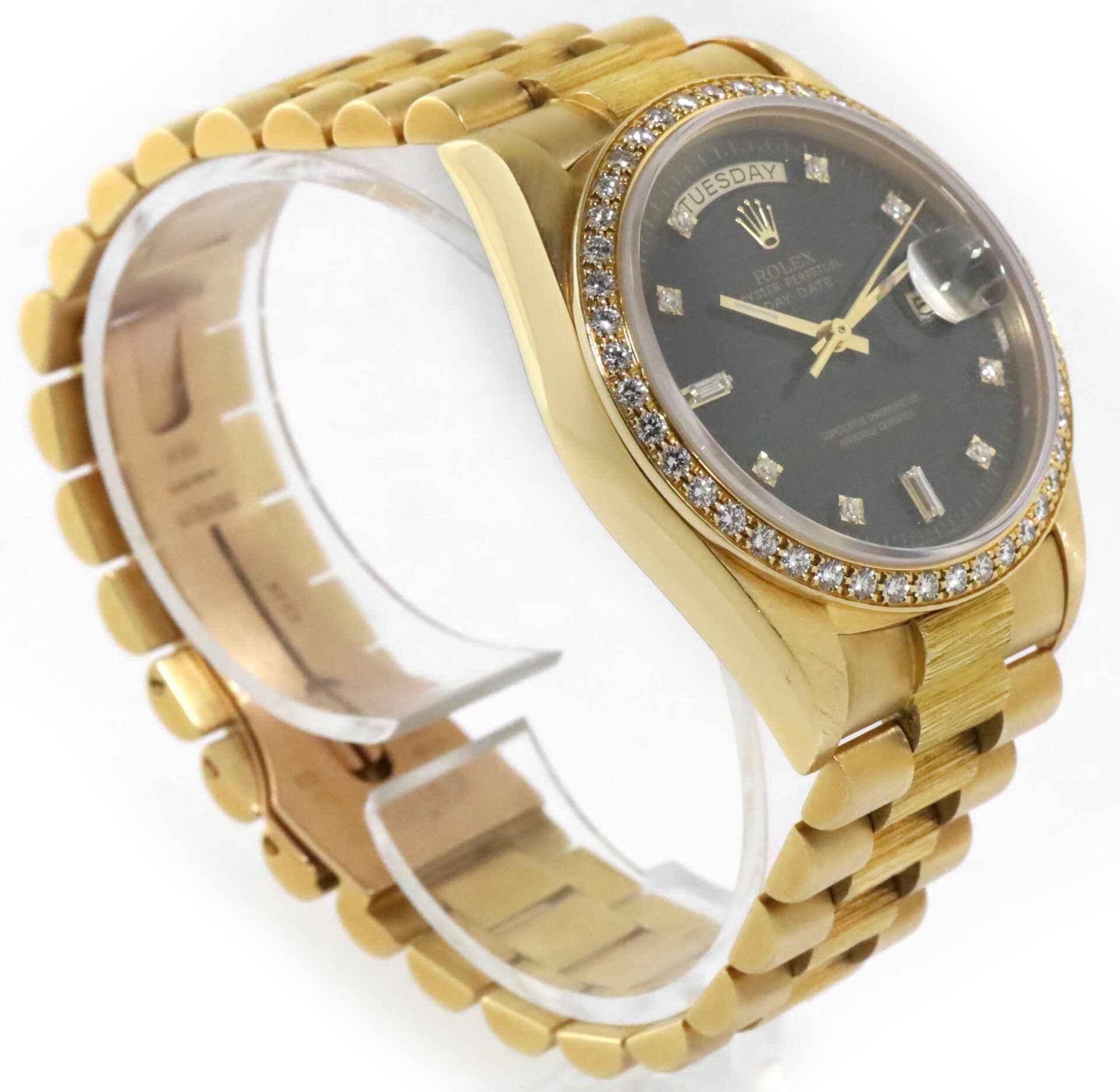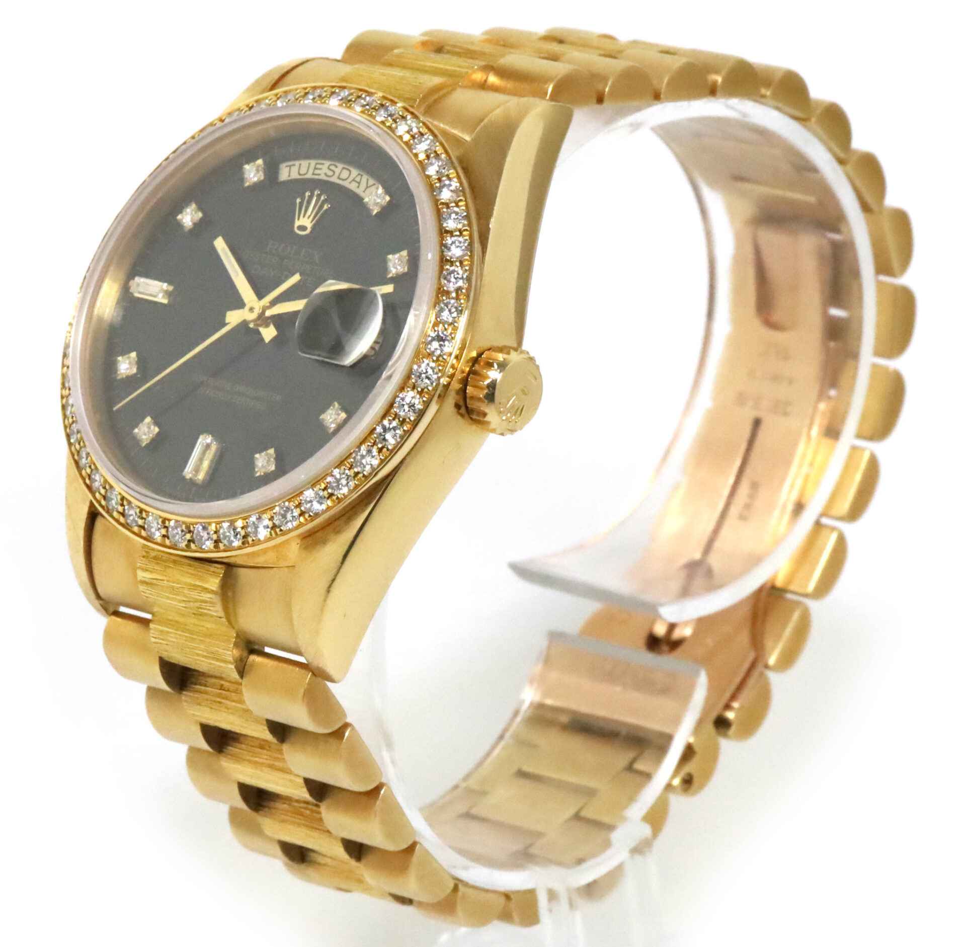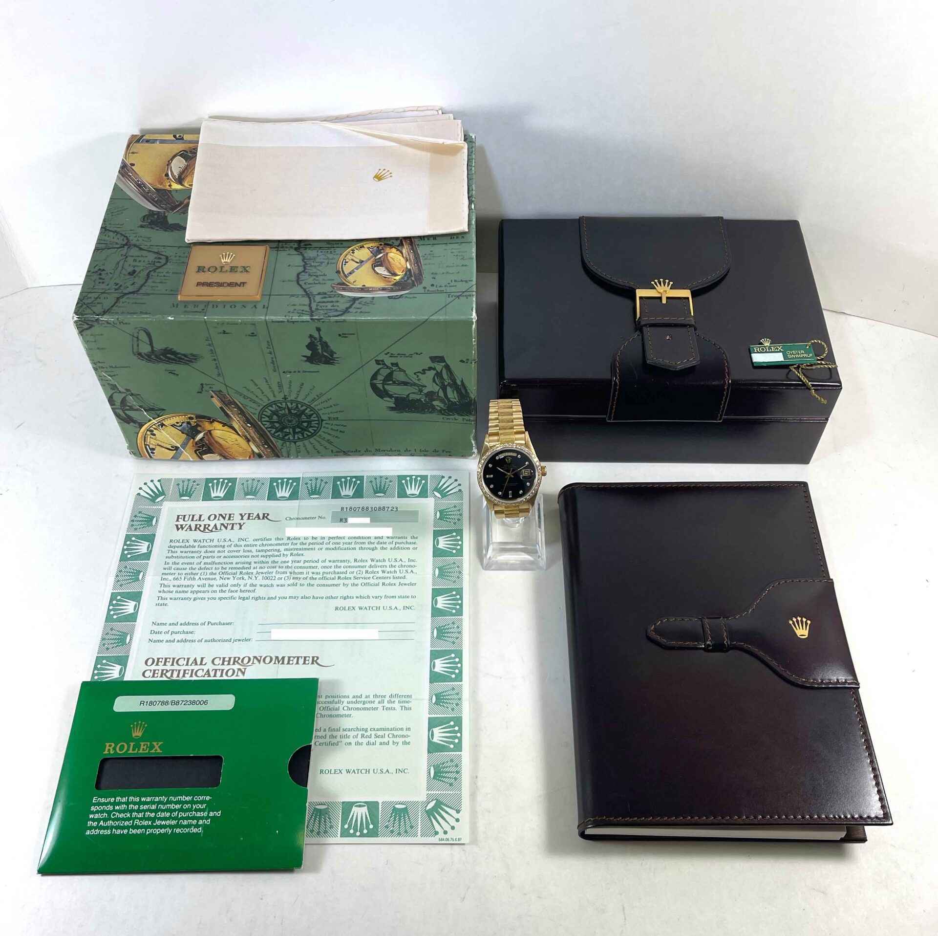 Read Morethis rolex is in excellent condition and comes with box, papers, hang tag, and warranty papers. This watch has a serial number that begins with r3 which dates the year of production to be approximately 1987. This rolex features an 18k yellow gold case that surrounds a black dial with factory diamond hour markers and factory bezel. the bracelet on this day-date is in great condition showing minimal wear for its age as shown in the photos attached. This rolex also comes with a rare box with the rolex president emblem on the interior and exterior of the boxes.