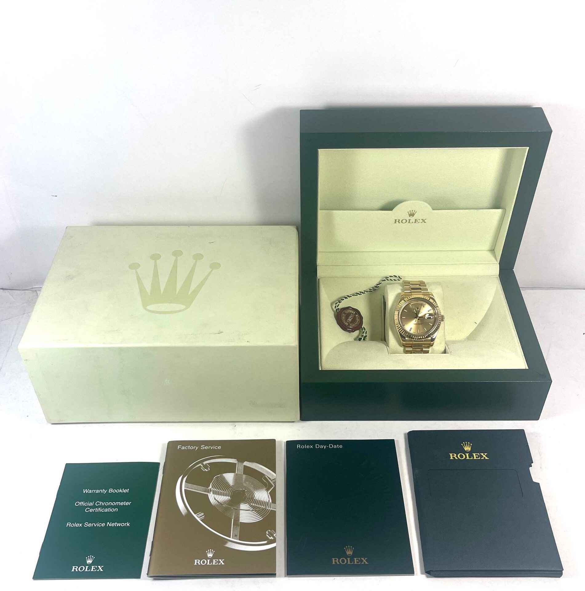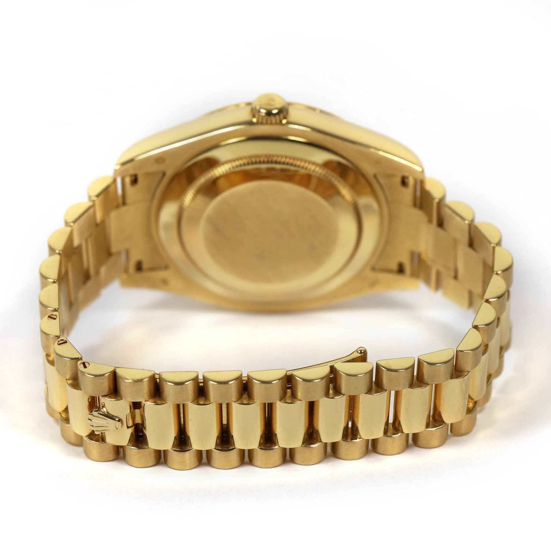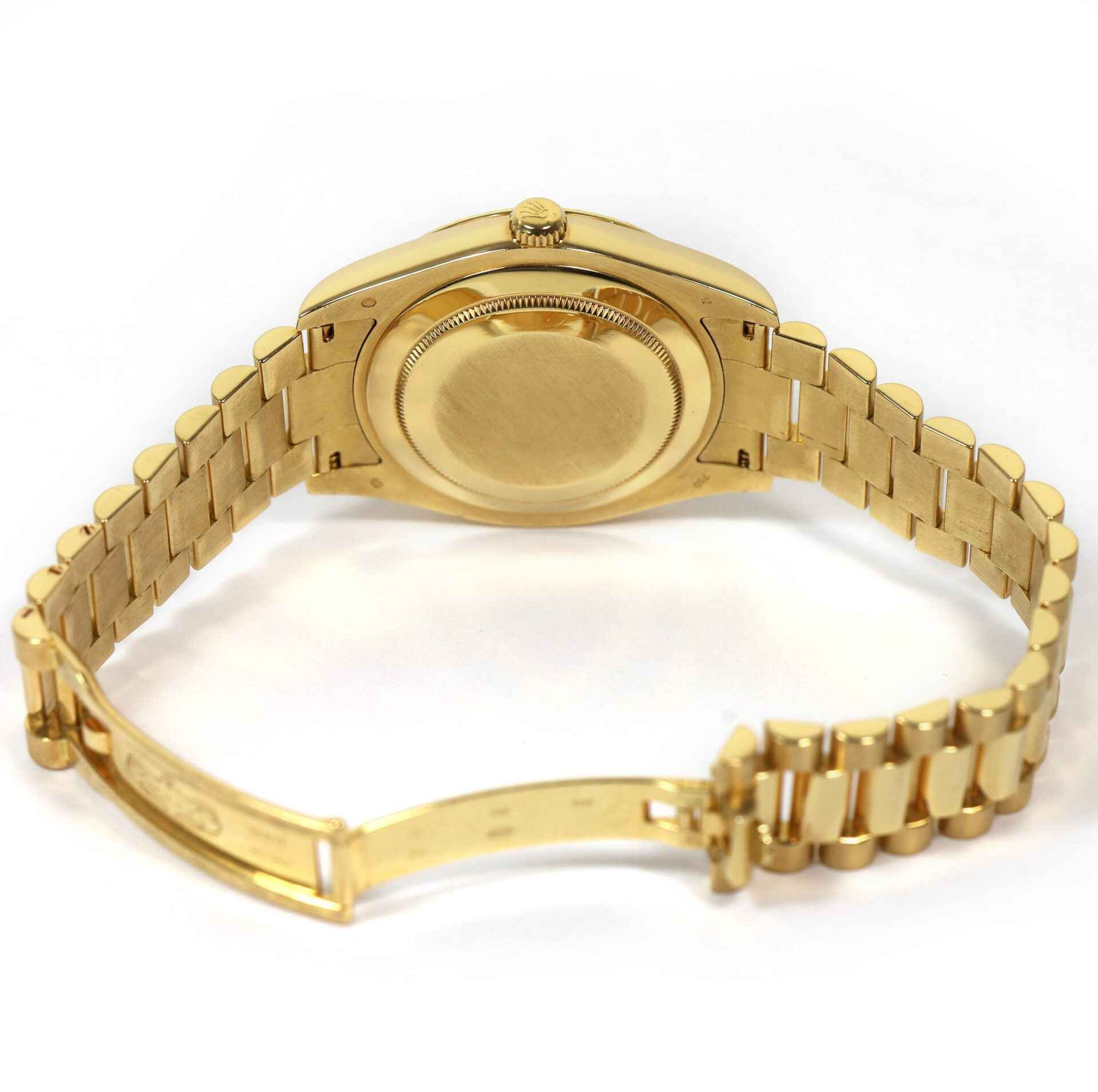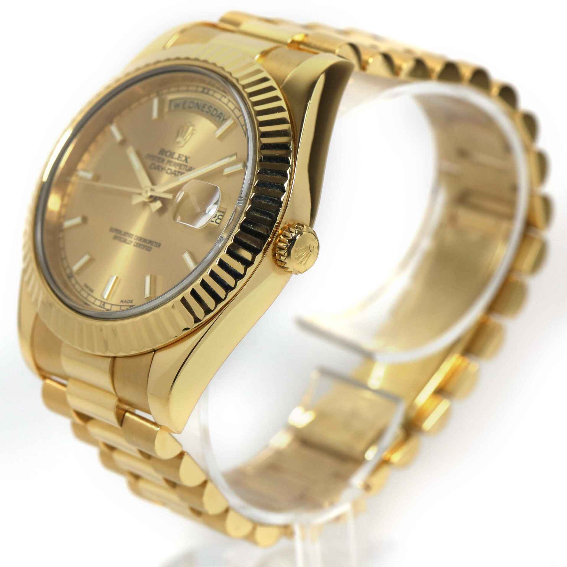 Read Morethis rolex is in excellent condition and comes with its box and booklets only as shown in the pictures attached. This watch features a 41mm gold case that surrounds a champagne index dial and comes on an 18k yellow gold president band. This watch is in stock and available to ship immediately!