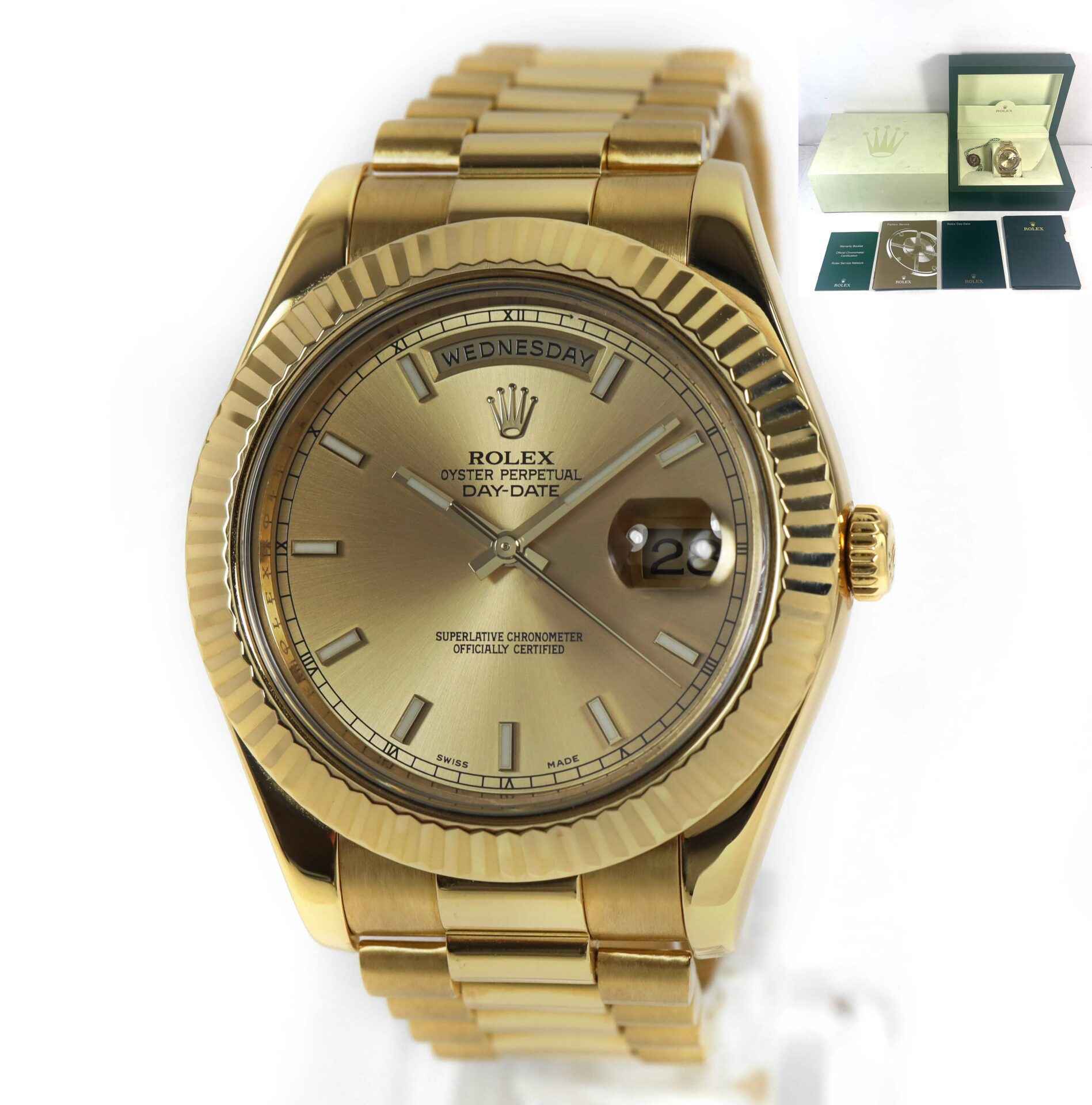 This Rolex is in excellent condition and comes with its box and booklets only as shown in the pictures attached. This watch features a 41mm gold case that surrounds a champagne index dial and comes on an 18k yellow gold ...