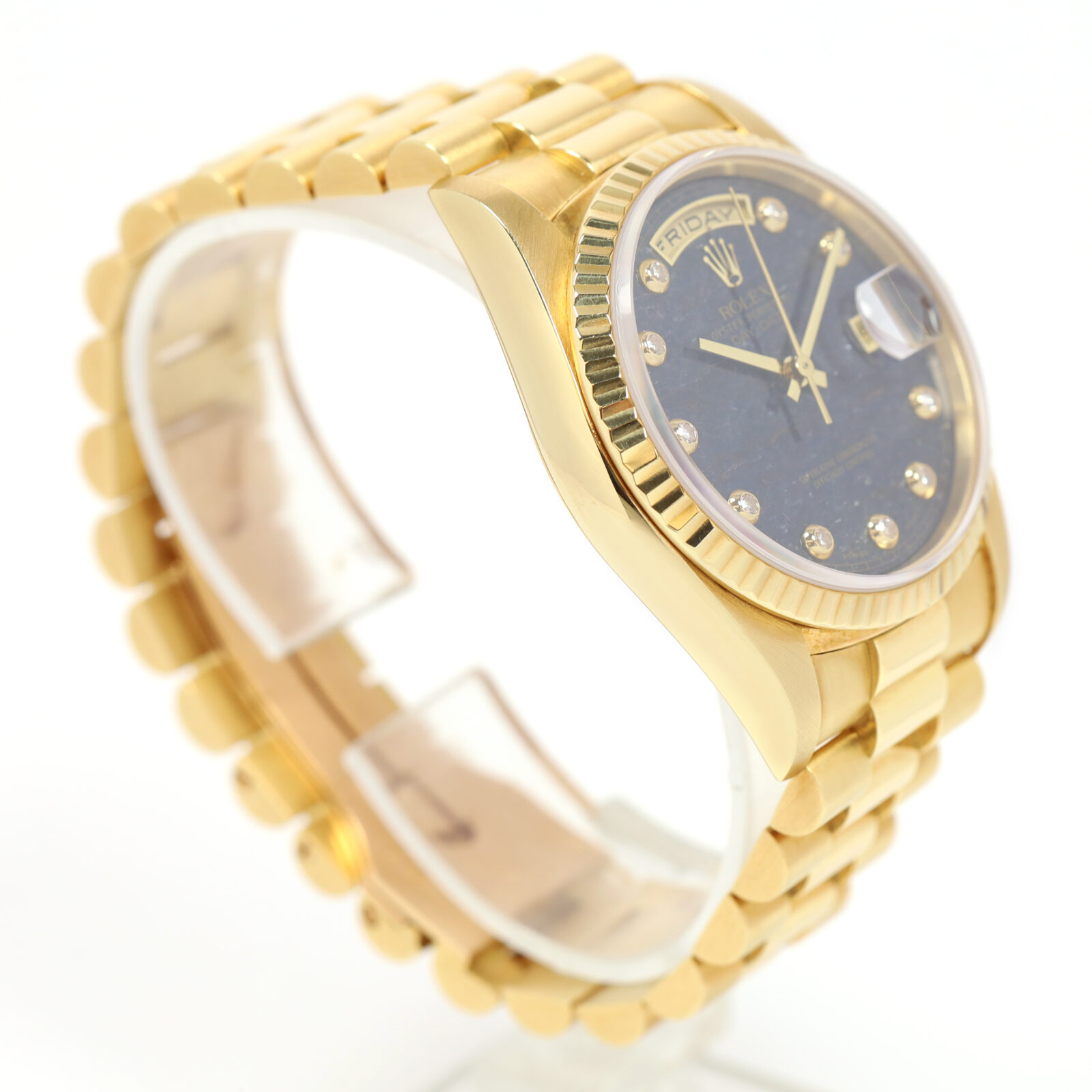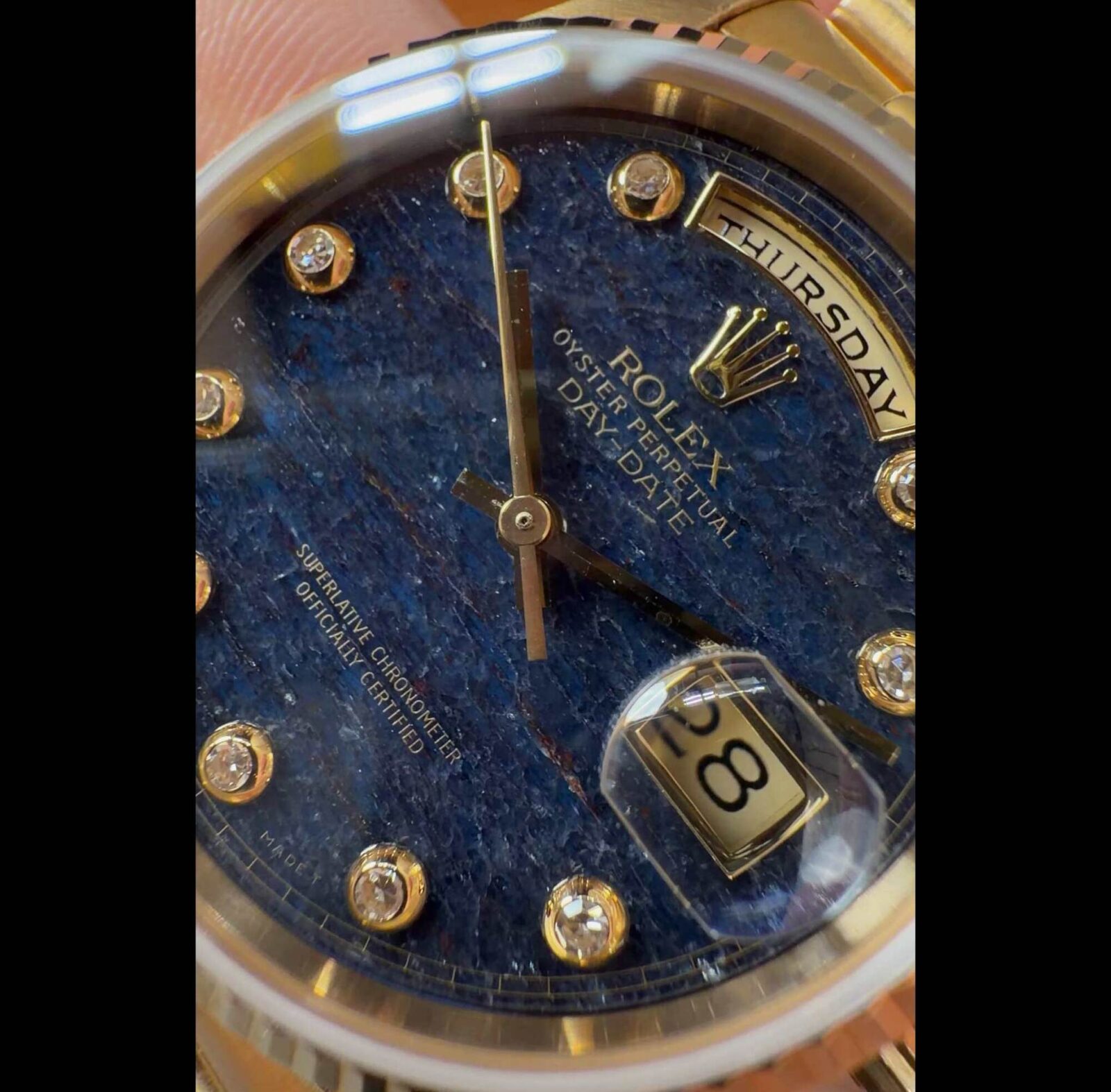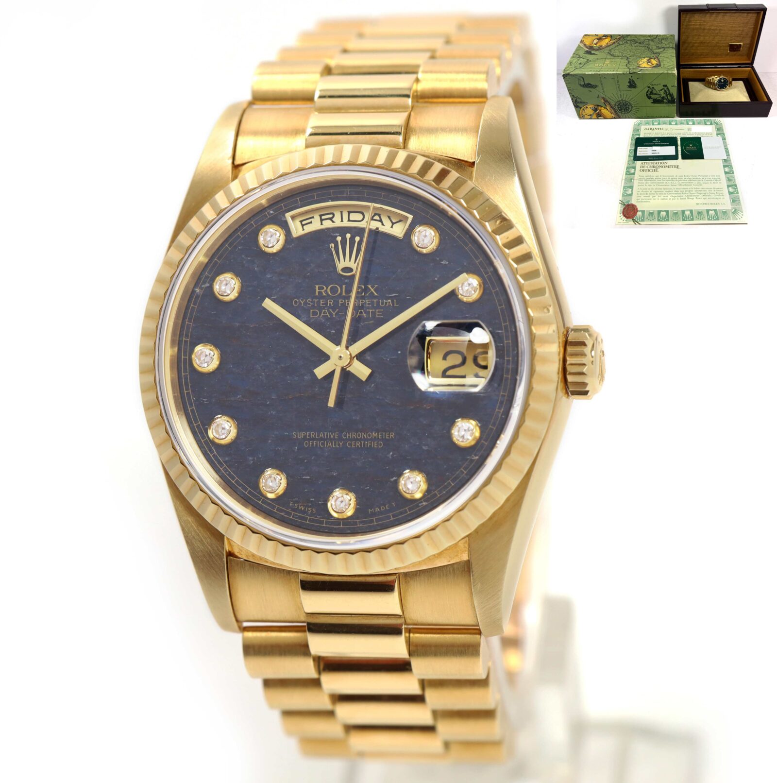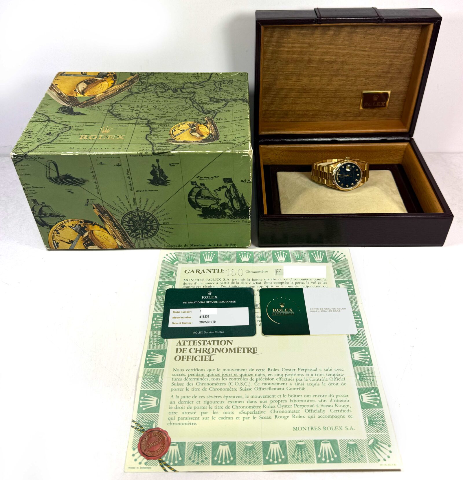 this rolex watch is in excellent overall condition and comes with its box, 2019 rolex service card, and warranty paper as shown in the pictures attached. This watch has a serial number beginning with e which dates the year of production to be approximately 1990. This watch is in stock and available to ship immediately!