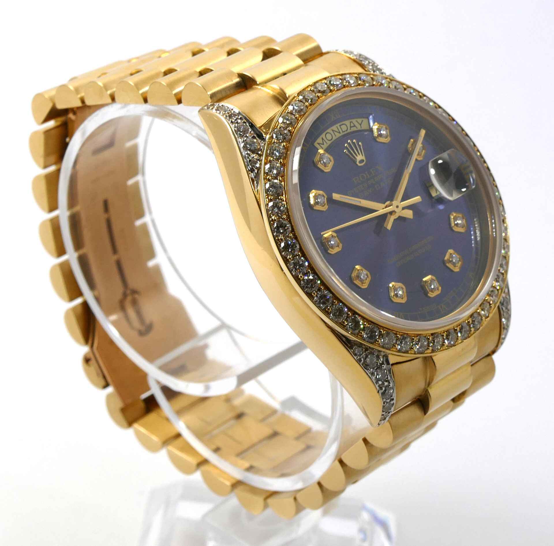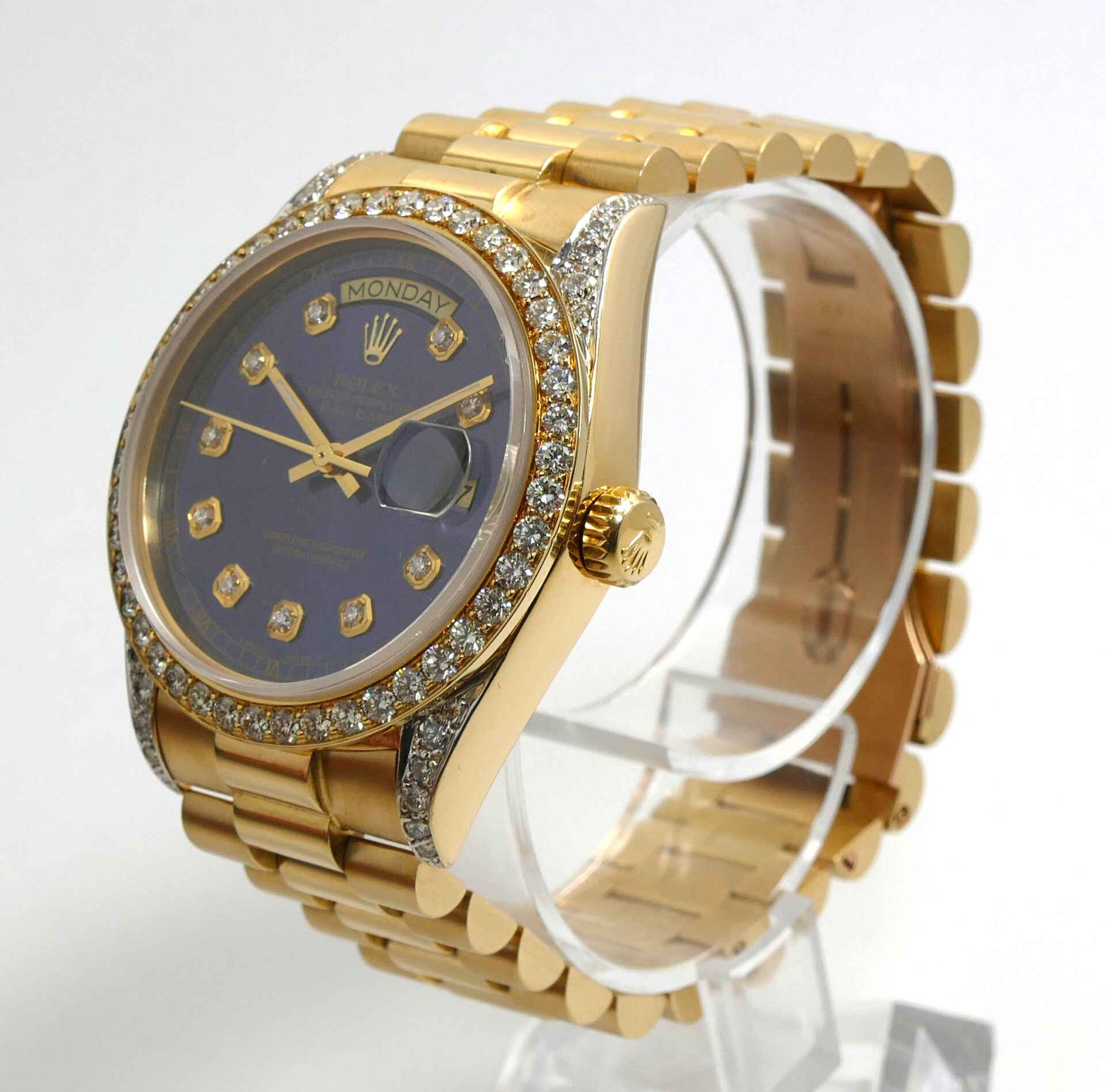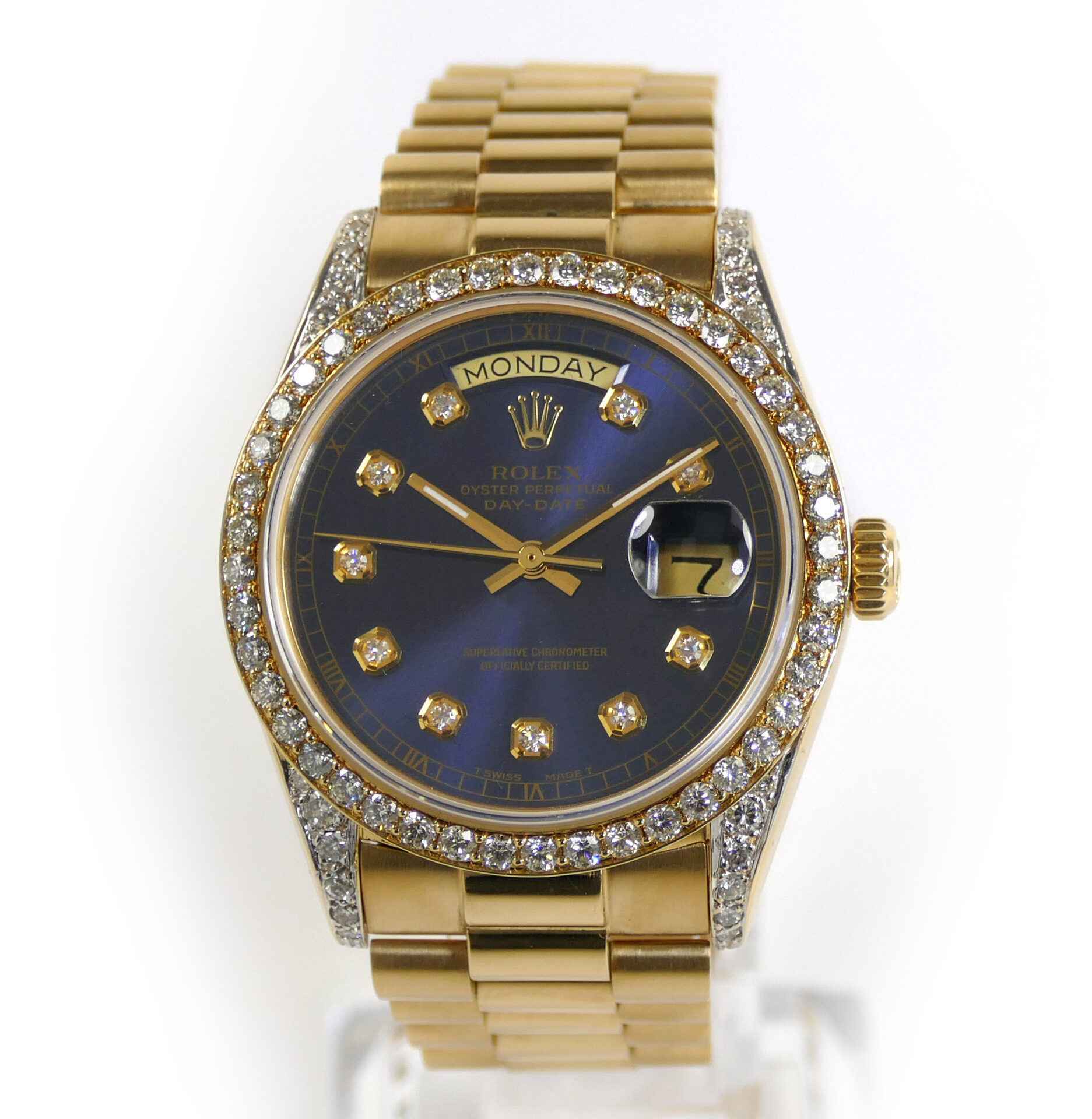 Read Morethis rolex is in excellent condition and shows minor signs of wear consistent with normal use. This watch features custom diamond lugs, bezel, and dial. The production date of this rolex is 1983 with the serial number starting in “75”. This watch is in stock and ready to ship immediately!