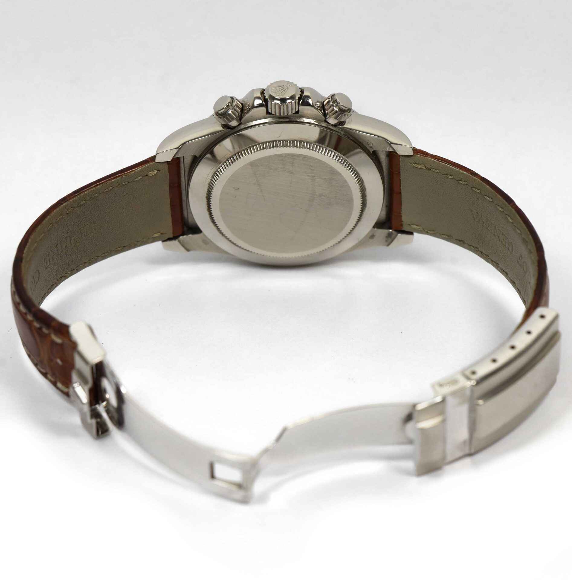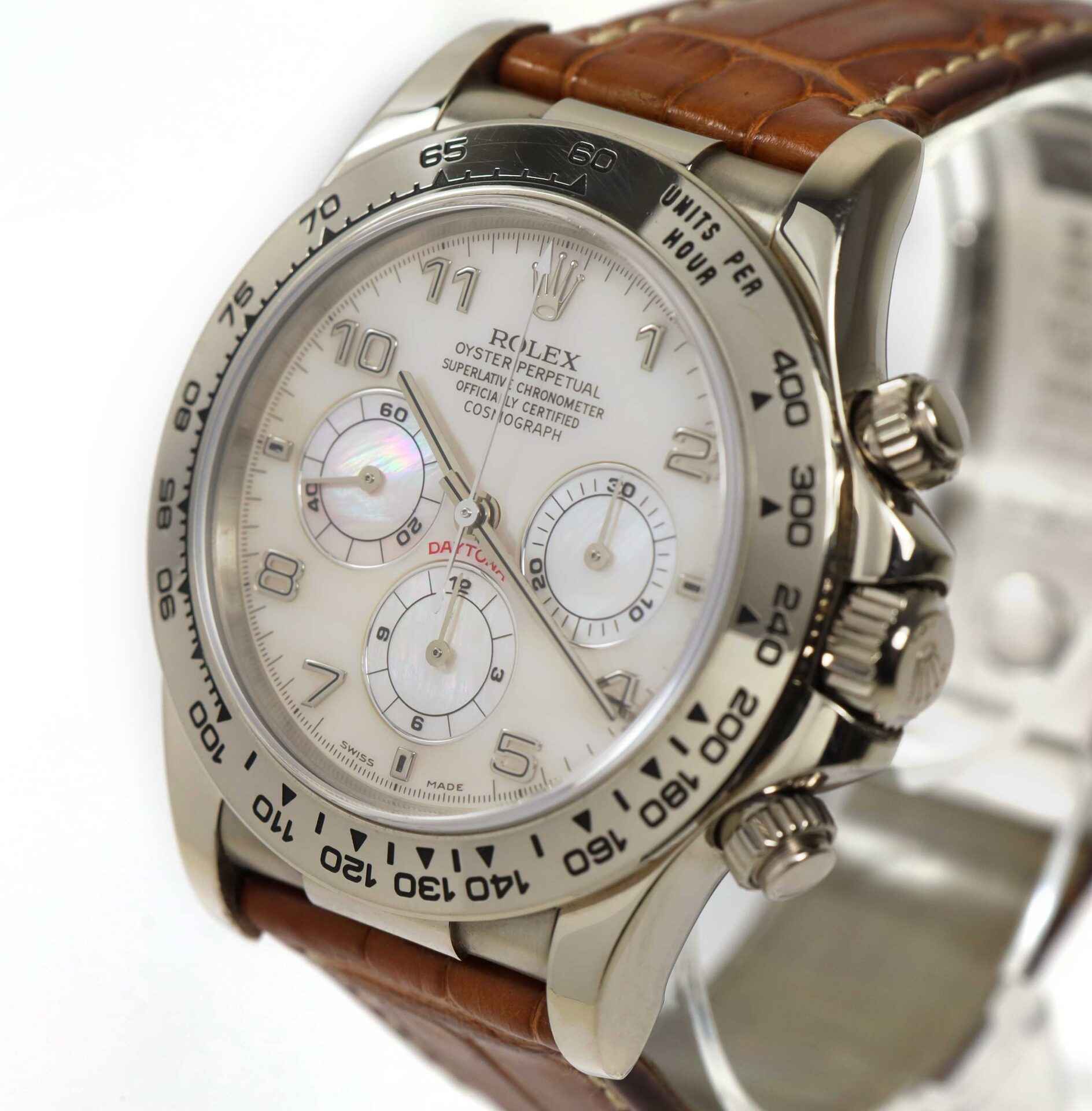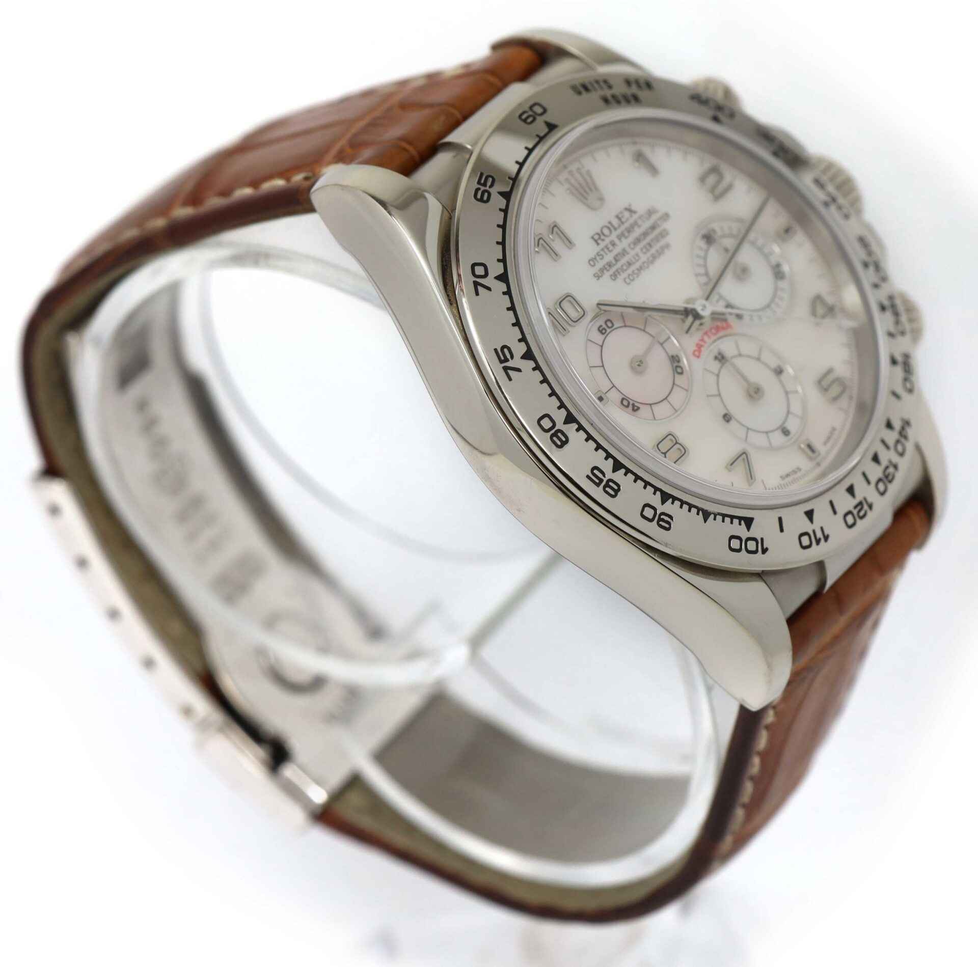 this rolex is in excellent condition and appears to be unpolished to our eyes. This watch comes as watch only as shown in the pictures attached. This watch features an 18k white gold case that surrounds a white mother of pearl dial and comes on a brown rolex strap with a white gold buckle. This watch has a serial number beginning with p which dates the year of production to be approximately 2000. This watch is in stock and available to ship immediately!