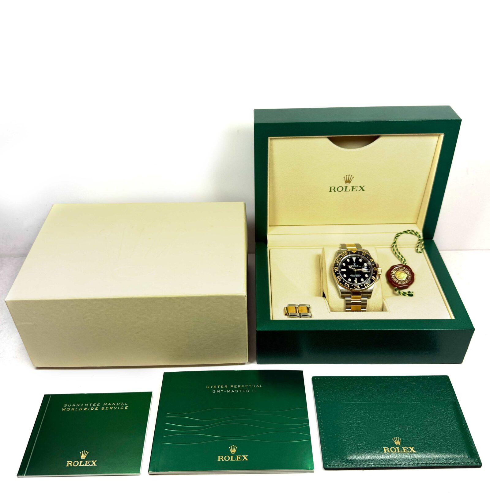 this rolex watch is in great overall condition showing some signs of surface wear consistent with preowned watches. This comes with its box, booklets, hang tag, and spare links as shown in the pictures attached. This watch is in stock and available to ship immediately!