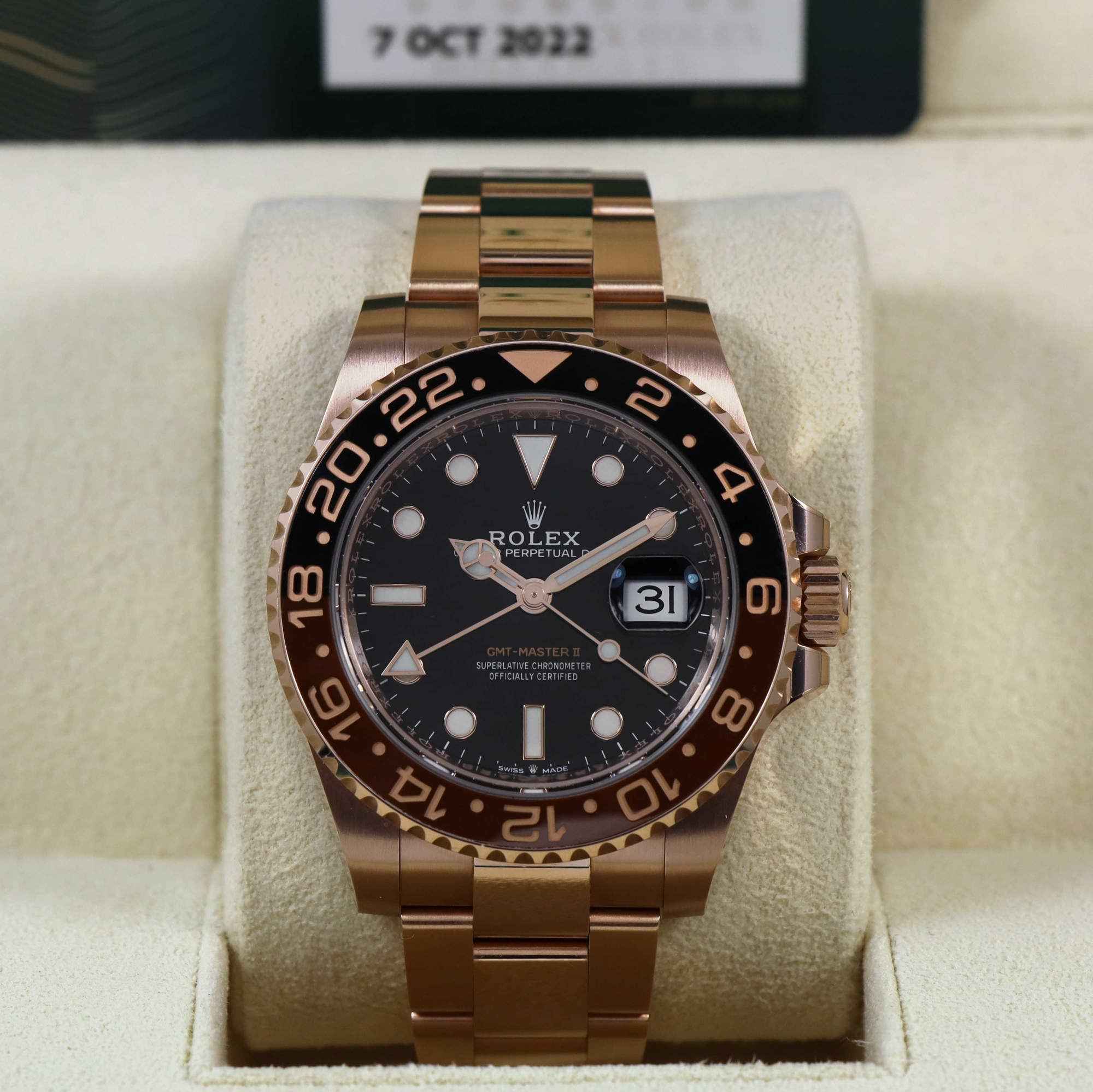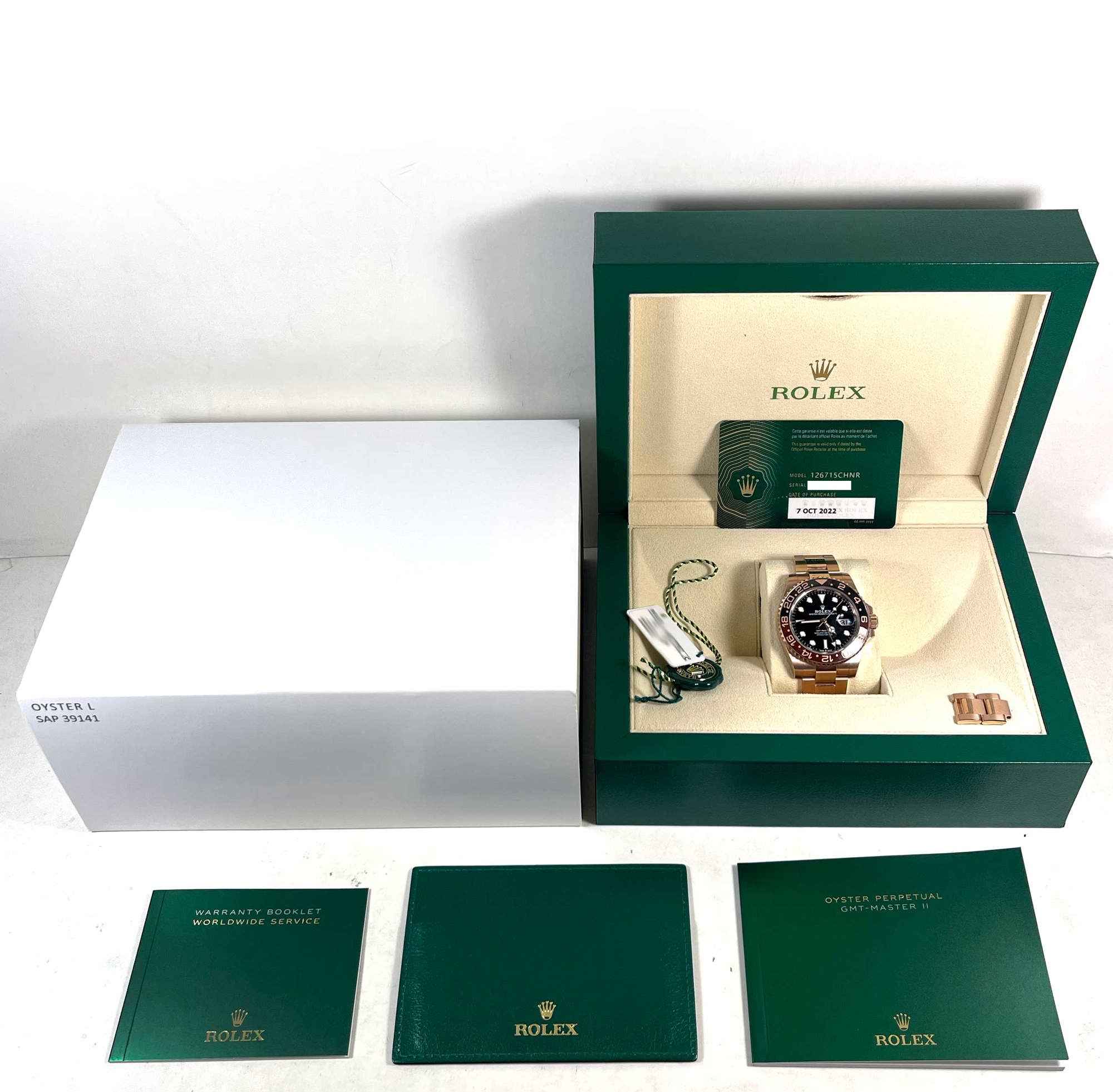this rolex watch is in super condition and comes with its box, booklets, hang tags, spare links, and warranty card dated october 7th, 2022 as shown in the pictures attached. This watch is in stock and available to ship immediately!