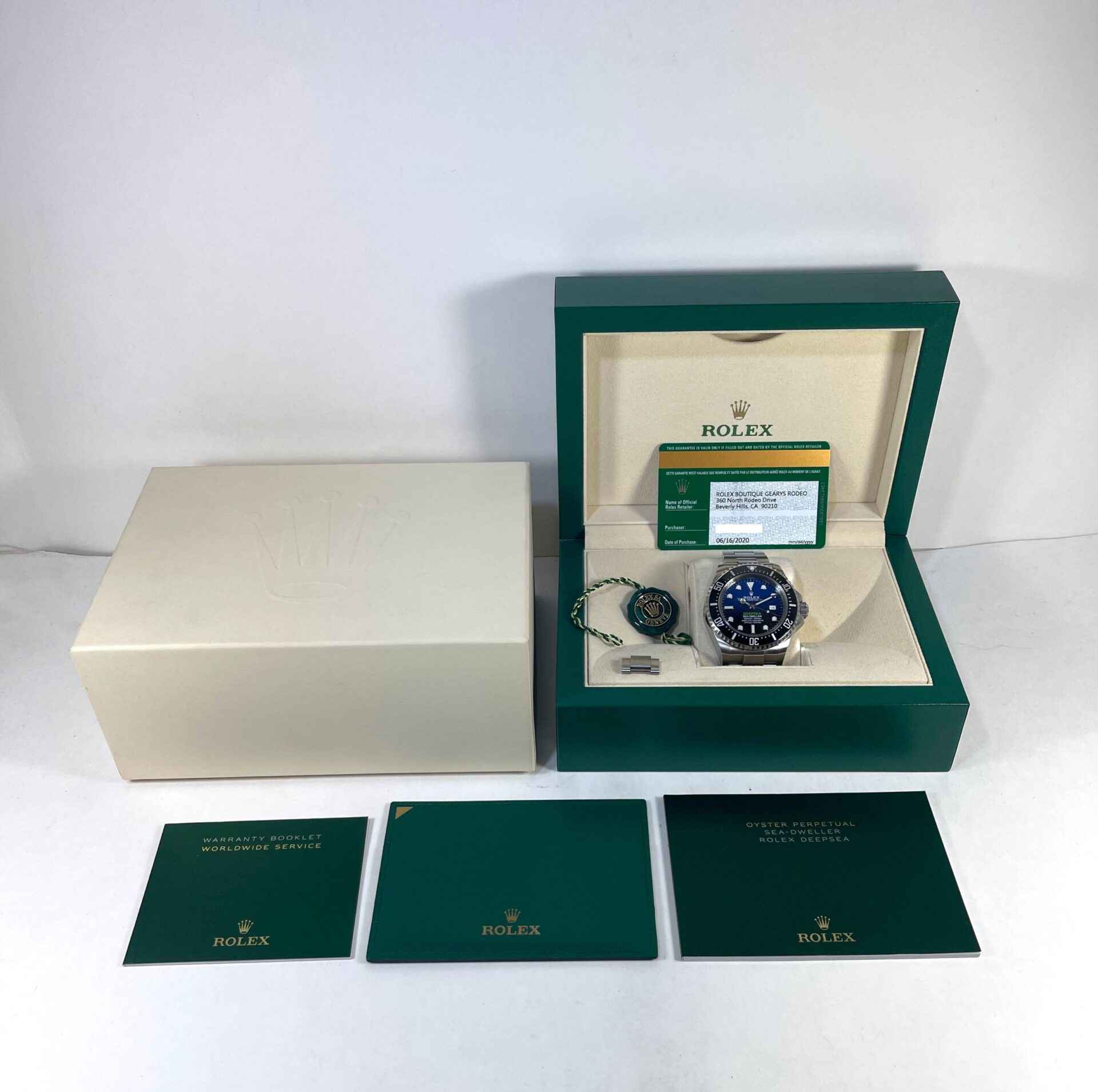 this watch is in excellent condition and comes with its original box, papers, hang tags, spare link, and warranty card dated june 16th, 2020. This watch is in stock and available to ship immediately.