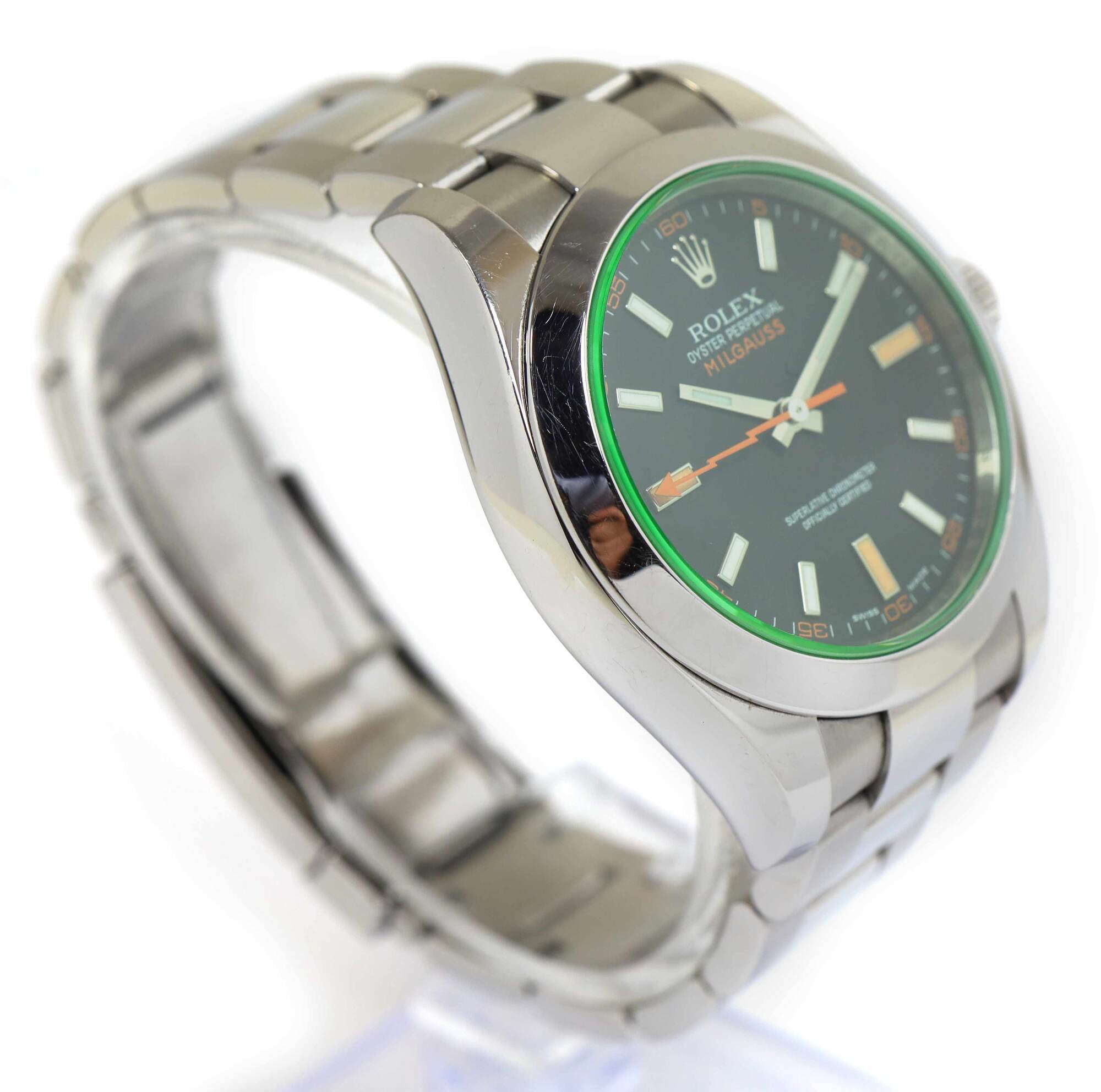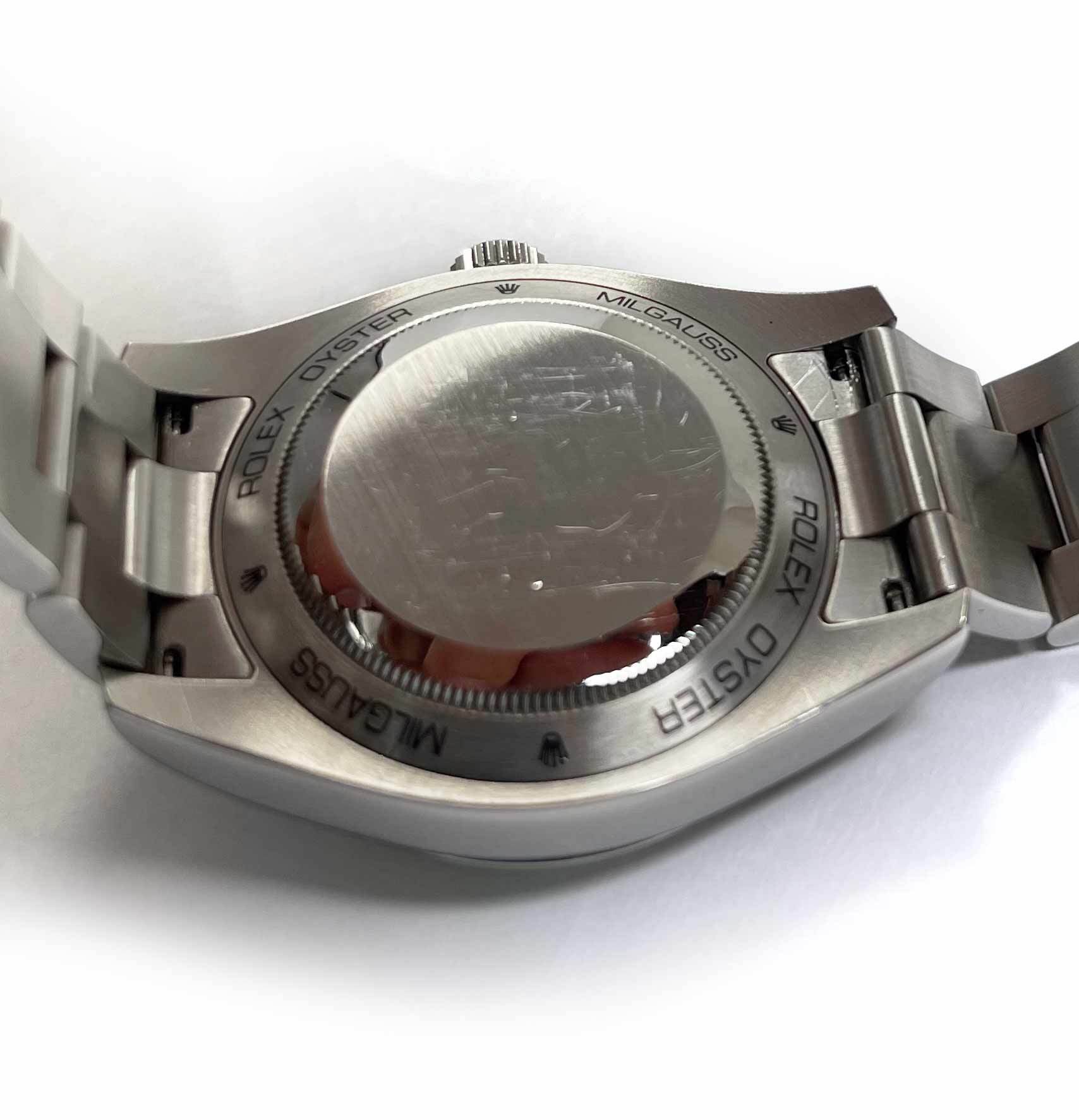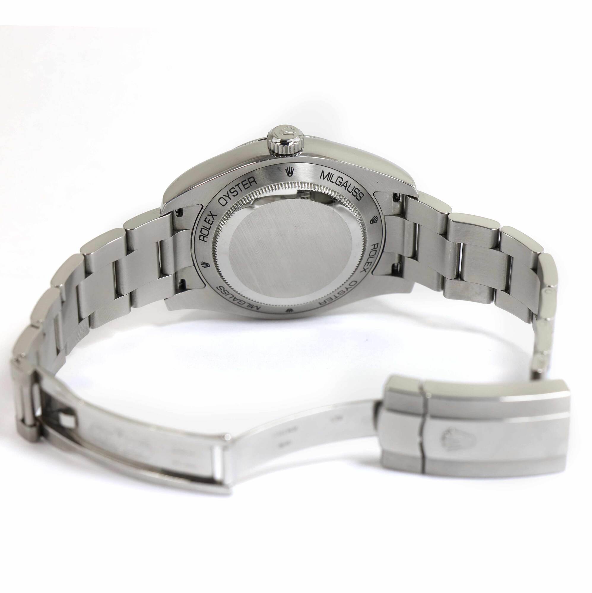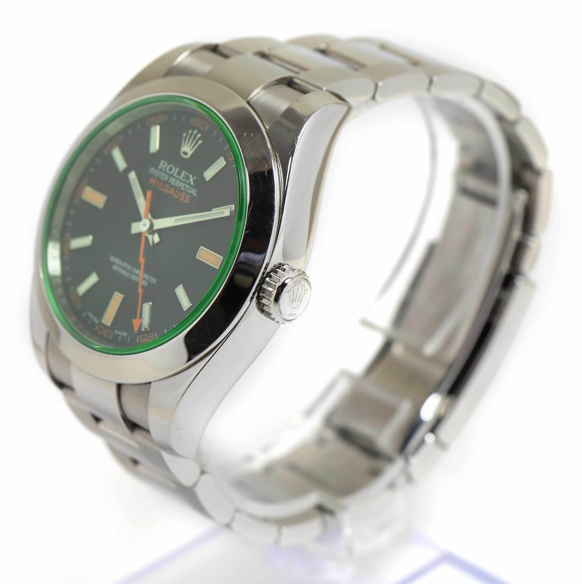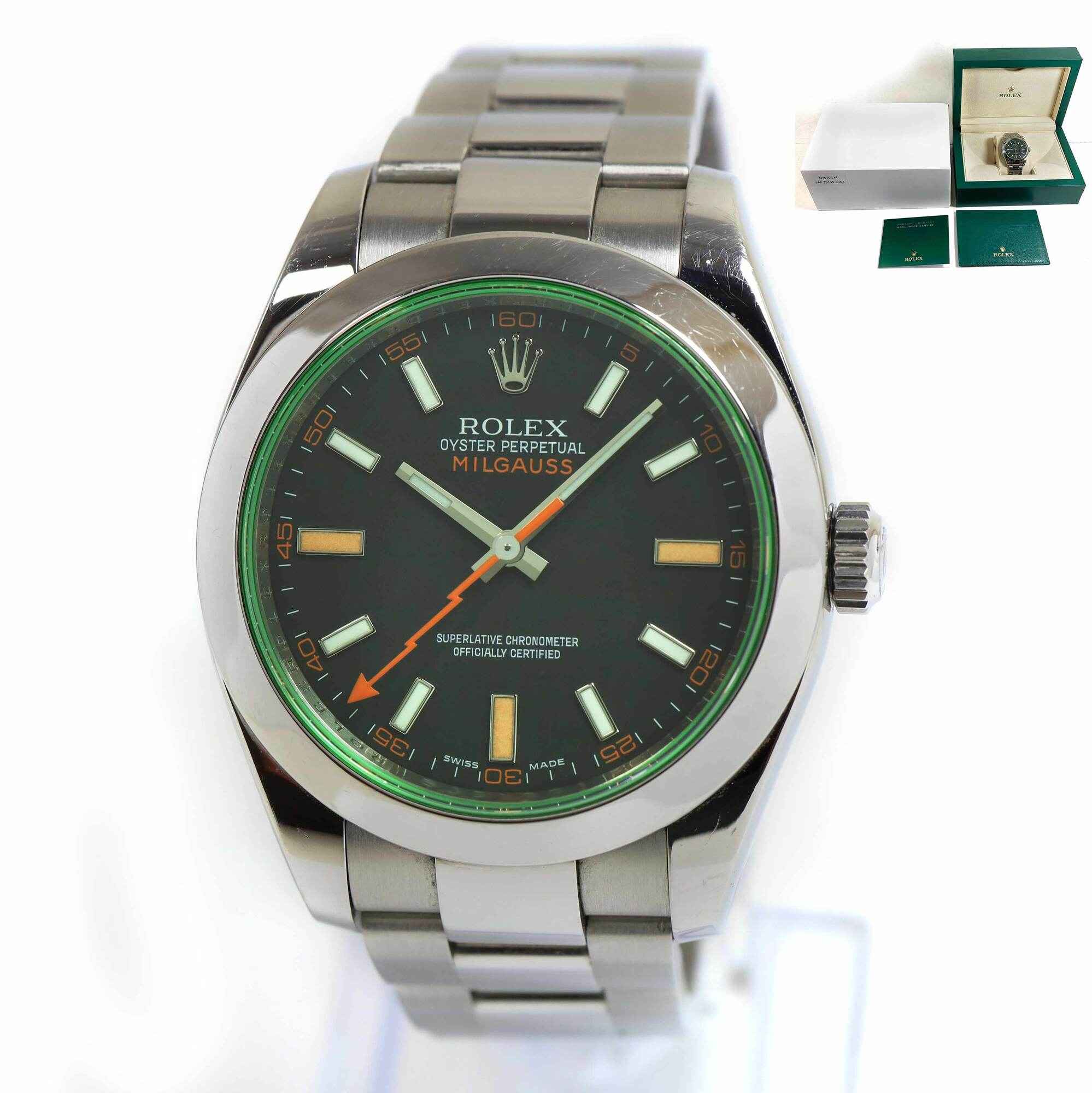 THIS ROLEX MILGAUSS IS IN GOOD OVERALL CONDITION SHOWING SIGNS OF WEAR CONSISTENT WITH PREOWNED WATCHES. THIS COMES WITH ITS BOX AND BOOKLETS ONLY AND IS IN STOCK AND AVAILABLE TO SHIP IMMEDIATELY!