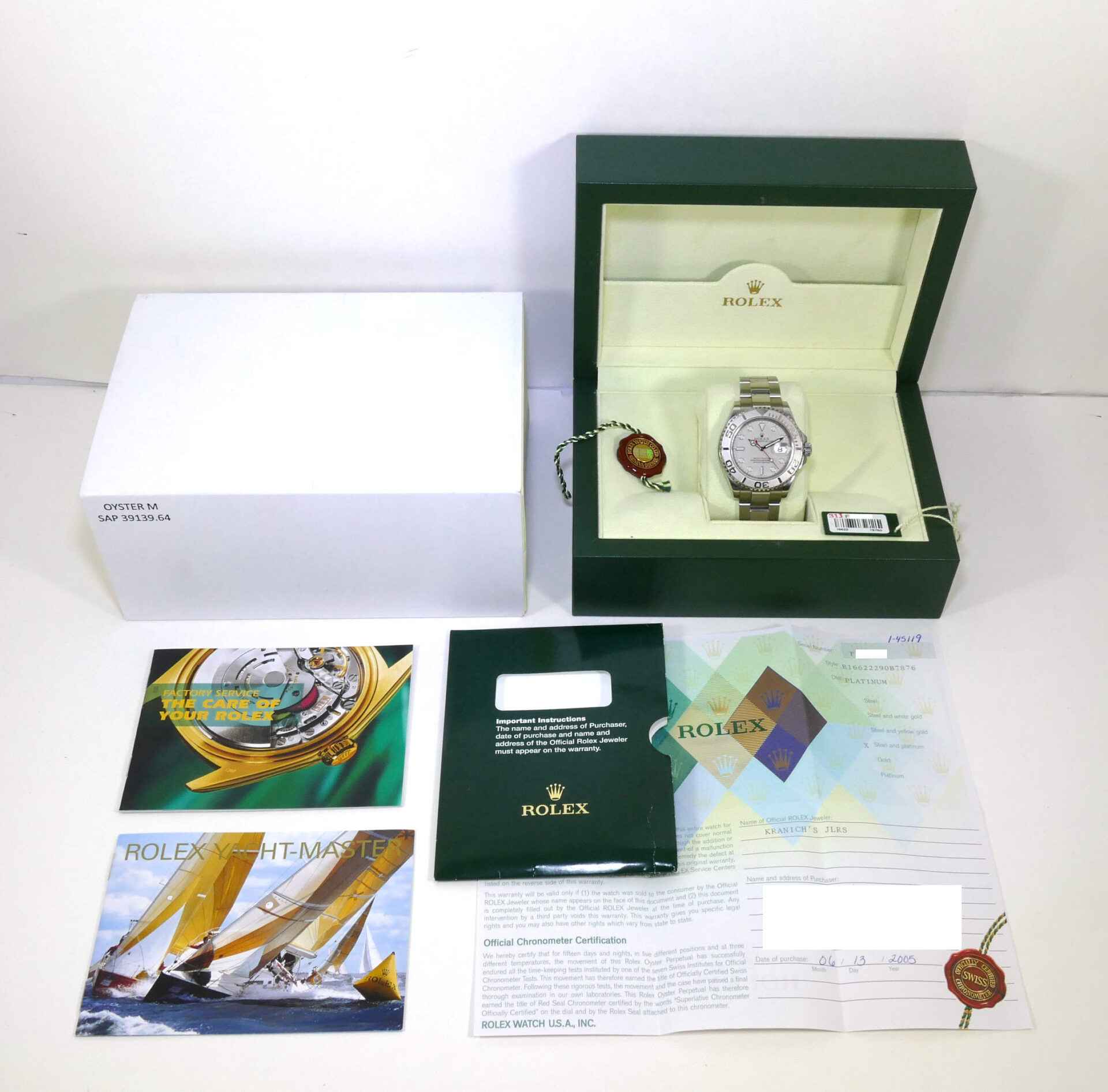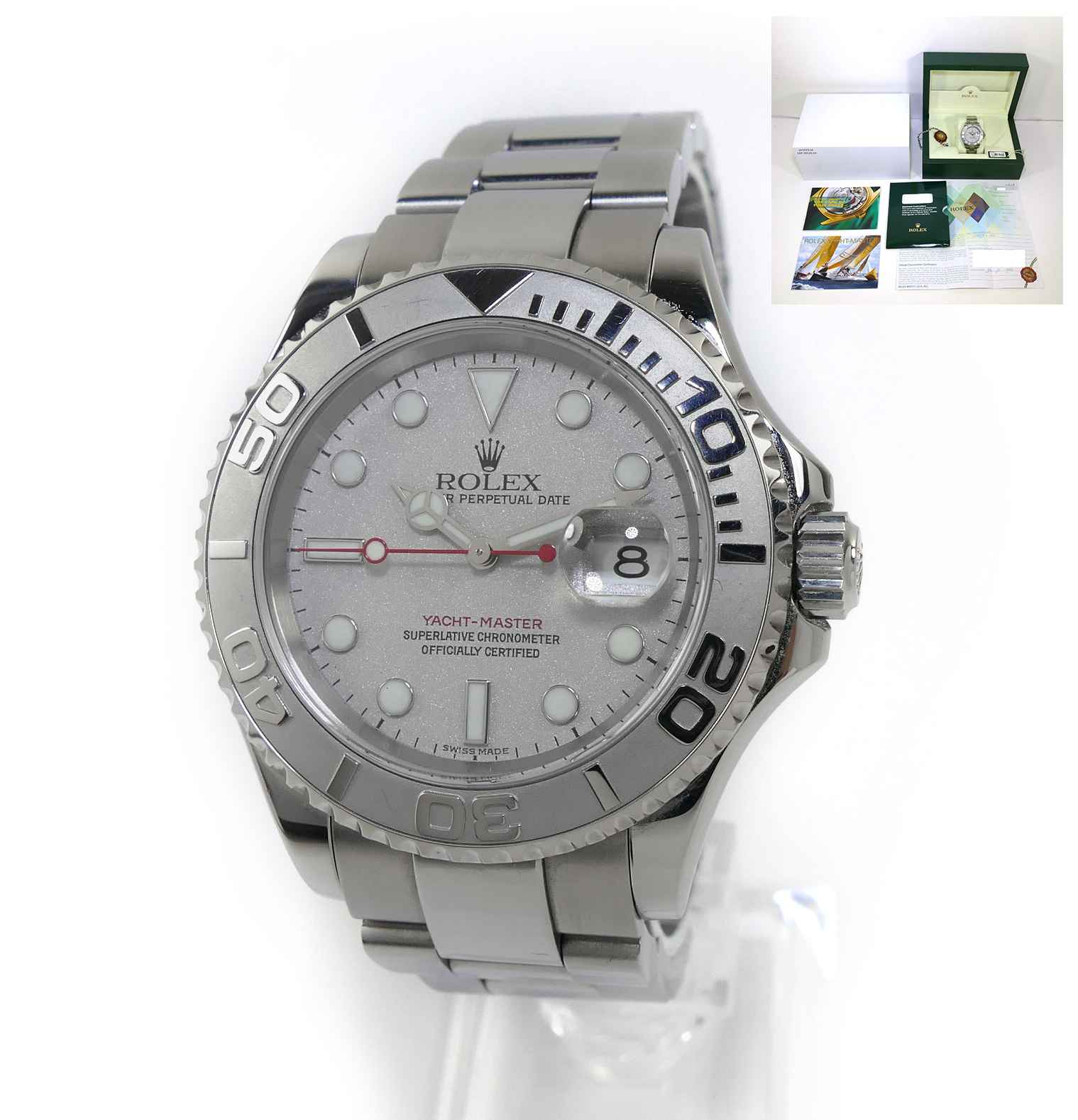 this rolex yacht-master is in excellent condition and comes with box, papers, hang tags, and warranty papers dated june 13th, 2005. This watch is in stock and available to ship immediately!