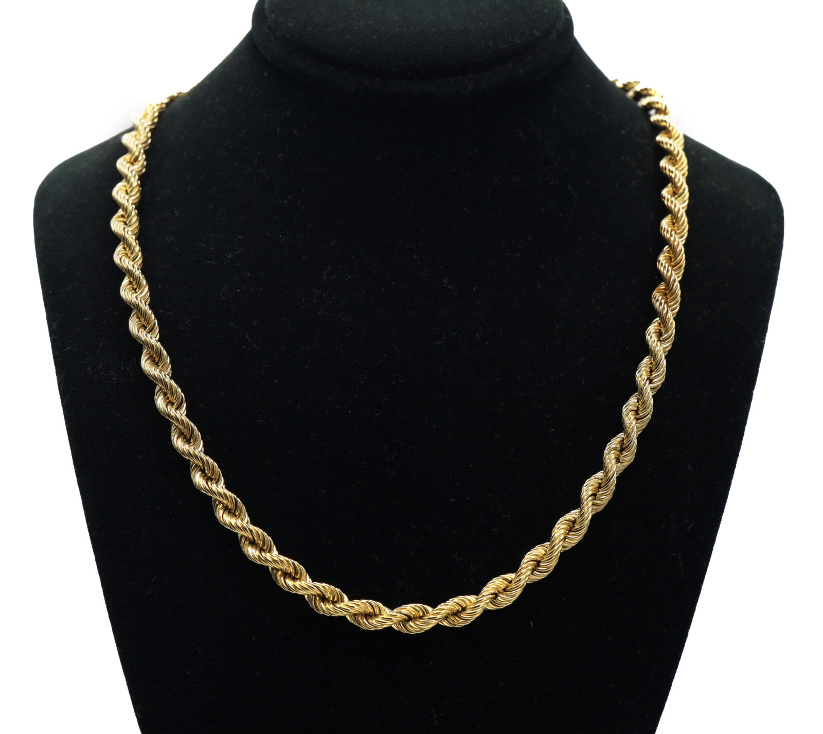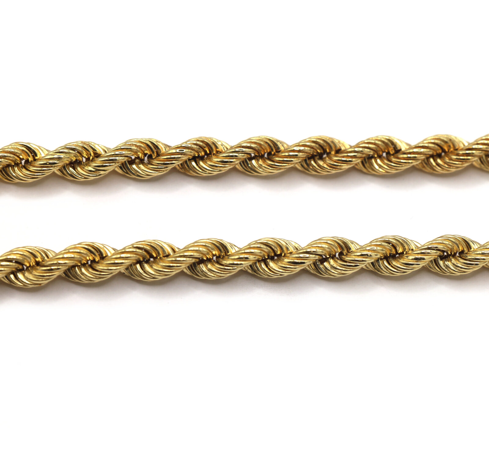 Material: 18k Yellow Gold Type: Rope Link Length: 24 Inches Width: 5mm Weight: 14.5 Grams