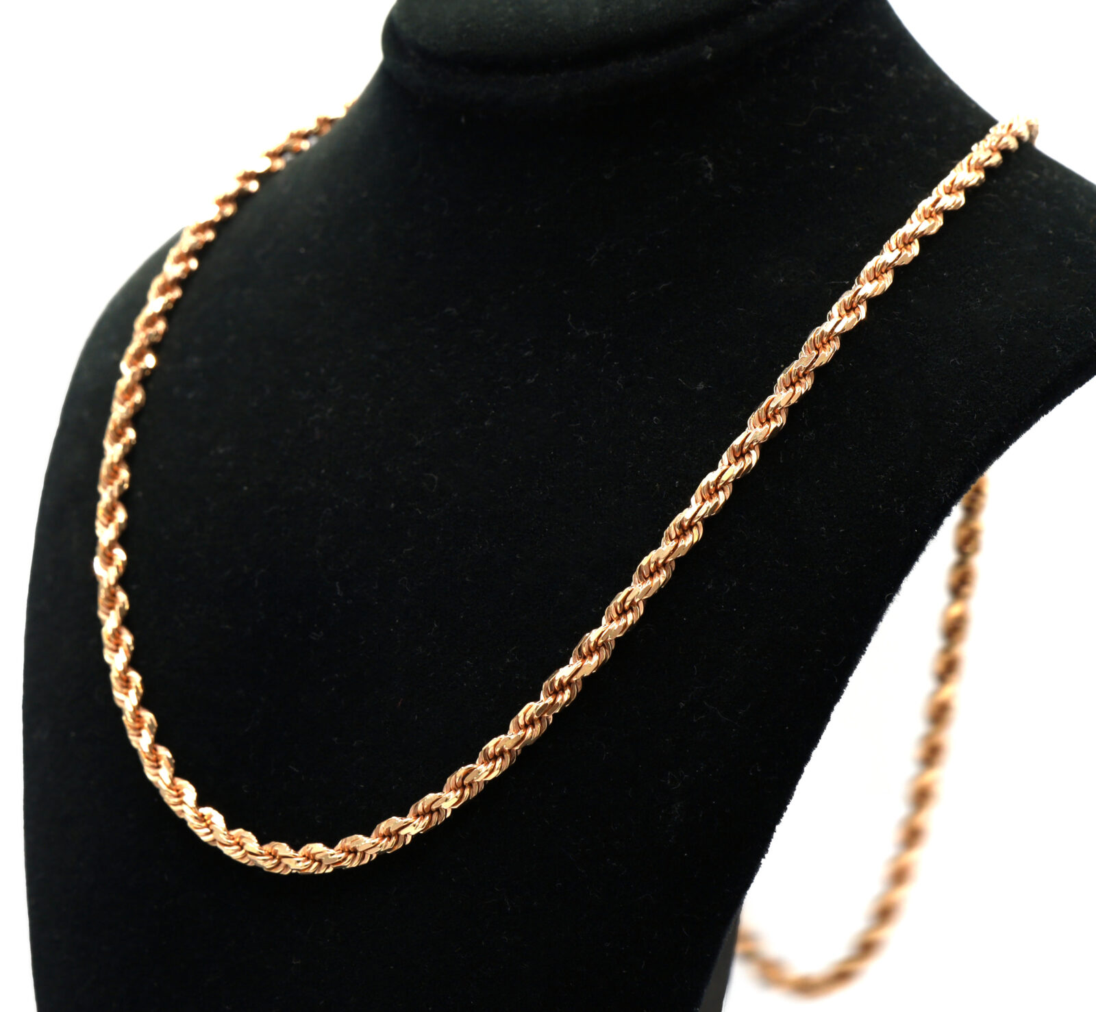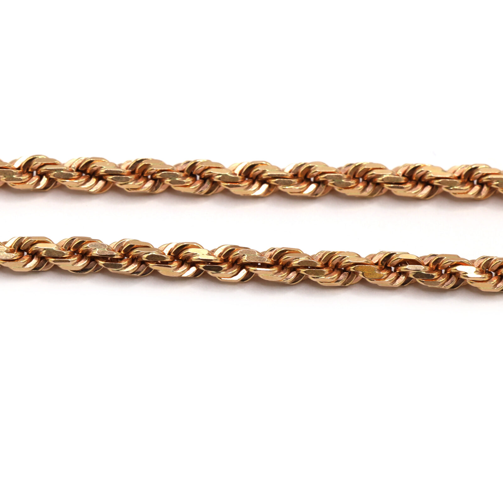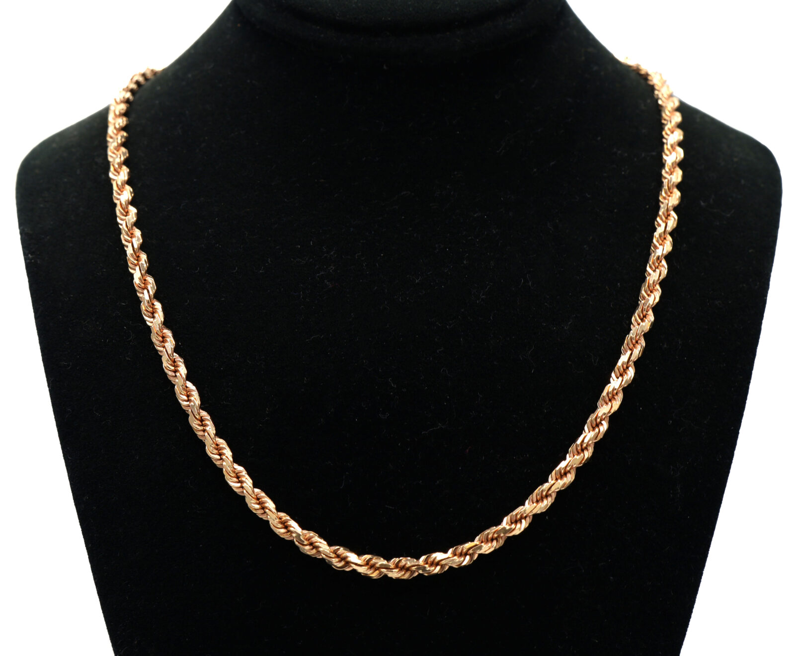 Material: 14k Rose Gold Type: Rope Link Length: 22 Inches Width: 3.4mm Weight: 24.8 Grams