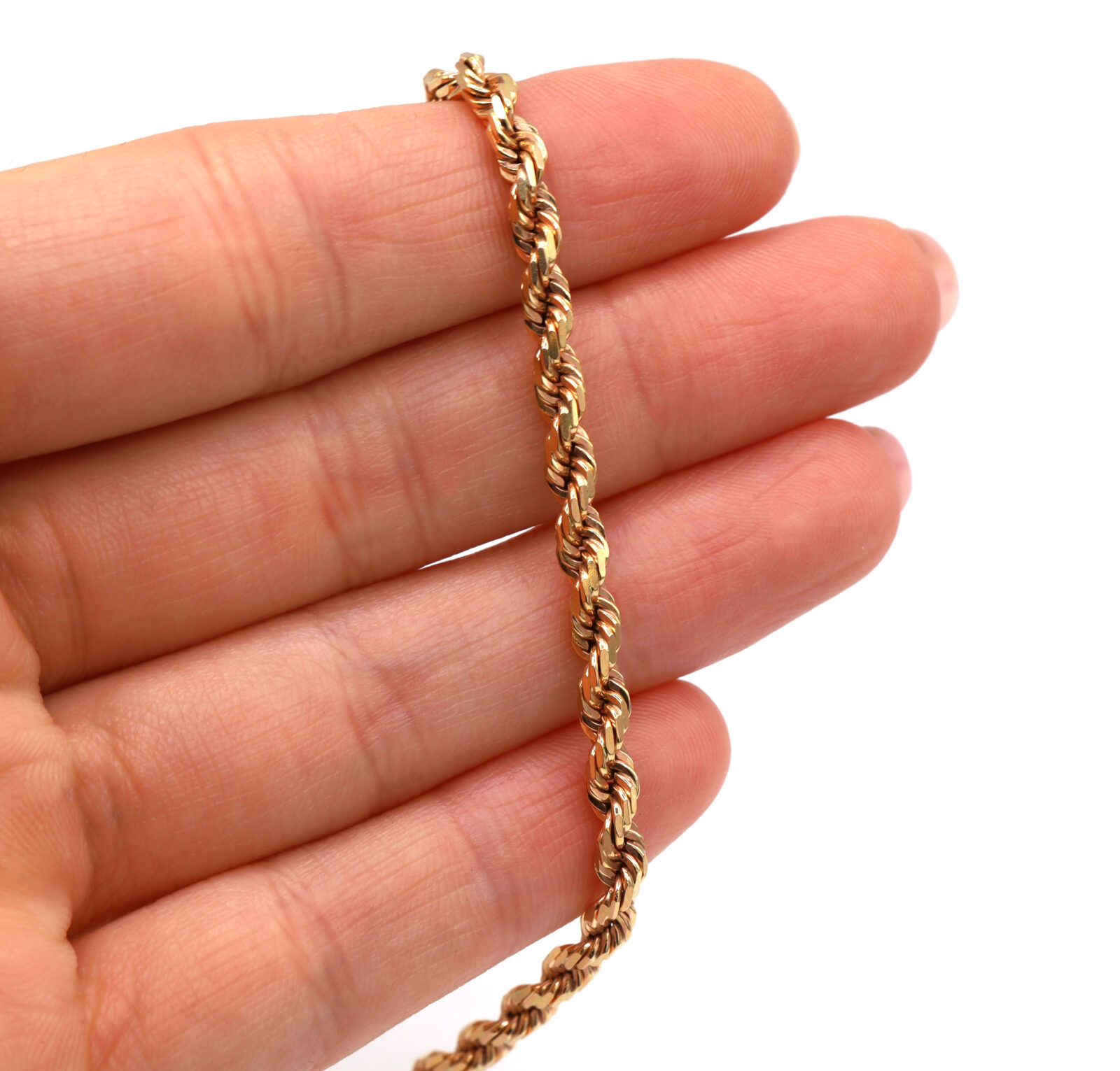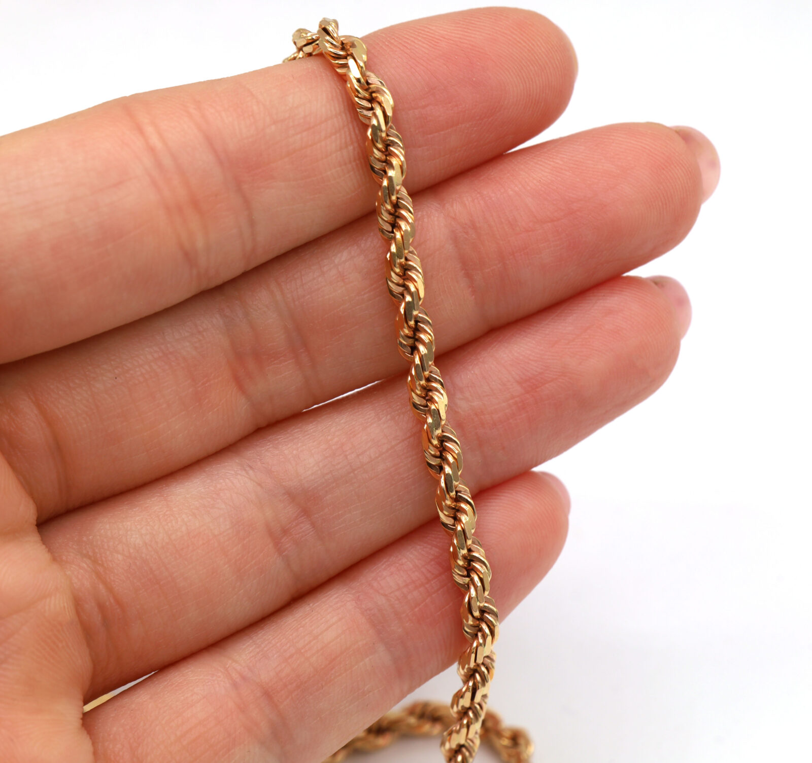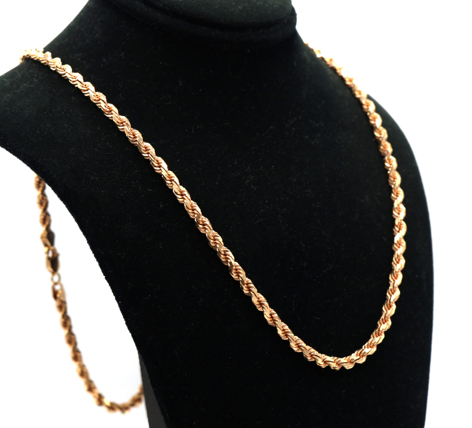 Material: 14k Rose Gold Type: Rope Link Length: 22 Inches Width: 3.4mm Weight: 24.8 Grams