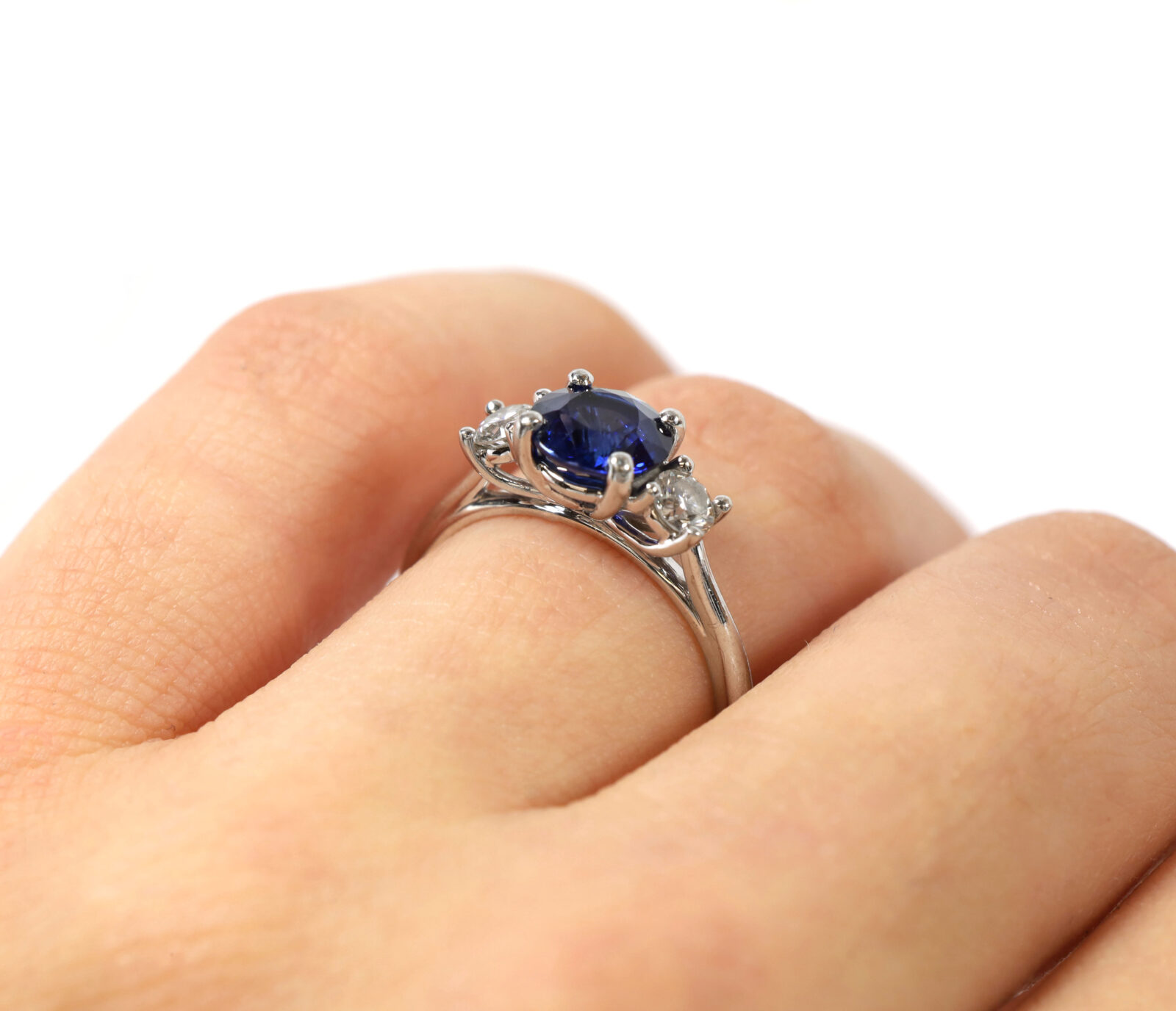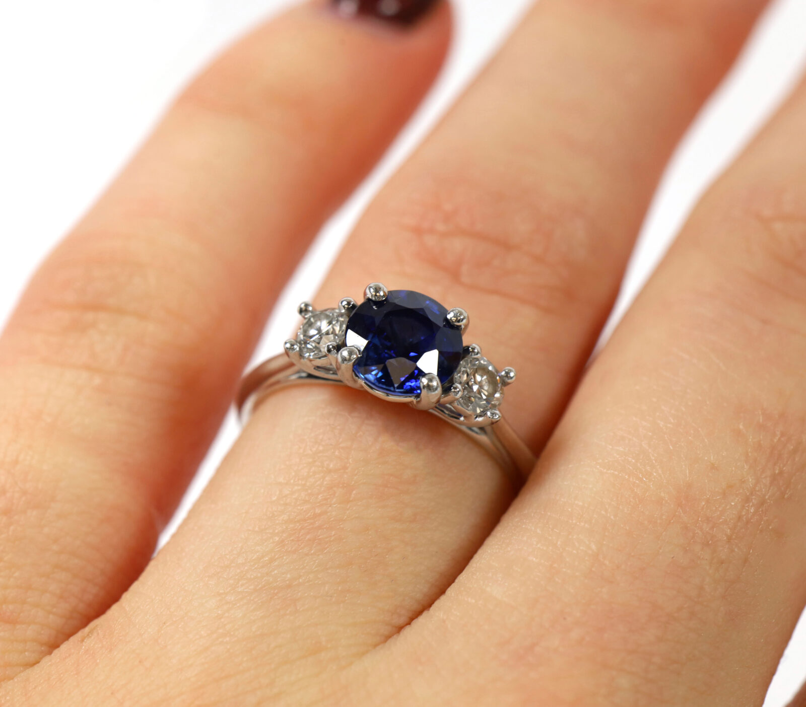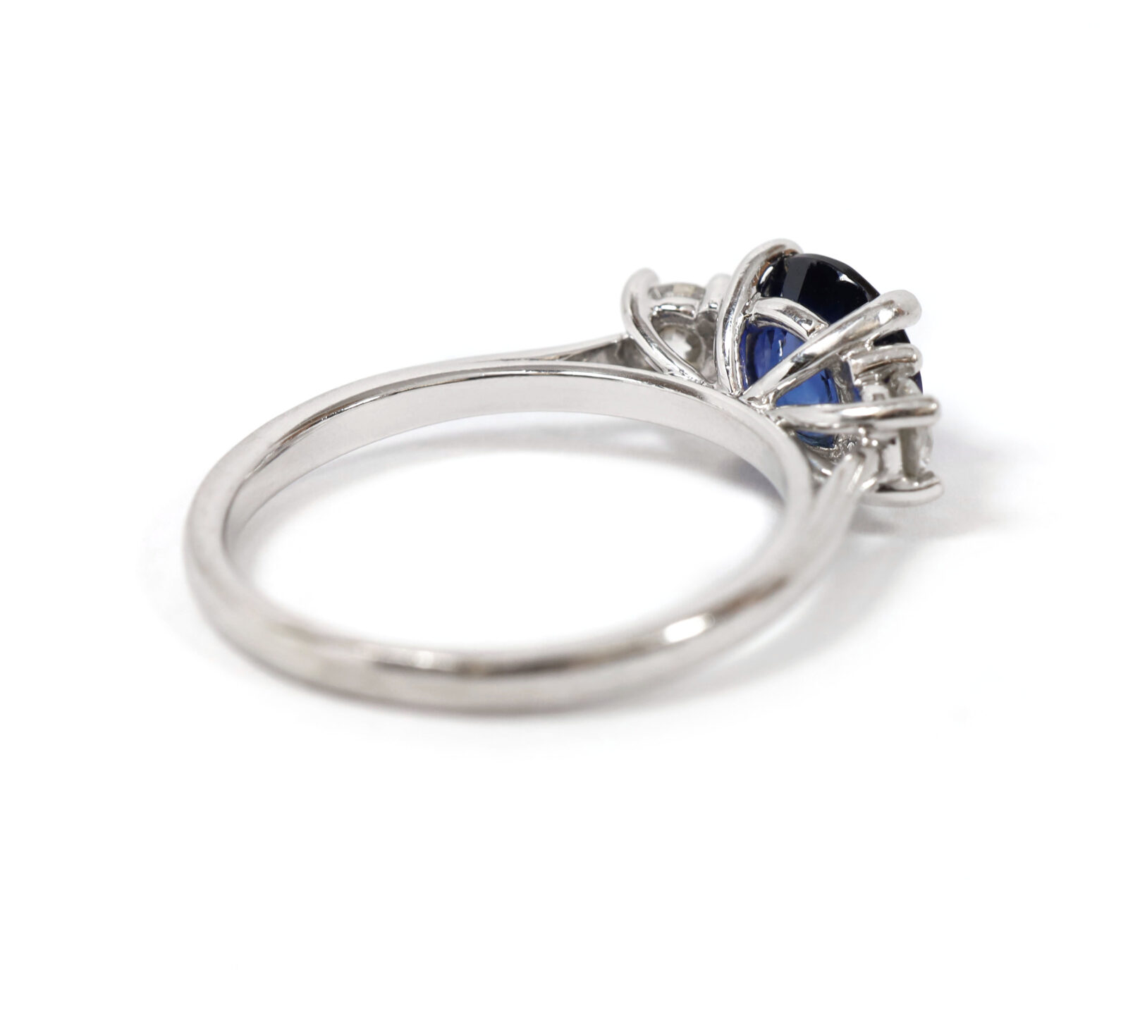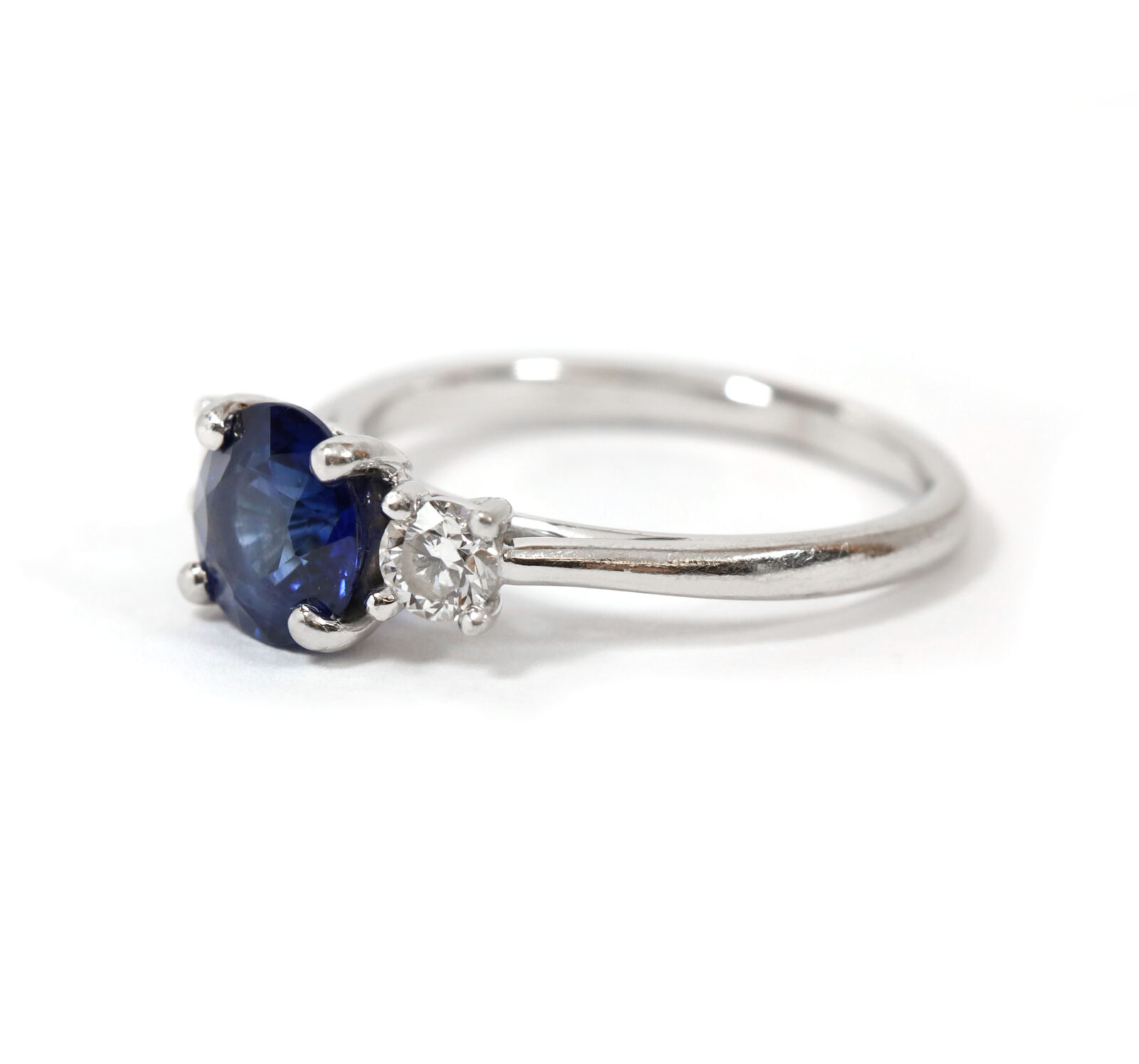 metal: 18k white gold width: 2mm size: 5.75 center gemstone: sapphire carat weight total: 1.30 carat cut: round side stone gemstone: diamond carat weight: 0.33 carat clarity: si1 color: g/h