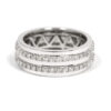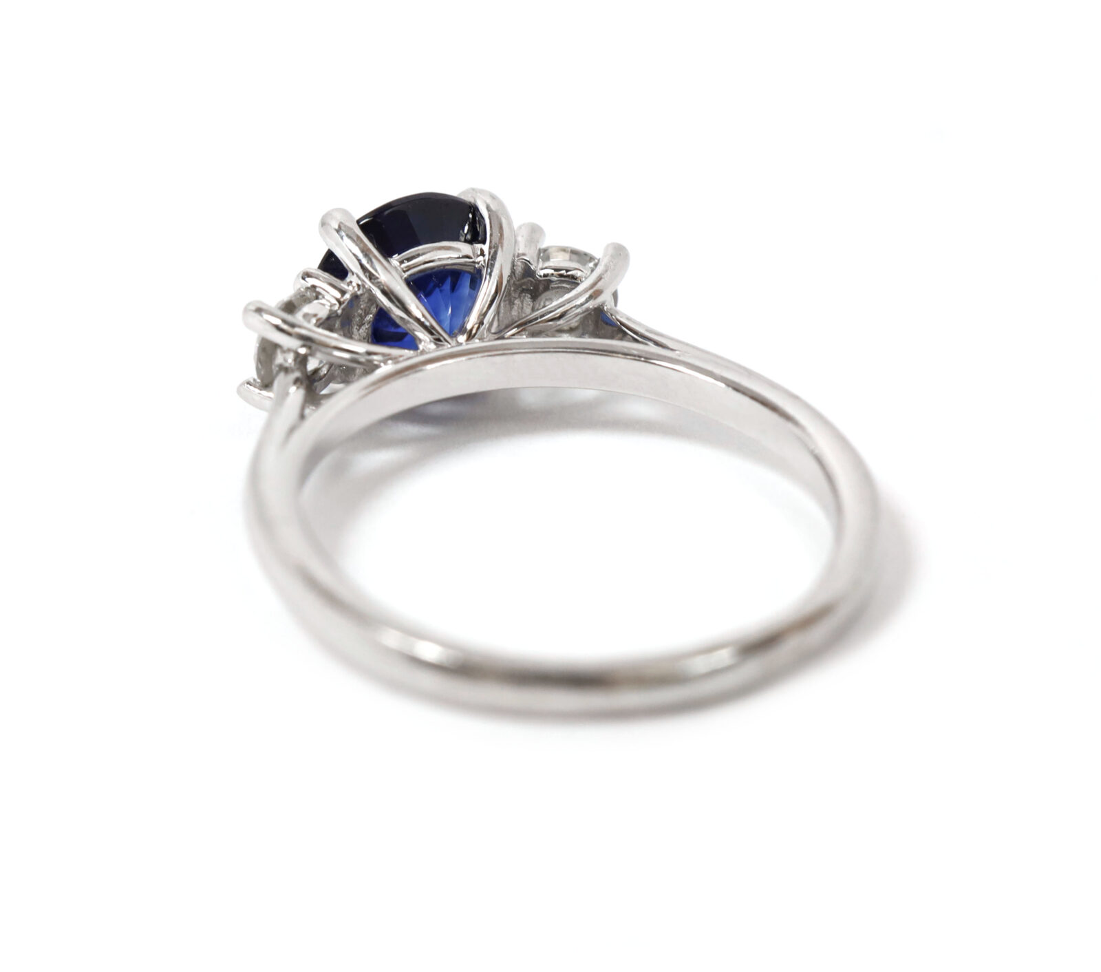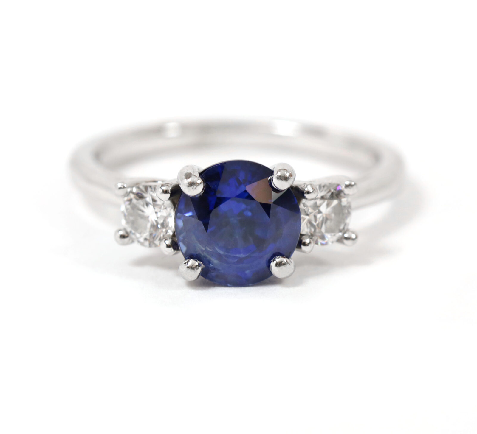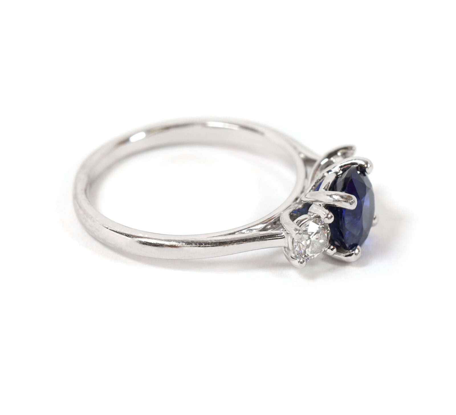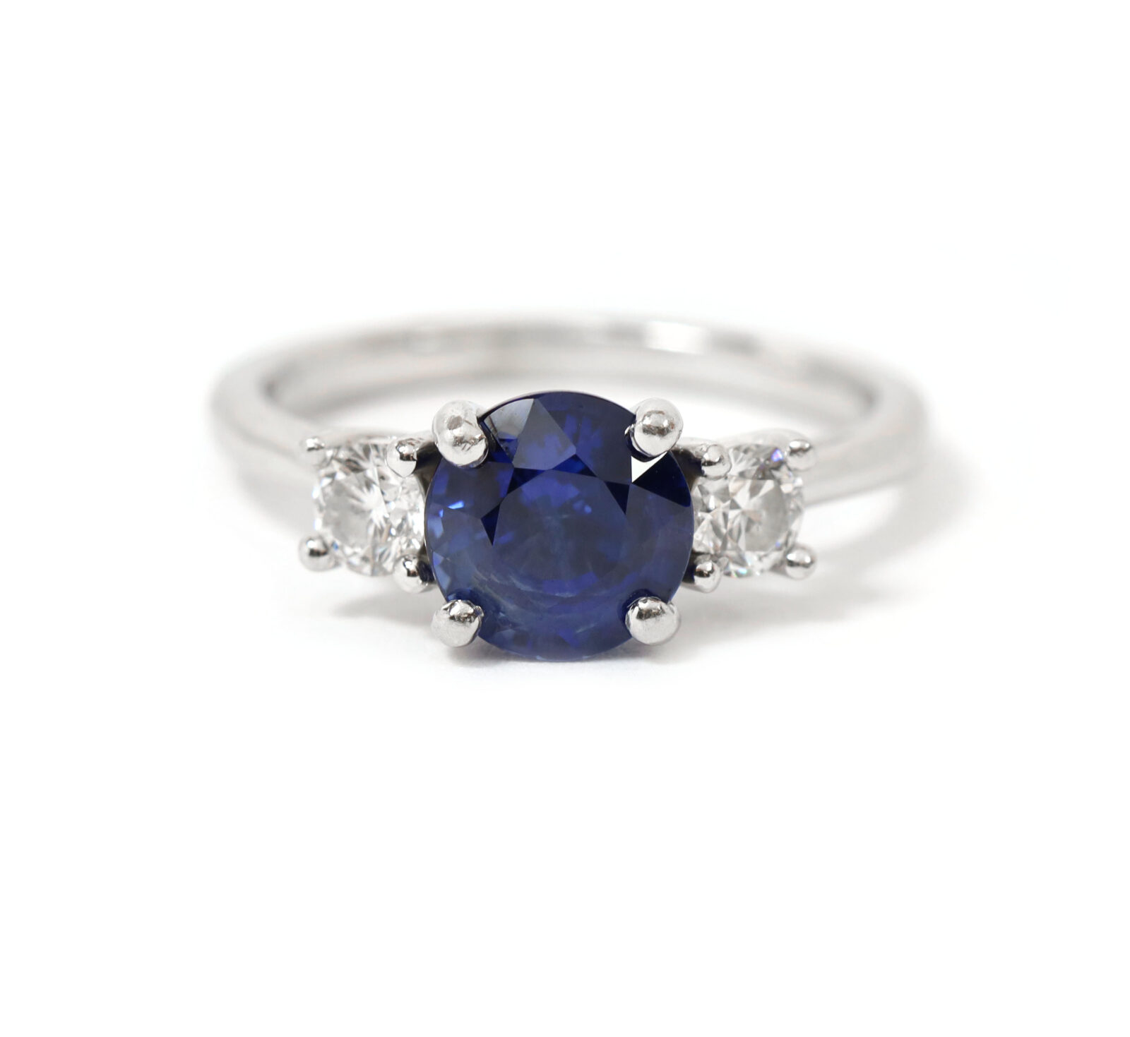 metal: 18k white gold width: 2mm size: 5.75 center gemstone: sapphire carat weight total: 1.30 carat cut: round side stone gemstone: diamond carat weight: 0.33 carat clarity: si1 color: g/h