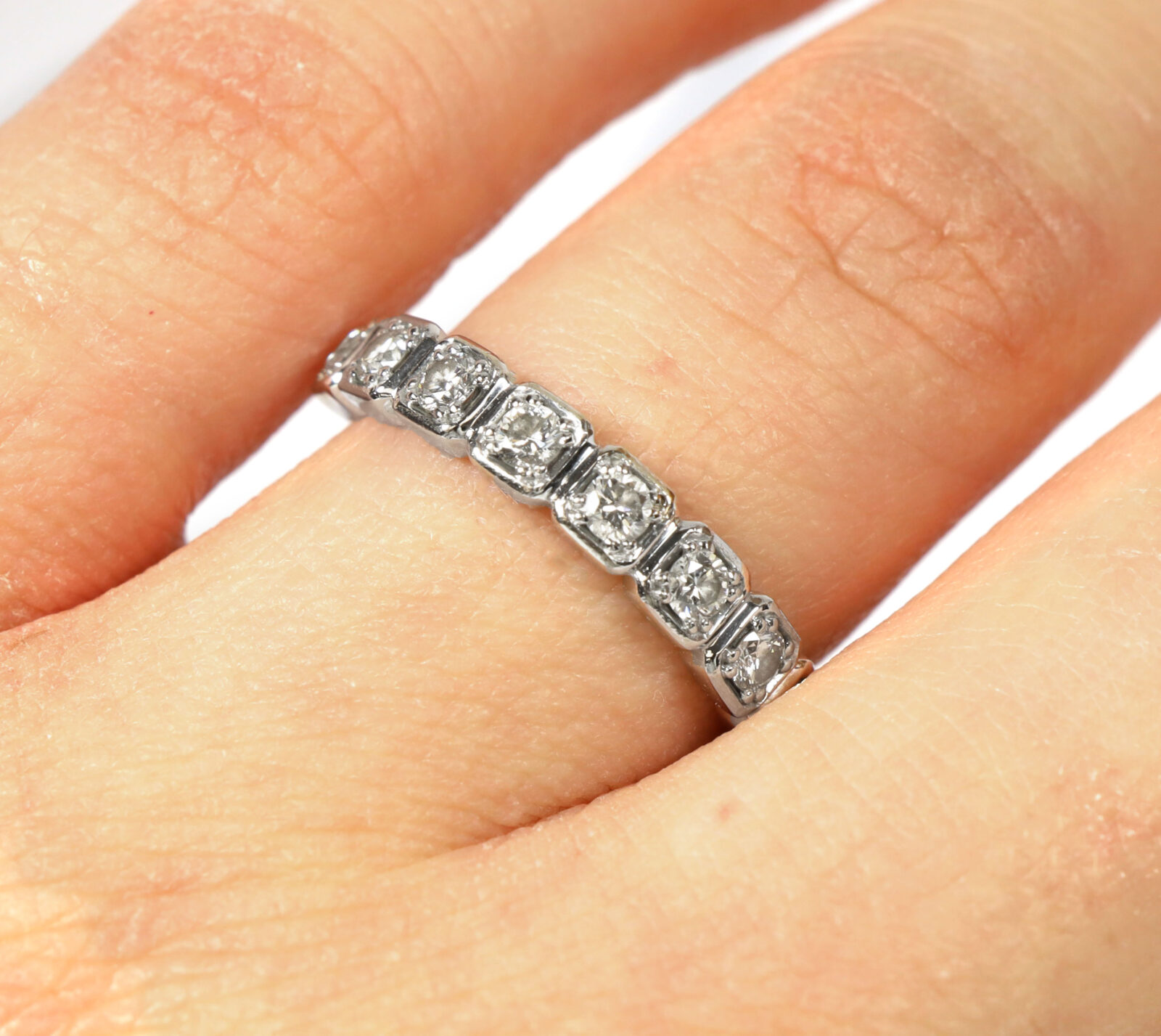 Metal: 14k White Gold Width: 3.6mm Size: 6.75 Gemstone: Diamond Carat Weight: Approximately 0.45 Carat Color: I Clarity: SI1/SI2 Cut: Round