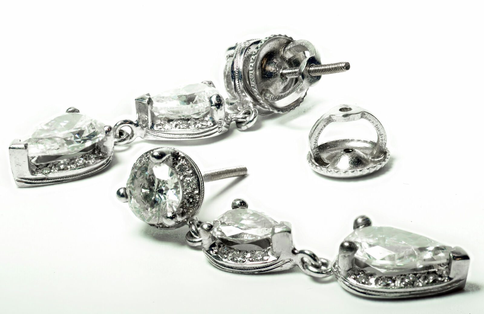 Round & Pear Diamond Dangle Earrings in 18k White Gold (3.2 ct TDW, SI1/SI2 Clar